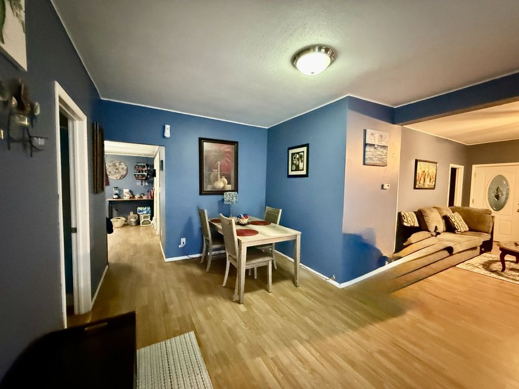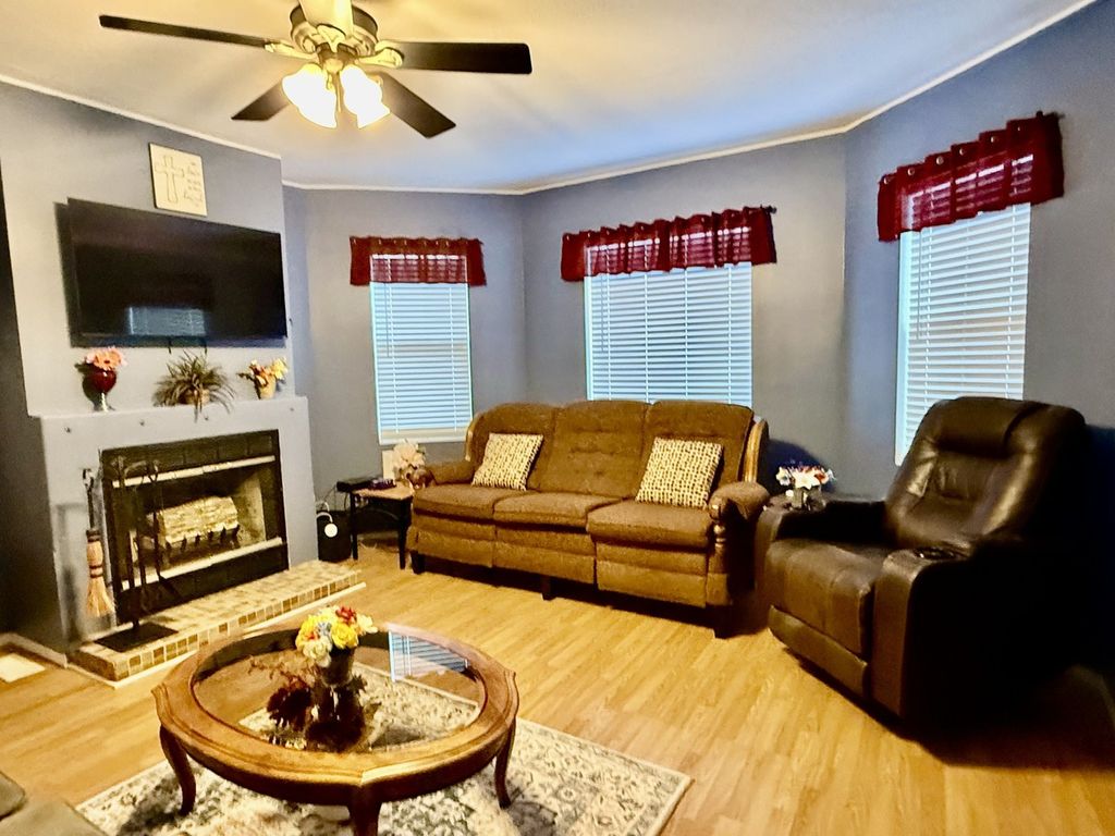 Neat and clean two-bedroom, two-bath home situated on a corner lot. Step inside warm and welcoming entryway opens to a lovely and comfortable living room featuring a wood-burning fireplace (seller has never used). Large eat-in kitchen with plenty of cabinets, stove and refrigerator included. Separate spacious dining room. The primary bedroom offers an en suite bathroom with a walk-in shower. Convenient main-level laundry with the washer and dryer included. Enjoy additional space in the enclosed porch. Newer windows. Off-street parking and a storage shed. Move in ready! Table in kitchen in the corner and hanging wine rack in kitchen can stay.