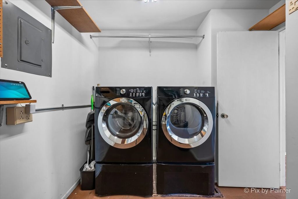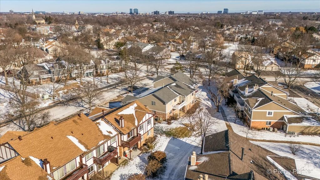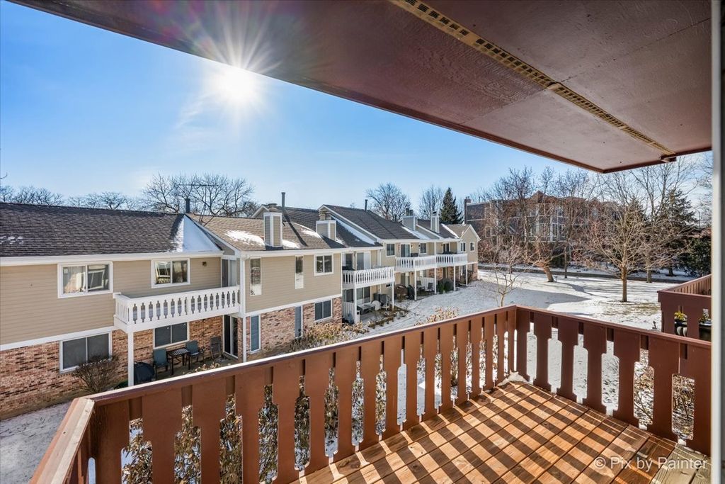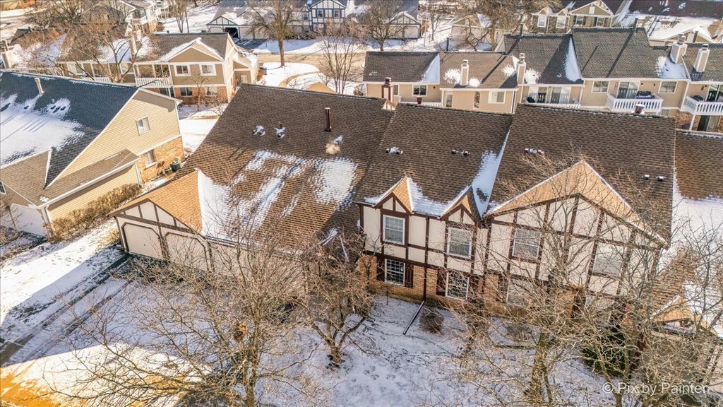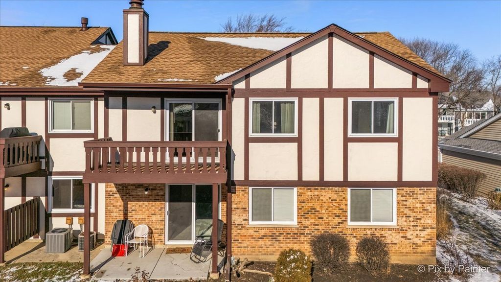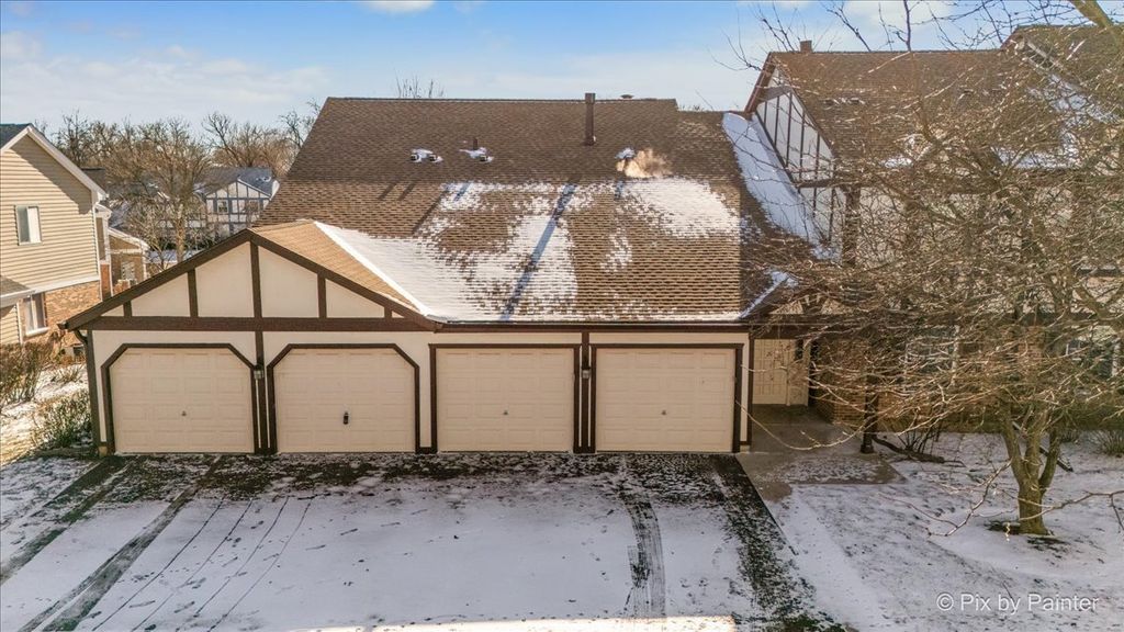 This beautiful second-level corner unit is filled with natural light and features dramatic vaulted ceilings in this rarely available expanded ranch-style condo. The inviting living space includes a cozy wood-burning fireplace and a spacious dining area, perfect for both everyday living and entertaining. The generously sized one-bedroom layout offers a large walk-in closet, an in unit laundry room with a full-size washer and dryer, and abundant storage throughout. Enjoy a south-facing balcony ideal for relaxing, along with the convenience of an attached one car garage. Original windows have been replaced with quality Pella windows, providing enhanced comfort and energy efficiency. Summers are a breeze with access to the nearby community pool and clubhouse. Ideally located in the heart of Schaumburg, just steps from Town Square, the Schaumburg Library, the prairie art center and a wide variety of shops and restaurants, this home delivers both comfort and unbeatable convenience.