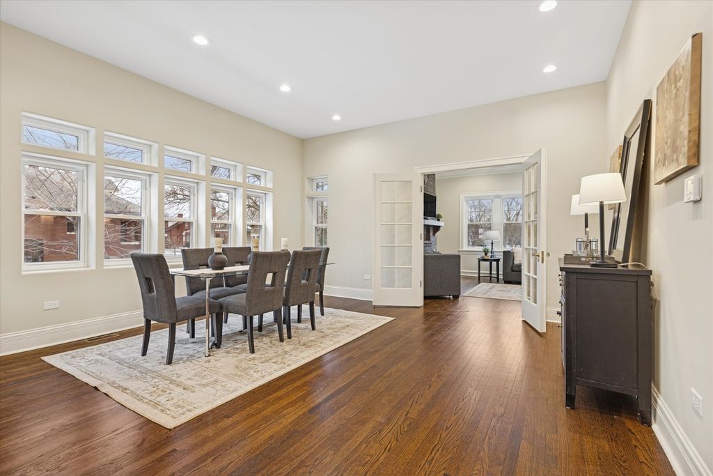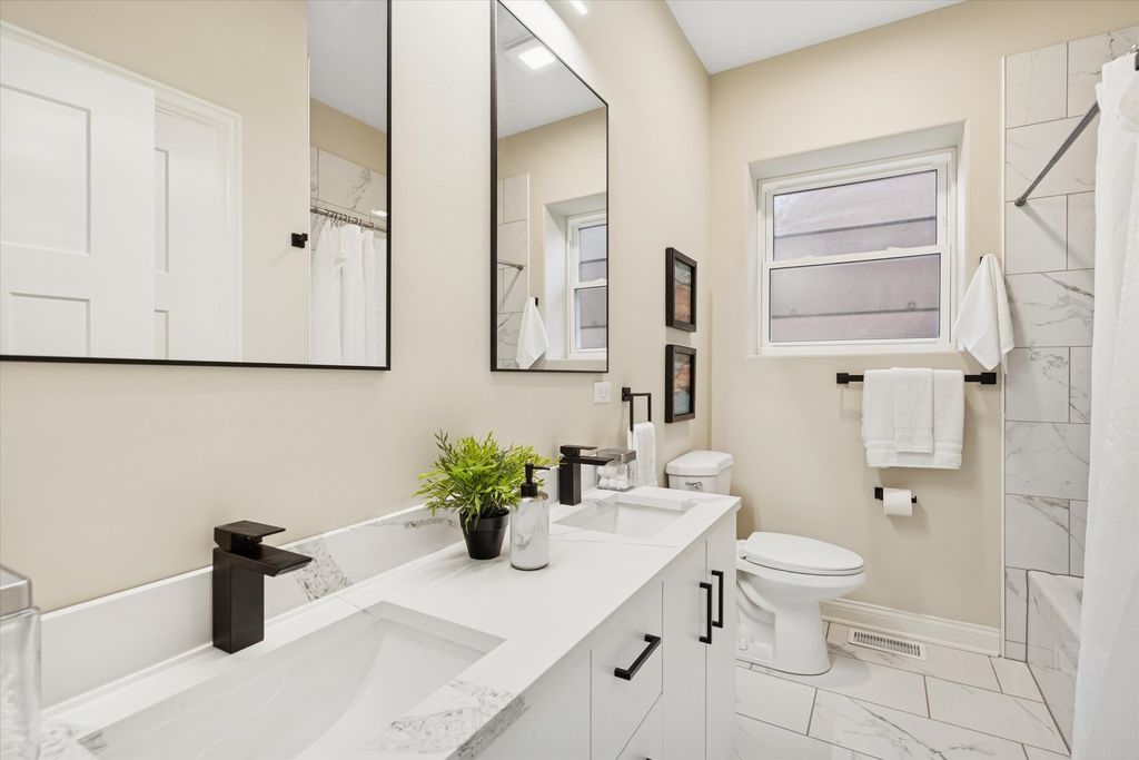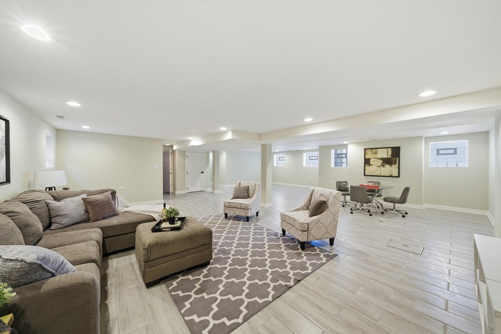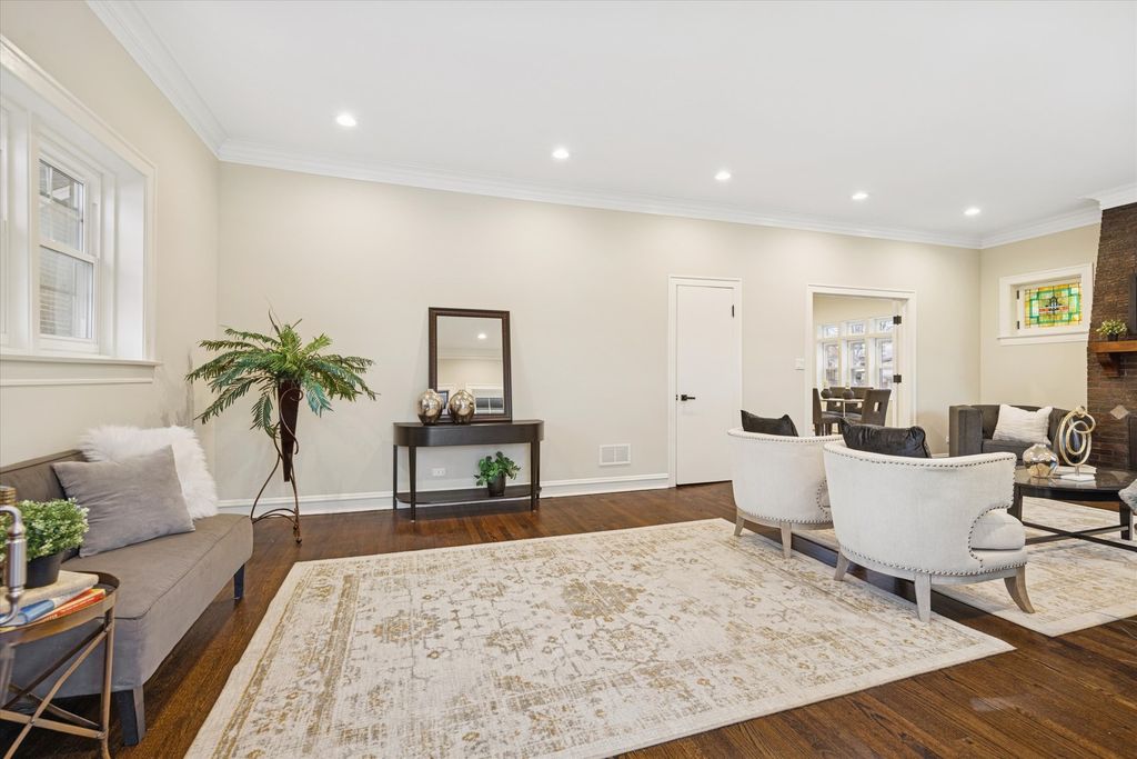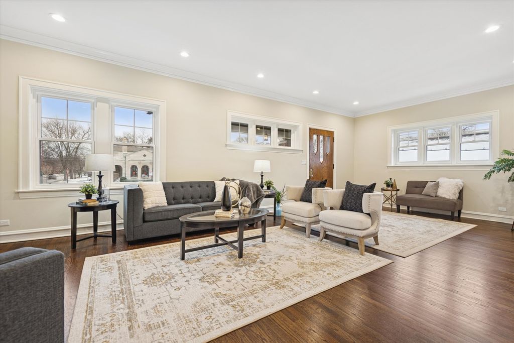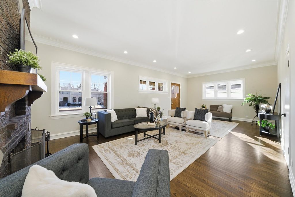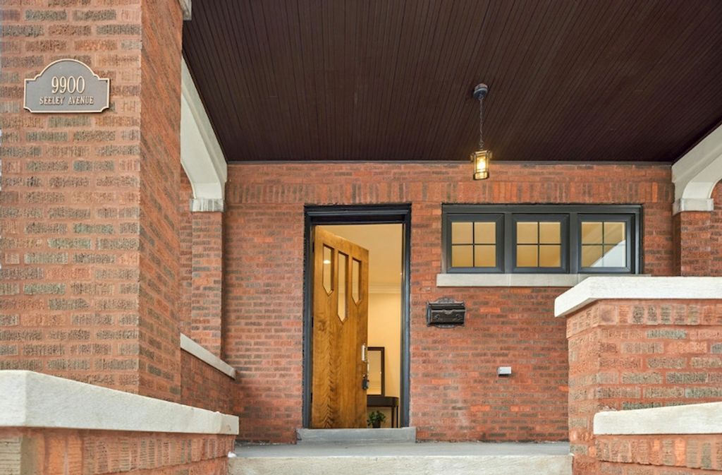Meticulously Renovated 1920's Craftsman 5 Bedrm 4 Bath Bungalow located in prime Beverly location surrounded by a rich mix of architectural styles. It includes timeless home designs such as a 30-foot covered Front Porch, long overhanging eaves, and a broad band of windows across the front. Step into the Grand Living Room. featuring an original fireplace flanked by 2 original stained-glass windows. 10-foot ceilings and hardwood floors span the main level, highlighted by a first-floor primary ensuite offering a spa-like bath with dual sinks, Carrara marble shower, and an expansive walk-in closet. The inviting custom kitchen showcases 42" white Shaker cabinetry, quartz countertops, Samsung Bespoke appliances, a striking recycled-glass backsplash, and an impressive 10-foot center island-perfect for everyday living and entertaining. A refined staircase leads to the second level featuring two additional bedrooms with walk-in closets and a beautifully designed third bath with dual sinks and a soaking tub. The fully finished 1,600-sq-ft basement expands your living space with an enormous family room, fifth bedroom, and a generous flex room ideal for a home office, gym, or playroom. Updates include: windows, roof, high-efficiency HVAC, plumbing, electrical, doors, trim, hardware, carpeting, recessed lighting, and a basement check valve. The restored and tuck-pointed brick exterior is complemented by an updated front walkway, professional landscaping, and a picture-perfect backyard with a privacy fence a brick paver patio.& a refreshed brick two-car garage. Unbeatable location near top-rated schools, parks, and shopping, with a short walk to the Metra for easy commuting. A true gem-welcome home. Additional Photos being Posted 1/26