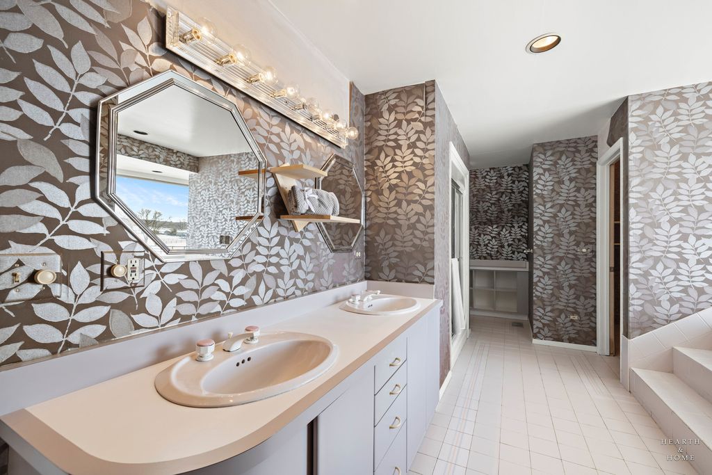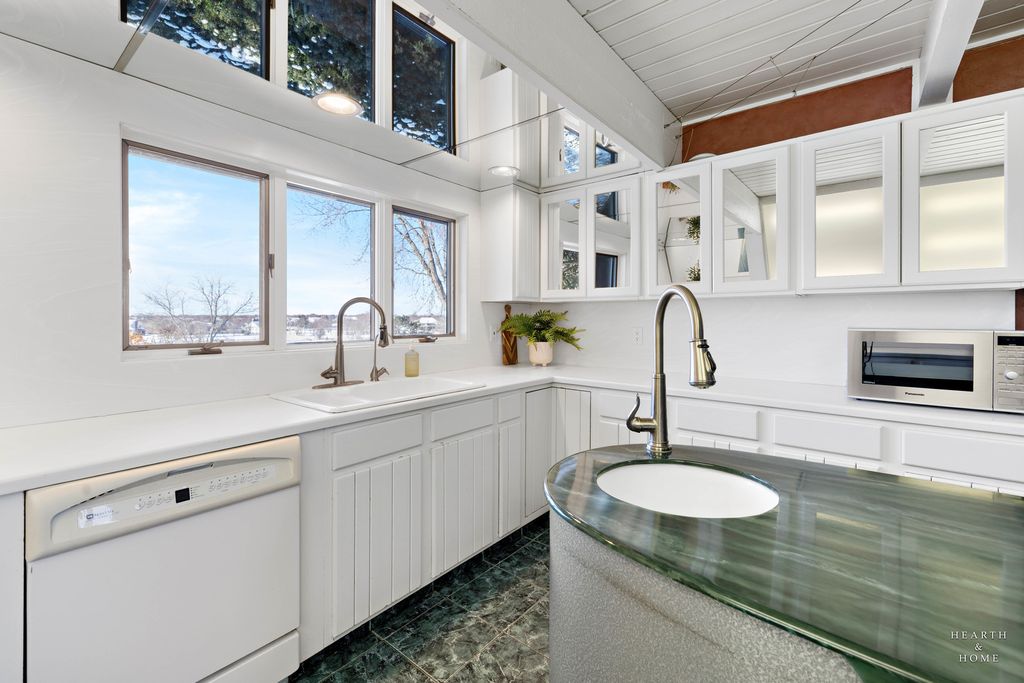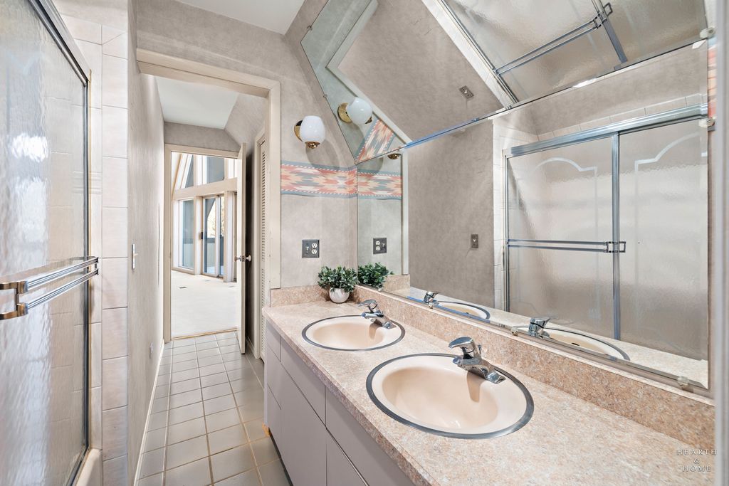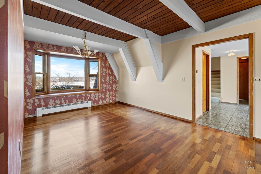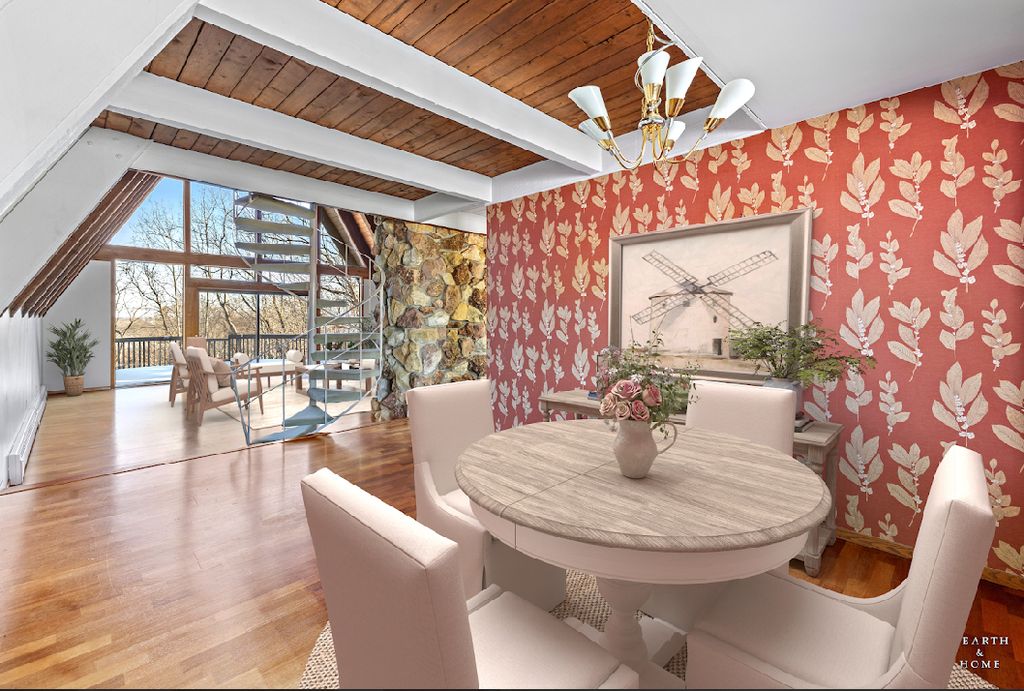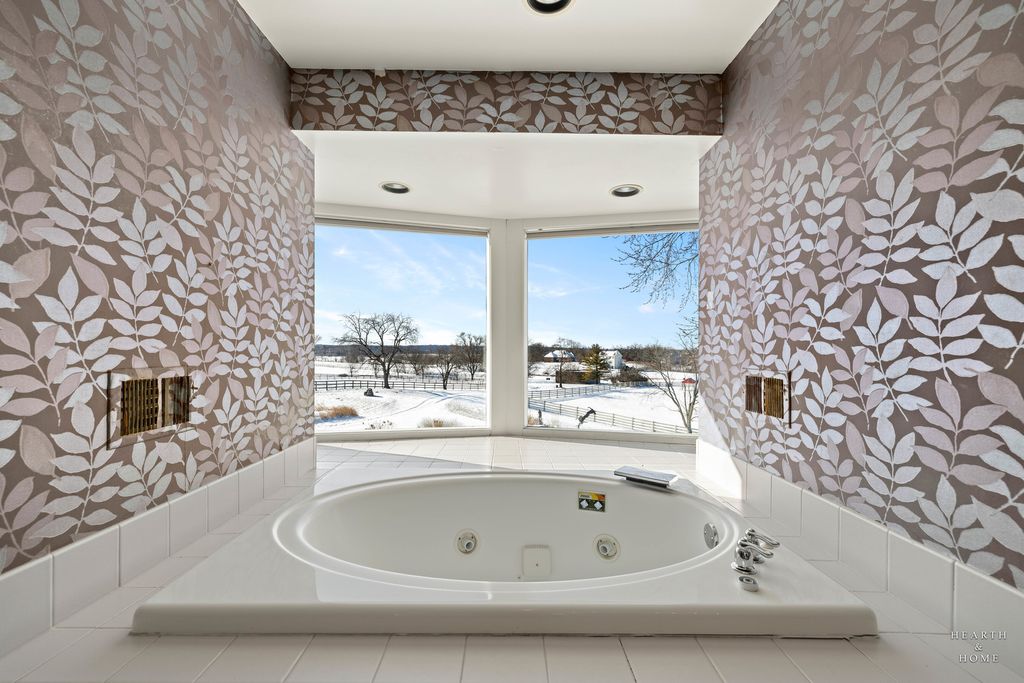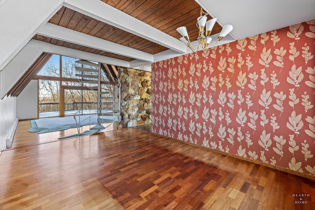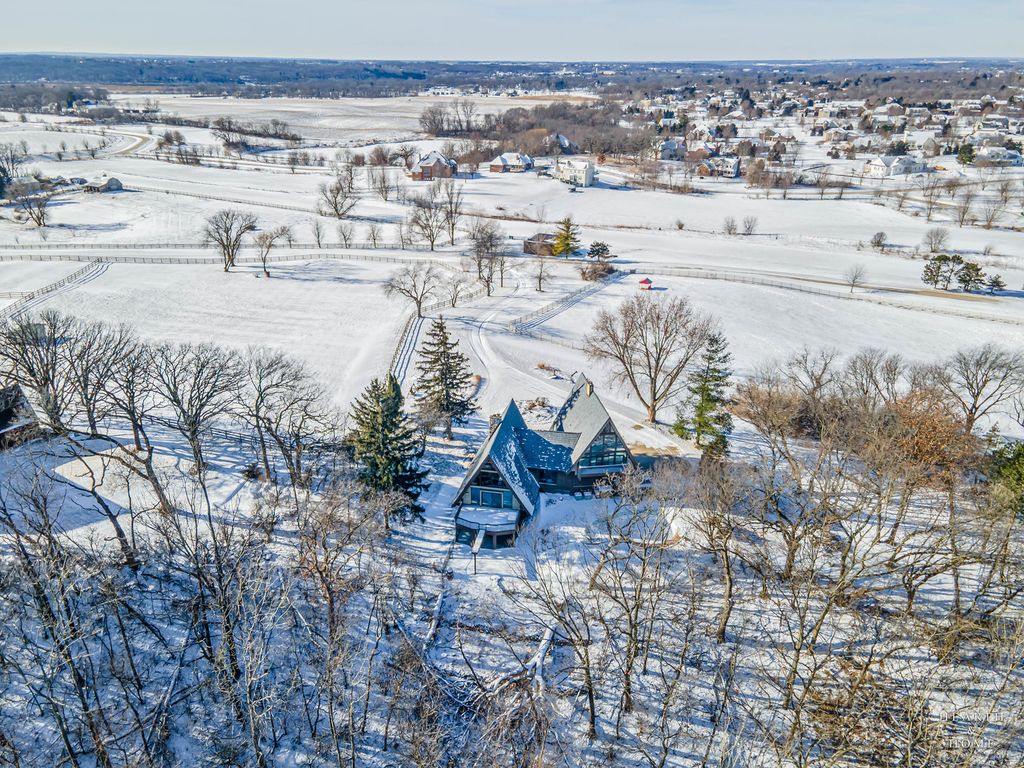 Tucked away on five acres with sweeping views of farmland, Turner Lake and Chain O Lakes State Park, this rare Tudor-style A-frame retreat offers a one-of-a-kind blend of architectural charm, privacy, and natural beauty. Surrounded by mature woods and pastoral landscapes, the home feels like a secluded woodland escape-yet remains perfectly positioned for year-round outdoor adventure, including hunting, fishing, boating, and hiking. And if you enjoy golf, you're only a mile from the Fox Lake Country Club. Step inside the dramatic great room, where soaring 26-foot beamed ceilings, a striking stone fireplace, rich hardwood floors, and floor-to-ceiling windows create a truly unforgettable first impression. Expansive sliding doors open to a large deck overlooking the pool and forest views-an ideal setting for sunset dinners, morning coffee, or evening cocktails immersed in nature. The primary suite continues the A-frame design with cathedral ceilings, floor-to-ceiling windows, fireplace, and a private balcony overlooking the pool and wooded backdrop. A loft above the suite offers flexible space for an office, reading nook, or guest retreat. The spa-like primary bath features a double vanity, shower, jacuzzi tub, dual walk-in closets, and a large picture window framing serene front-yard views. A second upstairs bedroom features charming beamed ceilings, built-in storage, its own private balcony overlooking the front of the estate, and an ensuite bath with double vanity sinks. The dining room exudes warmth with a cozy beamed ceiling, hardwood floors, and a generous bay window. The bright, inviting kitchen showcases white cabinetry, solid-surface countertops and backsplash, an island with prep sink, and stainless steel appliances. The lower level offers exceptional versatility, featuring a spacious family room with custom built-ins, a rustic stone fireplace, custom dry bar, and sliding doors leading to a large, screened porch. This room would be perfect for entertaining or creating a game room/rec room space. A third bedroom, full bathroom, and laundry room complete the level, which could easily function as an in-law suite or private guest quarters. Car enthusiasts and hobbyists will appreciate the massive three-car garage with oversized 9.5-foot doors and soaring ceilings, providing ample storage for vehicles, boats, and gear. Outside, the property truly shines. The front offers picturesque pastoral views, while the backyard unfolds into a secluded woodland oasis. The swimming pool is surrounded by a custom stamped concrete patio, mature trees, and tranquil natural scenery-evoking the feeling of a luxury cabin in the woods. A new composite shake roof was installed in 2025. While the home offers an opportunity for updates, its architectural character, setting, and potential are unmatched. This is a rare chance to transform an extraordinary property into a dream estate. Bring your vision and imagination. Listing includes PIN:05-20-400-017 (home on 2.03 acres) in McHenry Co. and PIN:01-21-300-003 (adjacent 3.21 wooded acres) on east side of property in Lake Co.