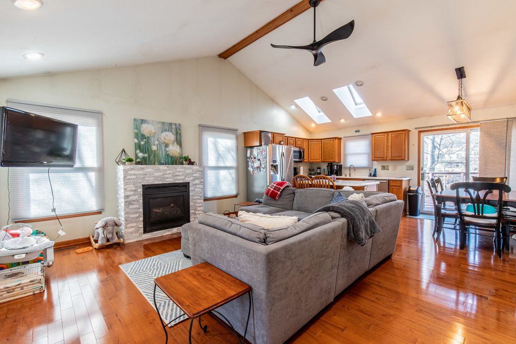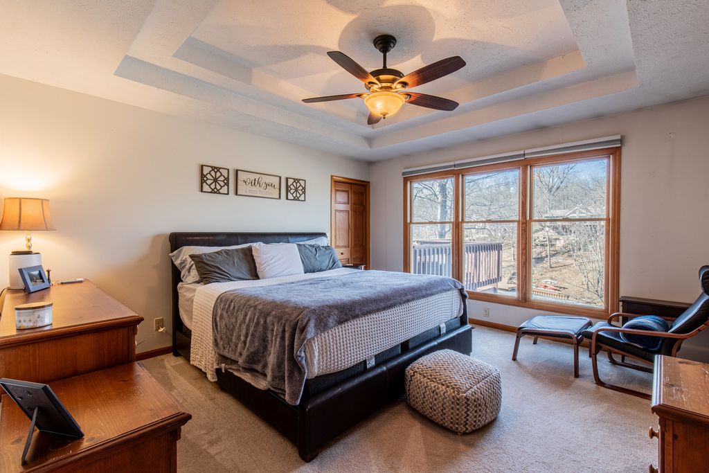 This beautifully maintained waterfront walk-out ranch, located in Lake Thunderbird, offers the perfect lakefront retreat. Featuring 4 bedrooms and 3 full baths, the home includes main-level sleeping areas, a spacious primary suite with a large hot tub and separate shower, and an open, light-filled floor plan enhanced by vaulted ceilings. The kitchen and living areas flow seamlessly together and showcase modern stainless steel appliances along with stunning lake views. The walk-out lower level offers a large bedroom and full bath, laundry room, and recreation room with a fireplace and picturesque views of the water. Step outside to enjoy effortless outdoor living with a deck ideal for grilling, relaxing, and taking in beautiful sunsets. Additional highlights include a very large heated garage with loft space, private boat dock. Residents of Lake Thunderbird enjoy access to outstanding amenities including fishing and boating, beach a pool, clubhouse, playgrounds, basketball courts, tennis, mini golf, and more - making this home an ideal year-round residence or vacation getaway.