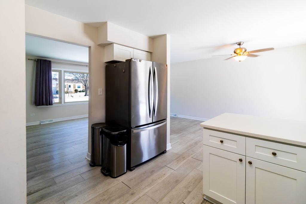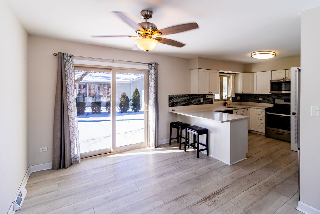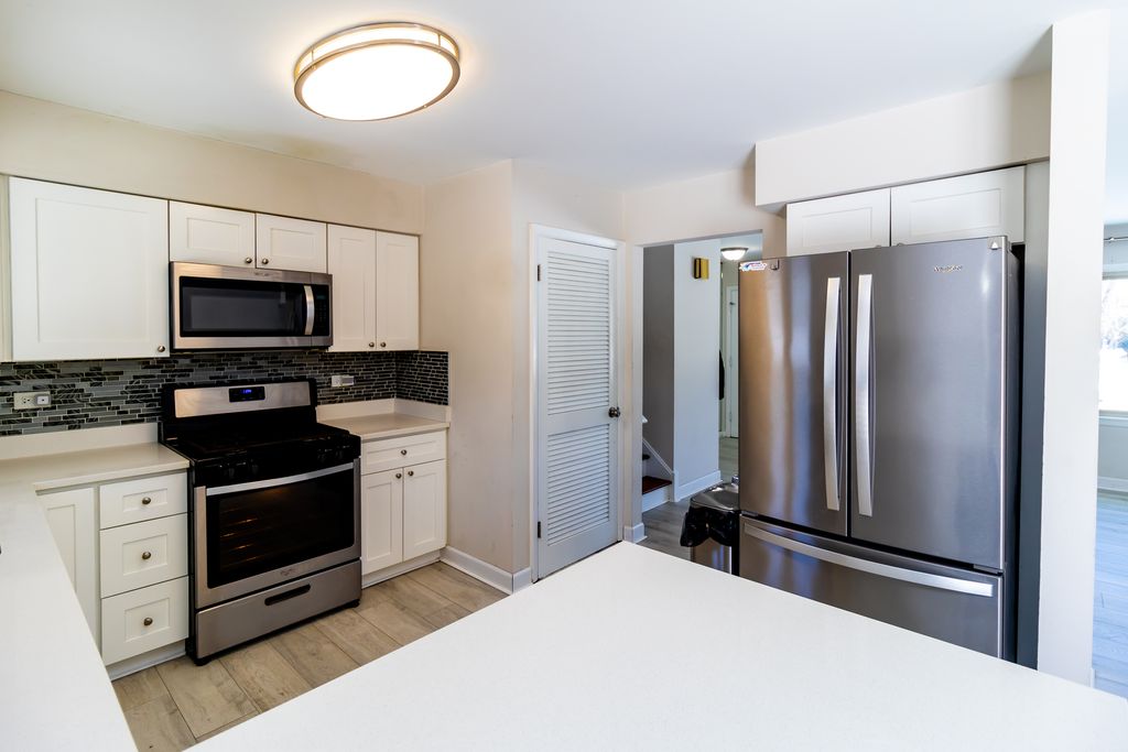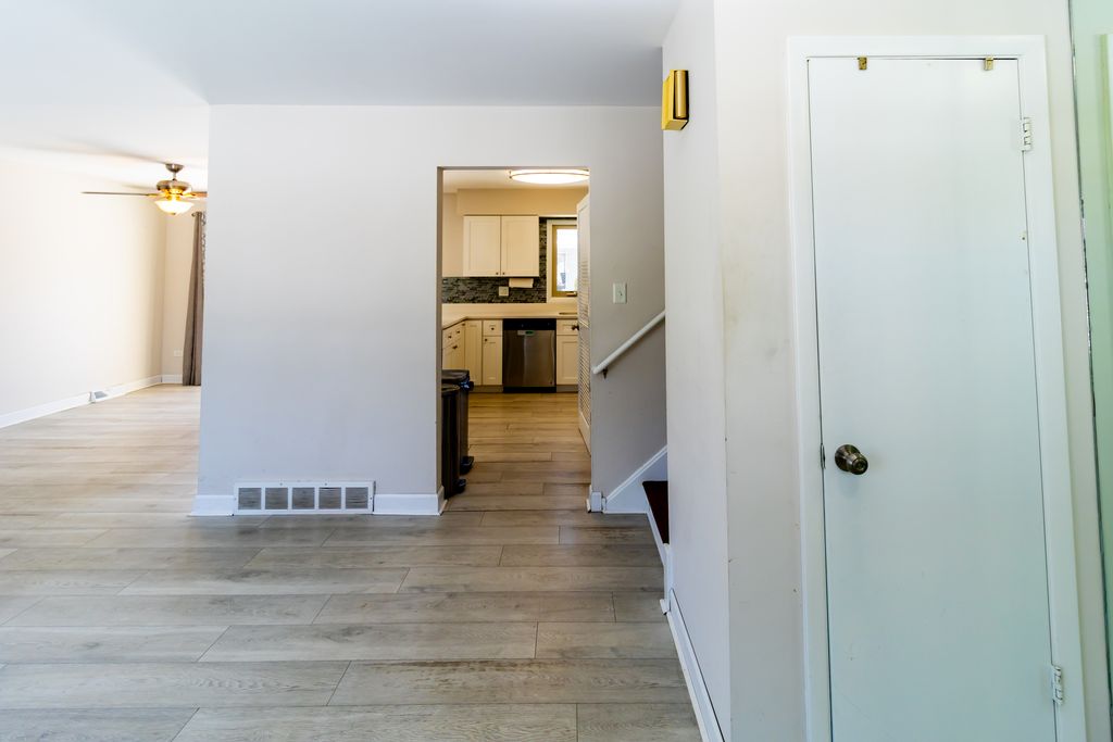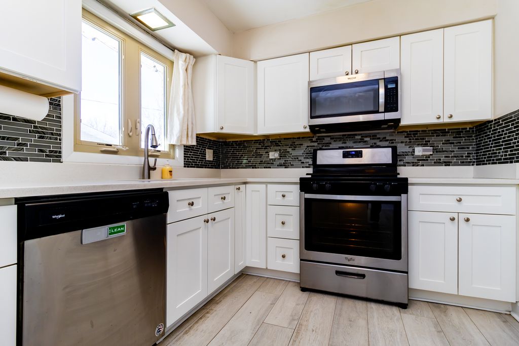 Updated single-family home featuring an open-concept layout ideal for entertaining. The beautiful kitchen showcases white soft-close cabinets and drawers, quartz countertops, and all stainless steel appliances, and flows seamlessly into the dining and living areas-perfect for hosting family and guests. Luxury engineered hardwood flooring runs throughout, complemented by updated bathrooms. The home offers three bedrooms and two full bathrooms on the upper level, including a private full master bathroom designed for homeowner comfort. The main level features the kitchen, dining area, and living space, while the lower level includes a half bath and a cozy fireplace, creating additional space for relaxation or entertaining. The fenced backyard provides added privacy and features a concrete patio slab, ideal for summer grilling and outdoor gatherings. Mechanical systems have been consistently serviced, and the water heater was replaced in 2017. Additional improvements include newer siding and HVAC. An attached garage with additional parking for up to four cars completes this move-in-ready home. This is truly a must-see property offering comfort, functionality, and great entertaining space.