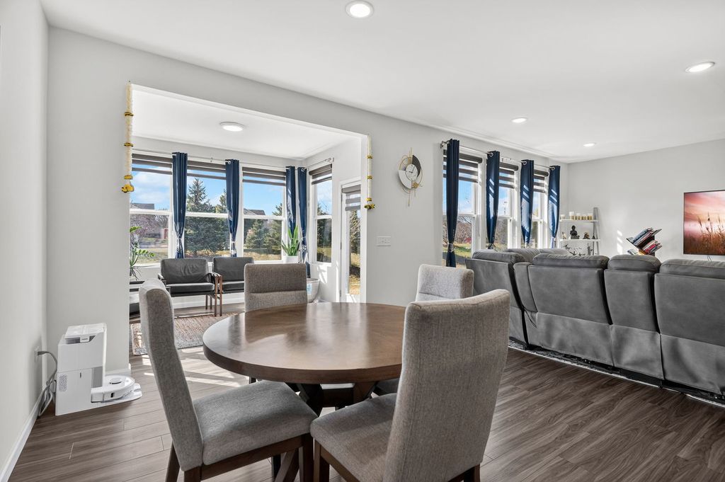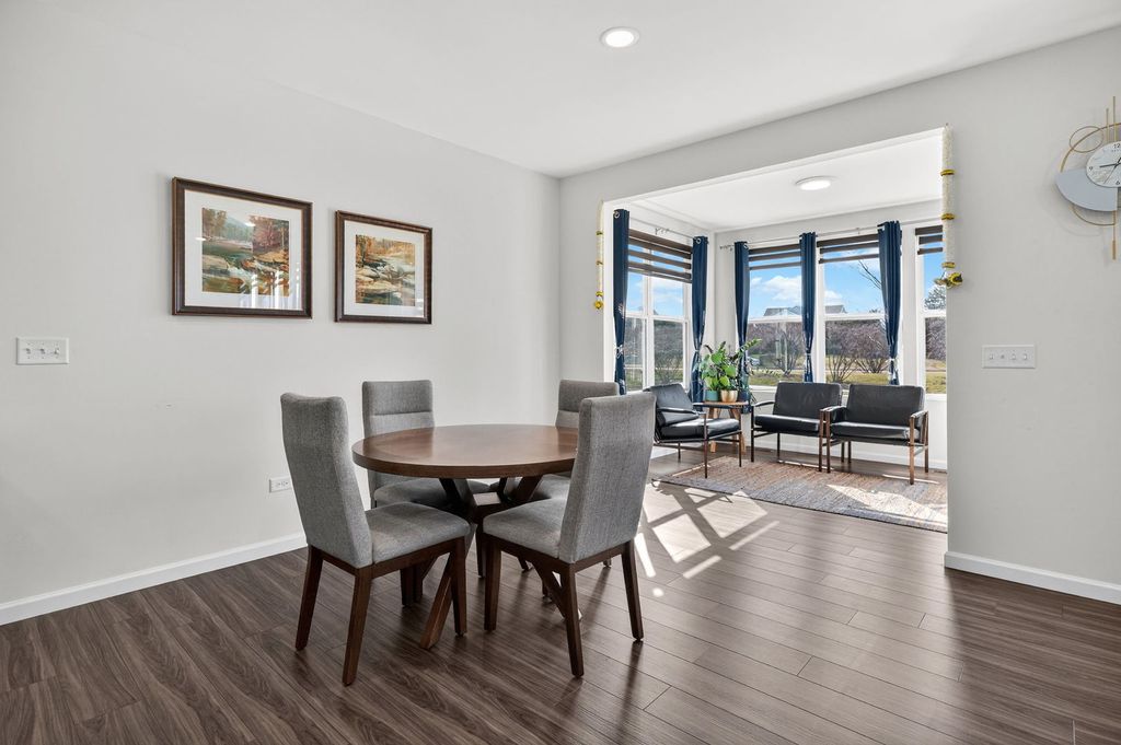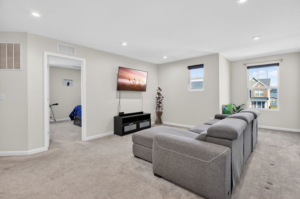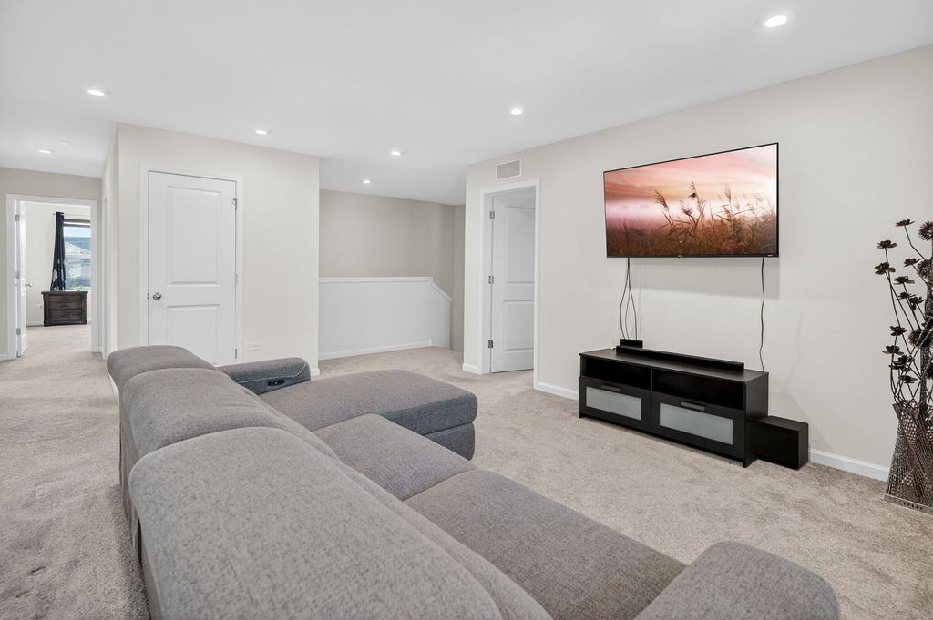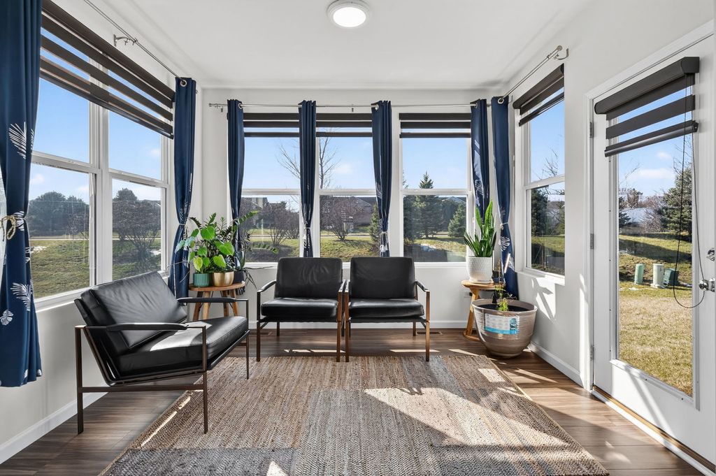 Welcome home to Wagner Farms, located within the highly sought-after Neuqua Valley High School. This beautifully designed, three-year-old East facing residence offers a thoughtfully planned open-concept layout that blends modern comfort with everyday functionality. A welcoming foyer flows seamlessly into the expansive great room, cafe, and gourmet kitchen, creating an ideal setting for daily living and entertaining. The gourmet kitchen anchors the home with quartz countertops, abundant cabinetry, a large center island, stainless steel appliances, upgraded flooring, and modern lighting. A walk-in butler's pantry adds both elegance and practicality, making hosting effortless. Adjacent to the kitchen, the sunroom is filled with natural light and provides a relaxed space for casual dining or unwinding. A separate formal dining room is perfect for special occasions, while the main-floor office or flex room offers versatility for working from home or quiet study. Just off the kitchen, the PPC/mudroom serves as a functional drop zone for organization and daily routines. Upstairs, the primary suite offers a private en-suite bathroom with a soaking tub and separate shower. The second-floor loft provides flexible living space for family activities or entertaining, and the laundry room is conveniently located on the same level. The full basement features 9-foot ceilings and rough-in plumbing, offering excellent potential for future finishing while currently providing generous storage. There are no homes behind the property, offering added privacy and an open backdrop that is ideal for entertaining and hosting gatherings. Additional upgrades include quartz countertops throughout, upgraded flooring, zebra blinds, a water softener, RO drinking water system, EV charging outlet, enhanced lighting with pot lights, a video doorbell, and front and rear surveillance cameras. Conveniently located near shopping, dining, and tollways, this exceptional home delivers space, privacy, modern upgrades, and long-term value in one complete package.