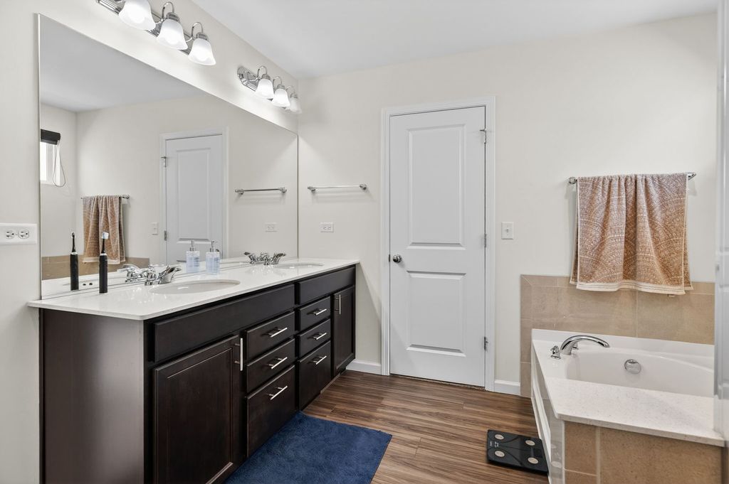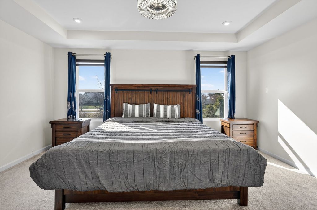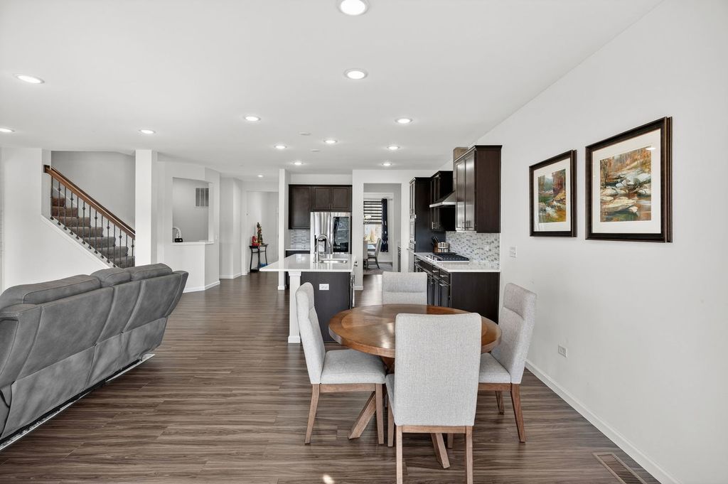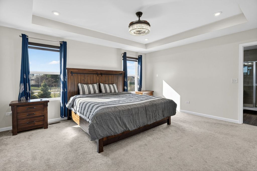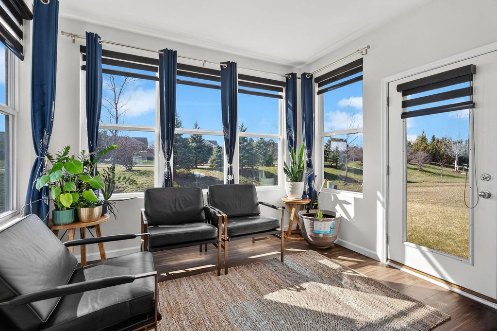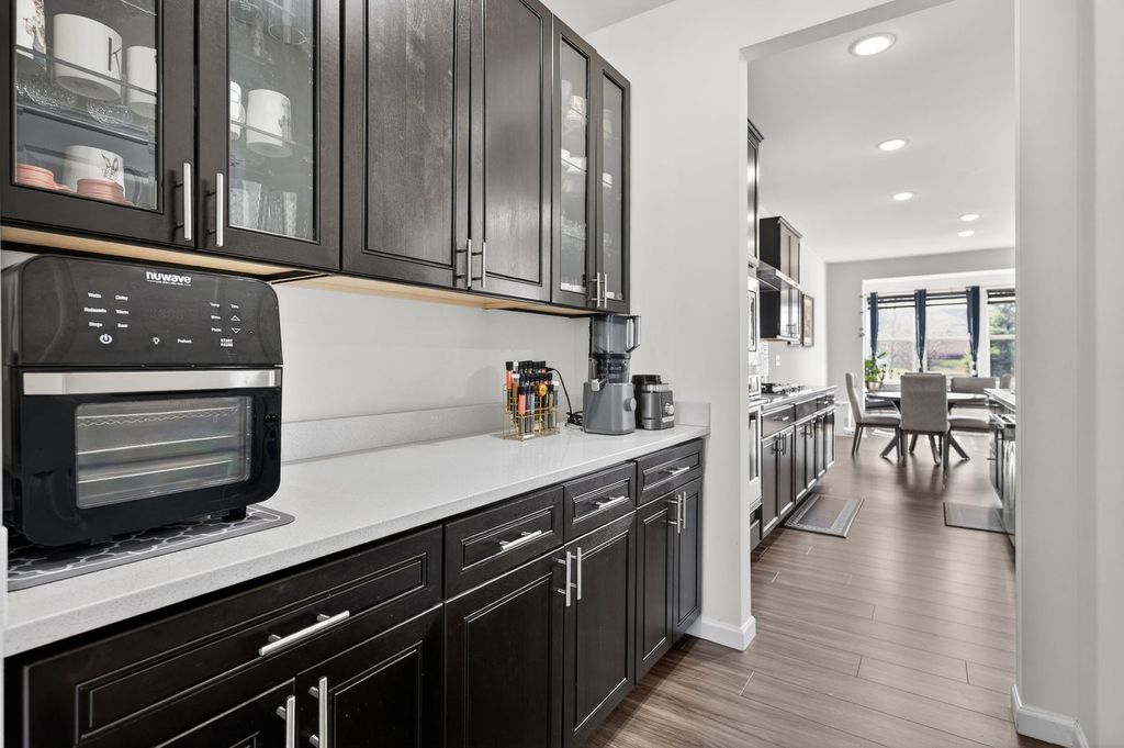 Welcome home to Wagner Farms, located within the highly sought-after Neuqua Valley High School. This beautifully designed, three-year-old East facing residence offers a thoughtfully planned open-concept layout that blends modern comfort with everyday functionality. A welcoming foyer flows seamlessly into the expansive great room, cafe, and gourmet kitchen, creating an ideal setting for daily living and entertaining. The gourmet kitchen anchors the home with quartz countertops, abundant cabinetry, a large center island, stainless steel appliances, upgraded flooring, and modern lighting. A walk-in butler's pantry adds both elegance and practicality, making hosting effortless. Adjacent to the kitchen, the sunroom is filled with natural light and provides a relaxed space for casual dining or unwinding. A separate formal dining room is perfect for special occasions, while the main-floor office or flex room offers versatility for working from home or quiet study. Just off the kitchen, the PPC/mudroom serves as a functional drop zone for organization and daily routines. Upstairs, the primary suite offers a private en-suite bathroom with a soaking tub and separate shower. The second-floor loft provides flexible living space for family activities or entertaining, and the laundry room is conveniently located on the same level. The full basement features 9-foot ceilings and rough-in plumbing, offering excellent potential for future finishing while currently providing generous storage. There are no homes behind the property, offering added privacy and an open backdrop that is ideal for entertaining and hosting gatherings. Additional upgrades include quartz countertops throughout, upgraded flooring, zebra blinds, a water softener, RO drinking water system, EV charging outlet, enhanced lighting with pot lights, a video doorbell, and front and rear surveillance cameras. Conveniently located near shopping, dining, and tollways, this exceptional home delivers space, privacy, modern upgrades, and long-term value in one complete package.