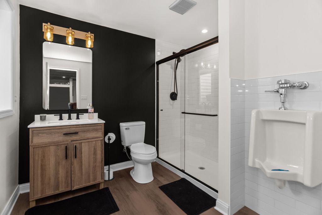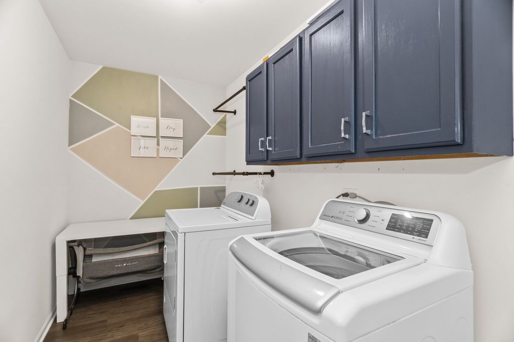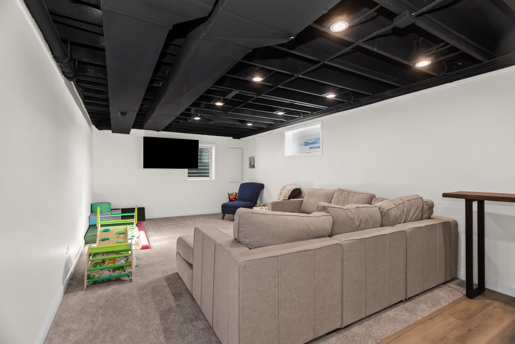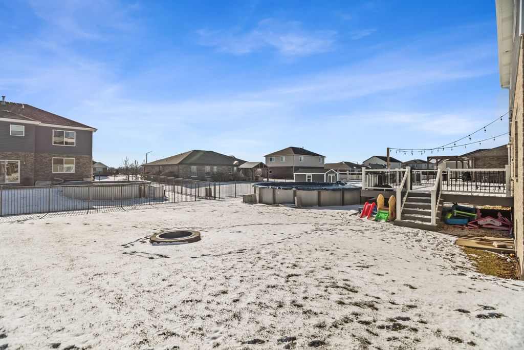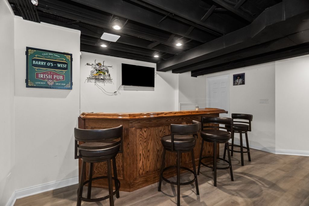 Spacious 4 bedroom, 3.5 bath home with a finished basement, open main level layout, and modern updates throughout. The main floor features a large living room that flows into the dining area and an oversized kitchen with dark cabinetry, quartz countertops, stainless steel appliances, and a center island with seating. Sliding doors lead to a Trex deck overlooking a fully fenced backyard with a pool and lawn irrigation system, creating an outdoor space that is easy to maintain and ready to enjoy. Upstairs offers four generously sized bedrooms including a primary suite with walk-in closet and private bath, along with the convenience of a second-floor laundry room. The finished basement adds exceptional living space with a large recreation room, custom bar, and a beautifully updated full bathroom with walk-in shower. Attached 2-car garage, great natural light, and a layout designed for everyday living and entertaining. Move-in ready and well maintained.