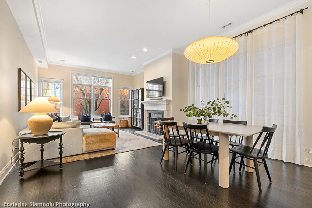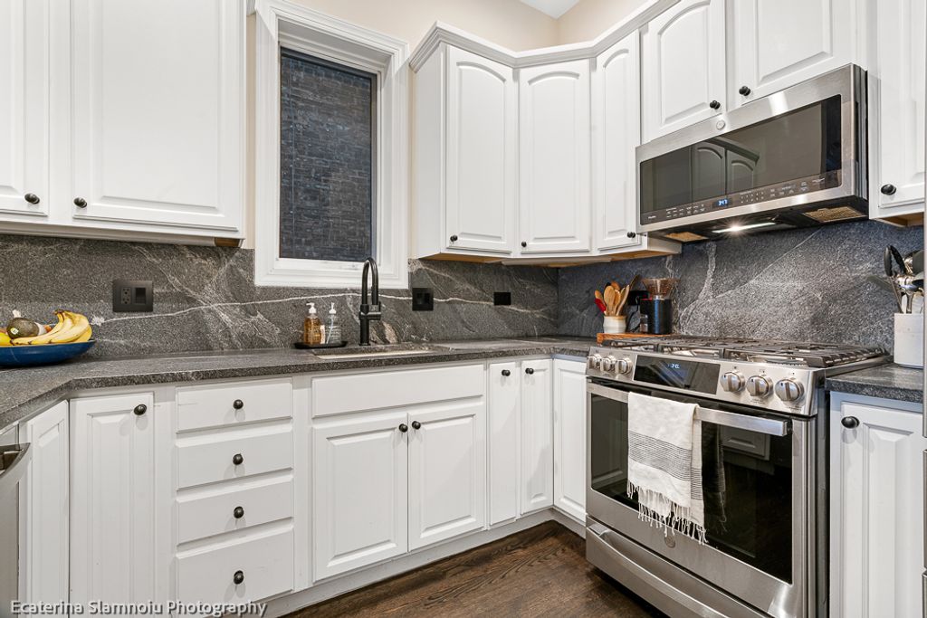 This stunning 3-bedroom, 2-bathroom condo is ideally situated on a charming tree-lined street in the heart of Lakeview East, just steps from the lakefront, Southport Corridor and Wrigley Field. Featuring soaring 10-foot ceilings and expansive north- and east-facing windows, the home is filled with natural light and offers a bright, airy ambiance throughout. Located one flight of stairs up, this high first-floor home is set within an intimate 9-unit building and overlooks a quiet residential street. The open-concept living and dining area easily accommodates a large sectional and a dining table for 8-10 guests, making it ideal for both everyday living and entertaining. The living room features a gas fireplace and oversized windows, while the dining area flows seamlessly into the spacious, fully updated kitchen. The kitchen boasts white soft-close cabinetry, modern pendant lighting, stainless steel GE Profile appliances (2022), ample storage, and a peninsula with seating for three. Three generously sized bedrooms are tucked away at the rear of the home for added privacy, along with two full bathrooms. The primary suite comfortably fits a king-size bed and includes a professionally organized walk-in closet and an en-suite bath with dual sinks, a Jacuzzi tub, and a walk-in shower. Additional highlights include hardwood floors throughout, a walk-in laundry room with newer GE Profile front-loading washer and dryer (2023), and a private deck perfect for relaxing or grilling. The unit offers abundant storage, including an additional 5 foot by 5 foot storage closet outside the home, and includes one garage parking space in the detached garage. Smart-home features include a Nest thermostat, ceiling speakers in most rooms, and touchscreen door locks. This meticulously maintained home has seen numerous upgrades: furnace replaced in 2020; floors refinished, interior repainted, new lighting fixtures, and a gut renovation of the hall bathroom in 2020; new kitchen countertops and appliances in 2022; washer and dryer in 2023; and a primary bath update in 2025. Unbeatable location just steps from Whole Foods, Jewel-Osco, Walgreens, Starbucks, CTA Red Line, parks, lakefront path, and all the dining, shopping, and entertainment Lakeview East has to offer.