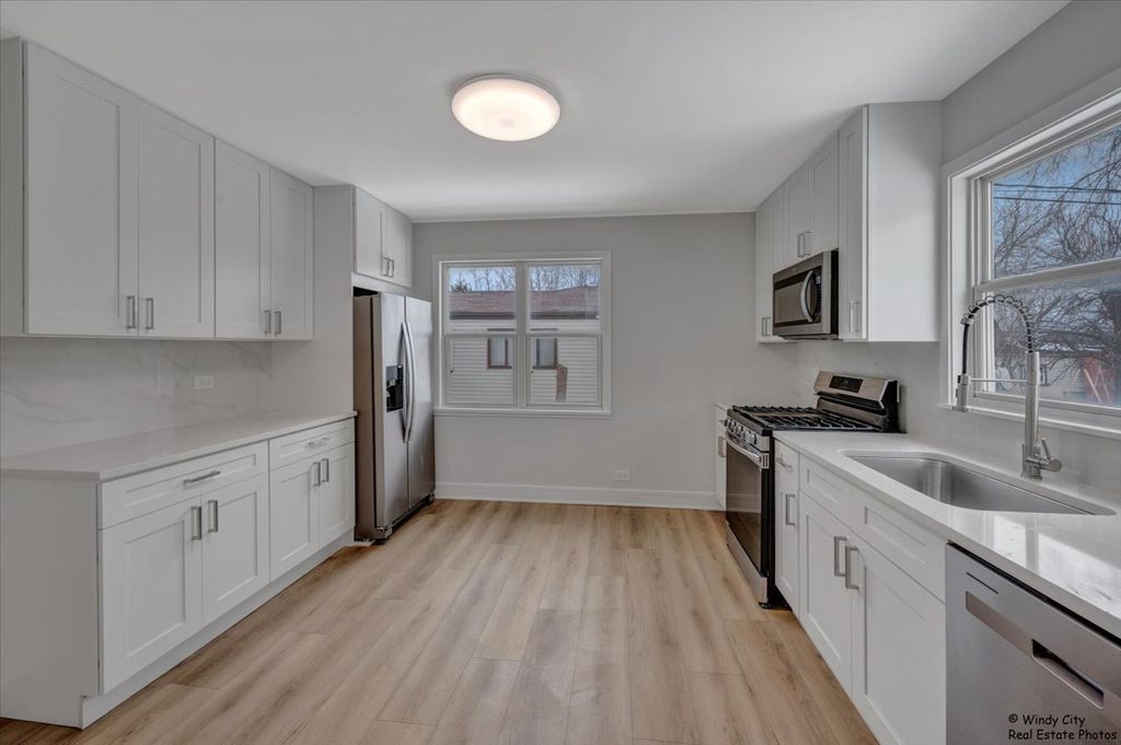 Beautifully updated ranch in Lombard featuring a bright, open floor plan and sun-filled living spaces. The stunning modern kitchen showcases crisp white cabinetry, sleek quartz countertops, and stainless-steel appliances, seamlessly opening to a cozy living and dining area with gleaming new floors. The home offers three comfortable bedrooms and a fully updated bathroom with contemporary finishes. Fresh paint throughout adds to the clean, move-in-ready feel. Enjoy the convenience of a two-car garage and a large, fully fenced yard-perfect for outdoor entertaining, pets, or relaxing in privacy. Ideally located near parks, shopping, and restaurants, this home blends modern updates with classic charm. A must-see.