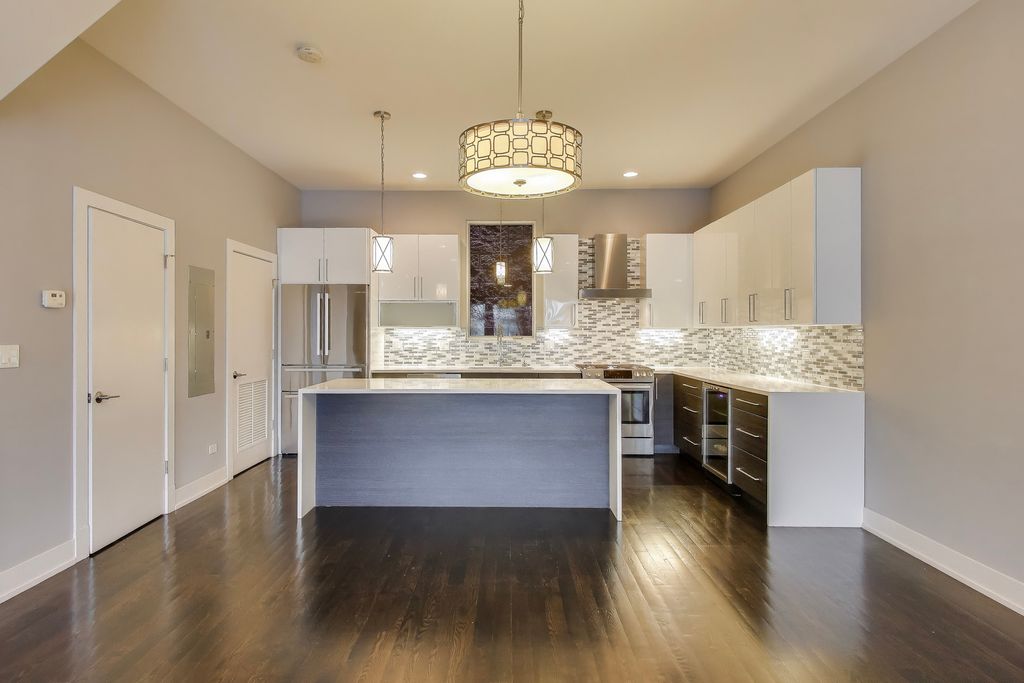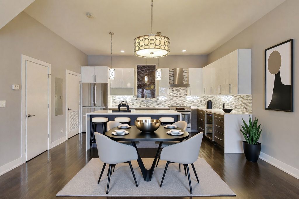 Modern 3 bedroom/ 2.5 Bath townhouse in the heart of Logan/Palmer Square. This townhome shows like new, with high ceilings and large windows, bringing in tons of sunlight. Unit features open floor plan with wide-planked hardwood floors, and a high-end kitchen with quartz island, Bosch appliances and contemporary flat paneled cabinets. Tons of upgrades throughout including custom fireplace, automated blinds, over sized steam shower, closet organizers/walk in closet in very spacious, primary bedroom. All three bedrooms on third level, with 2 full baths, including primary en suite, and full size washer/dryer. Ample closet space and storage throughout. Outdoor space includes 350sqft private roof-top deck with amazing sunset views, and large individual terrace off of living room. Entry level has mudroom, and the 4th level perfect for a home office. Unit comes with two deeded garage spaces. Great location, walk to restaurants, two blocks from Palmer Square, 2 blocks from 606 and 10 min walk to California Blue Line.