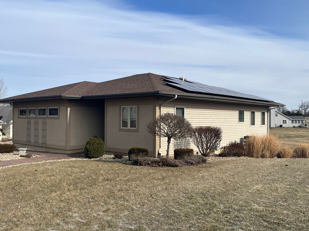 Welcome to this beautifully designed 4-bedroom, 3-bath, ranch-style home. Featuring 3 bedrooms on the main floor and a private basement bedroom. The large primary bedroom is located on the main floor and includes a private en-suite, walk-in closet and French doors leading to the sunroom. The custom open-concept kitchen flows seamlessly into the dining area; the living room is highlighted by a cozy electric fireplace and trey ceiling. The finished basement provides additional living space with a kitchenette, family room, and second laundry area, while main-floor laundry is conveniently located in the pantry off the kitchen. The drive-in lower level has a two stall, heated garage with workshop area. Solar panels, water softener and reverse osmosis systems are leased/rented and subject to transfer per provider terms. New dishwasher 2025, garbage disposal 2024, basement septic pump 2023, whole house filtration system 2022. Don't miss an opportunity to view this the spacious home located on the edge of a quiet cul-de-sac. Seller reserves basement washer, dryer, refrigerator and curtains in main floor bedrooms.