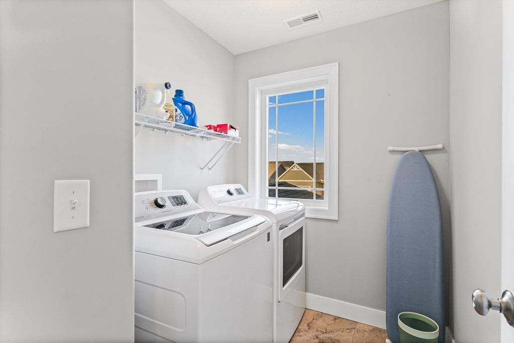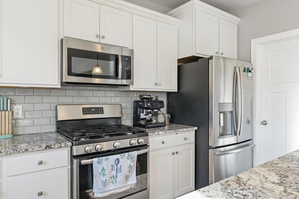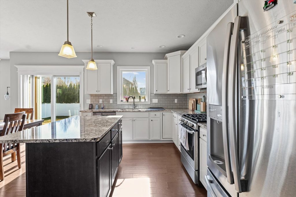 This must-see stunning home offers an open floor plan, with a finished basement, and a fenced yard, providing flexible living and entertaining spaces. The kitchen features granite countertops, a tile backsplash, stainless steel appliances, high ceilings, a walk-in pantry, and a large center island. The living room includes a gas fireplace with a stone surround and painted mantel and hardwood floors throughout the main floor. Upgraded trim packages enhance the windows and doors on the main level, and Pella windows are installed throughout the home. The foyer creates a strong first impression with a corner staircase and shiplap accent wall. The primary suite includes a cathedral ceiling, spacious walk-in closet, and a private bath with dual vanities and a tiled shower. The finished basement offers a family room, sitting area, fourth bedroom, and full bath. Exterior details showcase Craftsman-style architecture with board-and-batten accents, a tapered column, and stonework. The property is conveniently located approximately two blocks from Carrie Busey Elementary School and Prairie Fields Park, and less than half a mile from Colbert Park.