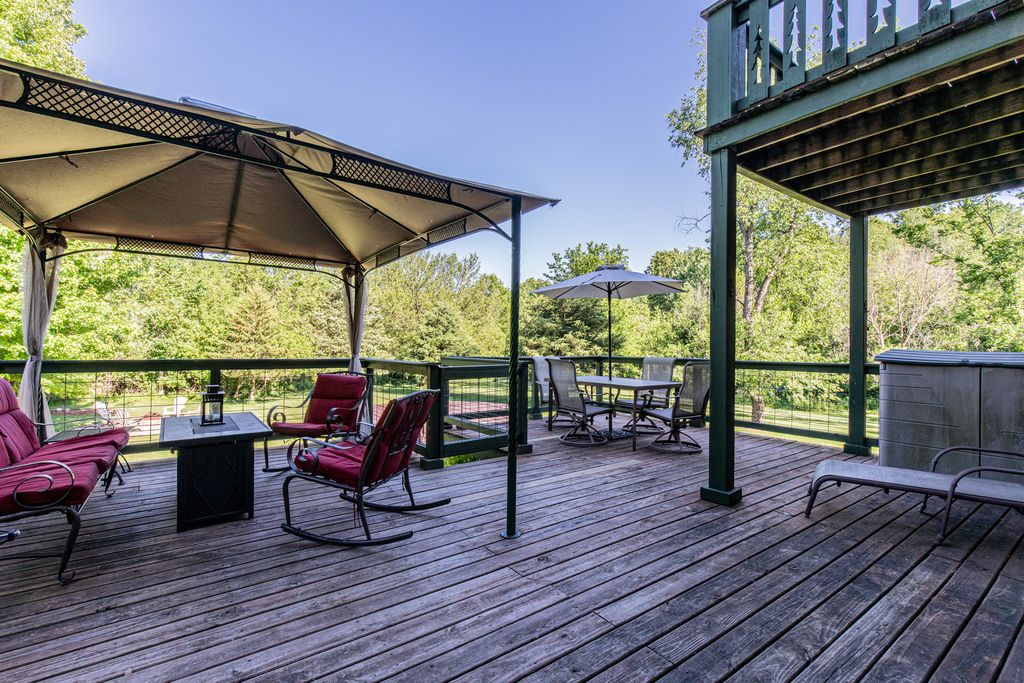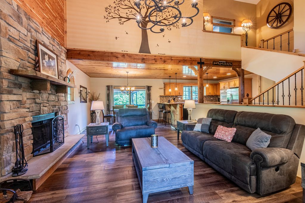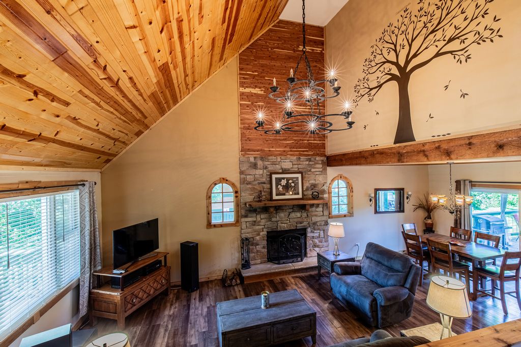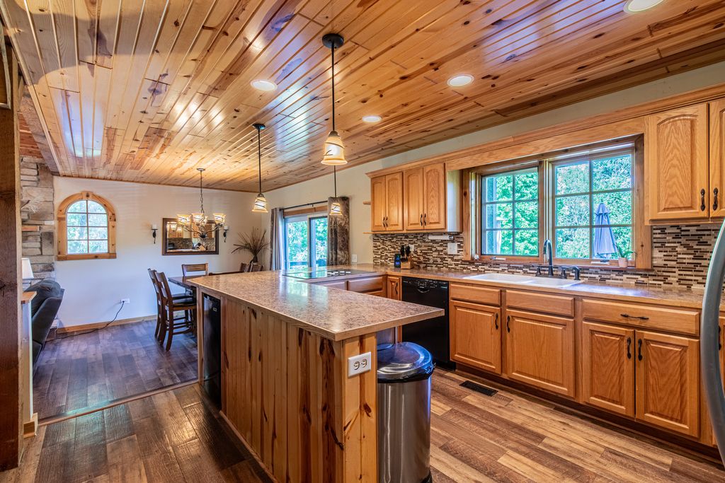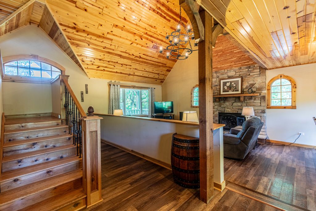 Stunning. Timeless. Private. Whether you're seeking a full-time residence or a peaceful escape, this home delivers comfort and an unmistakable sense of calm. A place that feels like a refuge, not just an address. The inviting front porch sets the tone for a retreat-like experience. Inside, soaring wood-planked ceilings, exposed beams, and rich natural finishes create a warm, architectural statement. The open-concept layout flows effortlessly, anchored by a stunning stone fireplace. The kitchen is both functional and welcoming with a seamless connection to the dining area that opens to a large deck, extending the living space. Outdoors, the property continues to impress with a serene, tree-lined landscape where you'll appreciate the privacy, beauty, and room to roam year-round. Updated where it counts and carefully maintained throughout. Ask your agent for more information.