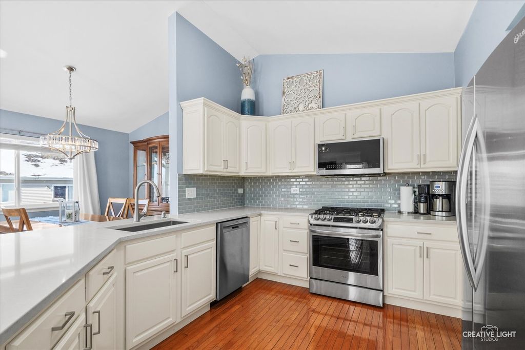 HELLO GEORGEOUS! The only townhouse currently available in Tall Grass and the most updated one you've ever seen. This rare end-unit stuns from top to bottom with thoughtful, high-quality upgrades and impeccable style throughout. The kitchen has been completely transformed: refinished white cabinetry, a formerly two-tiered countertop re-imagined into a single expansive surface, and finished with sleek quartz countertops & single deep basin sink. Stainless steel appliances include a vented microwave (2025), oven (2022), and a whisper-quiet Bosch dishwasher (2019). A gray glass subway tile backsplash and brushed-nickel 5" drawer pulls complete the clean, modern look. Hardwood floors span the main level and lower level (excluding bedrooms), while brand-new plush carpeting enhances the primary bedroom, staircase, and third bedroom. The dining room shines with a striking crystal chandelier-perfect for both everyday living and entertaining. Rarely do both the living room and family room feature Heatilator fireplaces, but this home offers two-each elevated with white shaker-style mantels and custom molding that reflect the sellers' exceptional taste. Wait until you see the primary retreat. Vaulted ceilings, brand-new plush carpet, and a generously sized walk-in closet outfitted with Elfa organization and drawers set the stage. The ensuite bath is a true showstopper-completely gutted and reimagined with a custom vanity topped in quartz, Kohler fixtures, new mirrors and lighting, new tile floors, a frameless glass shower with thermostatic valve, with both a shower head and handheld sprayer and a charming freestanding tub beneath a crystal chandelier. The piece de resistance? A Toto heated-seat bidet toilet-luxury at its finest. The second bedroom offers flexibility with a pull-down Murphy bed, newly added closet, and is currently used as a home office-ideal for guests or work-from-home living. The lower level features a cozy family room with hardwood floors, sliding glass doors, and a second fireplace. The third bedroom boasts brand-new carpet and a large walk-in closet. A convenient laundry room includes a stackable washer and dryer. The finished basement adds even more living space with ultra-plush carpeting, a dedicated media area for movie nights, and a recreation space ready for fun and relaxation. Tall Grass is a swim/tennis community. Nearby is Amazon Fresh, LA fitness & Route 59 shopping & restaurants. Award winning district 204 attendance.