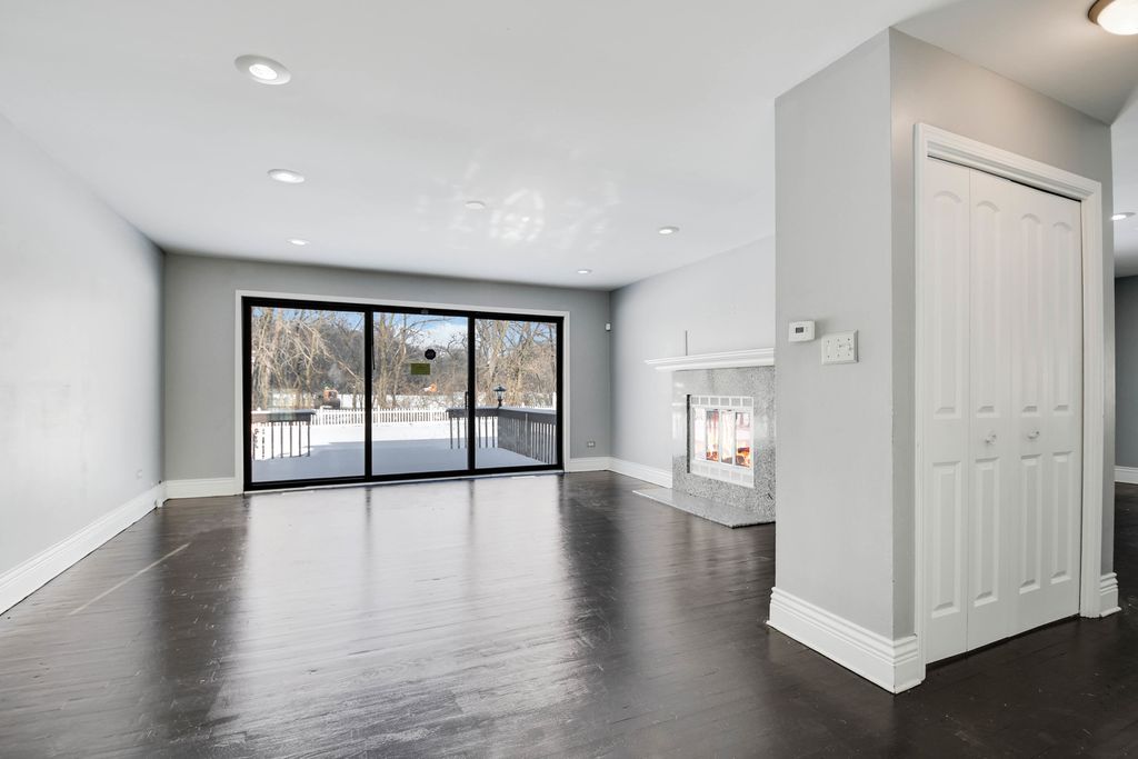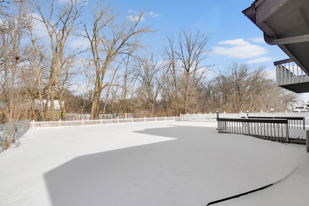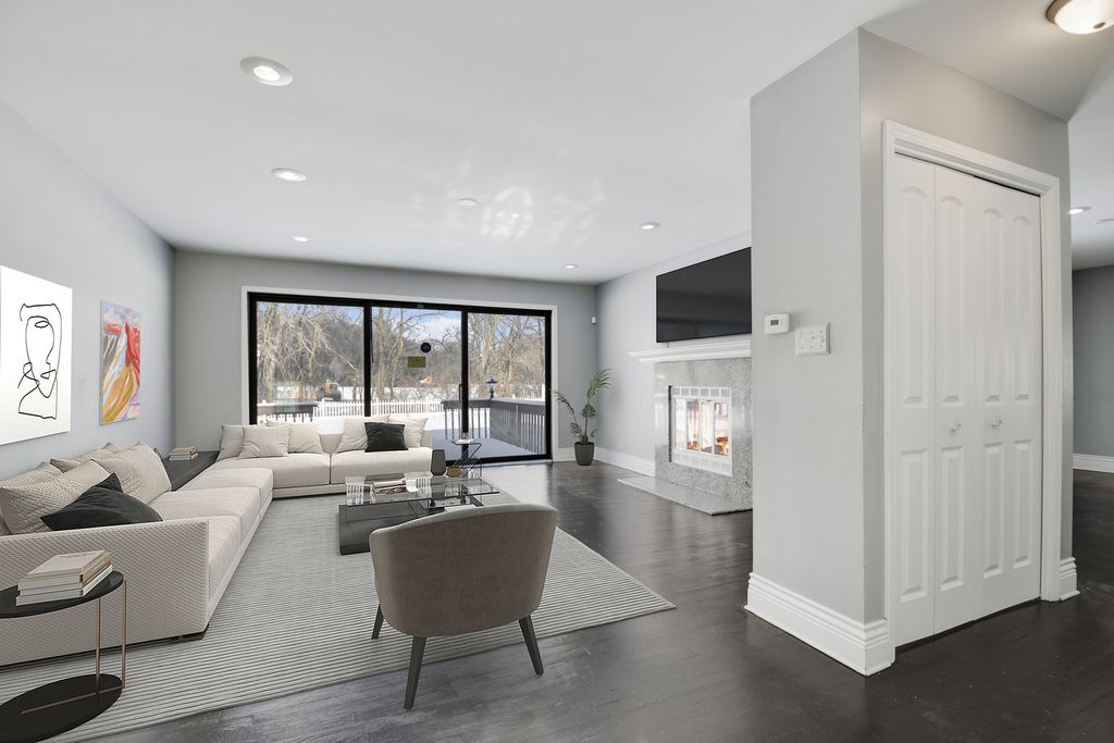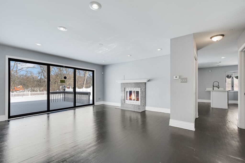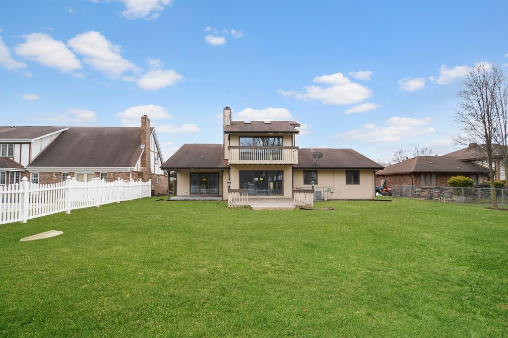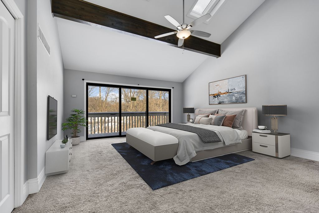 From the moment you arrive, this unique Contemporary Chalet-inspired neo-modern two-story captivates with its individually crafted design and numerous updates throughout. Step inside to discover an efficiently designed, recently updated, softly decorated interior featuring modern white trim, doors, and recessed lighting throughout. A graciously welcoming foyer flows into a large living room with a fireplace and expansive three-panel patio doors leading to a deck and a large fenced backyard. Right next to the living area is a beautifully appointed, updated kitchen offering modern white cabinetry, sleek quartz countertops, stainless steel appliances, an island with sink and breakfast bar, plus a more formal dining area. A second set of patio doors leads to a covered back patio. Three main-level bedrooms include an ensuite bedroom. The staircase, accented by large stained-glass windows, leads upstairs to a private primary bedroom featuring a soaring, elevated beamed ceiling and a spacious private bathroom with double-sink vanity, large shower, and separate tub. A full finished, loft-style basement provides additional space for indoor entertaining, a home office, guest bedroom, or ample storage. Popular and peaceful "Oakwood Estates" location near downtown Crete offers a charming small-town feel. Easy to see and ready for its next owner so schedule your private showing before this rare find is gone.