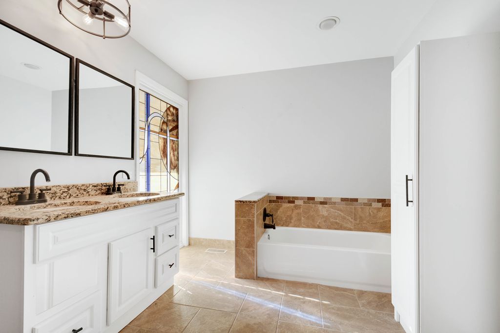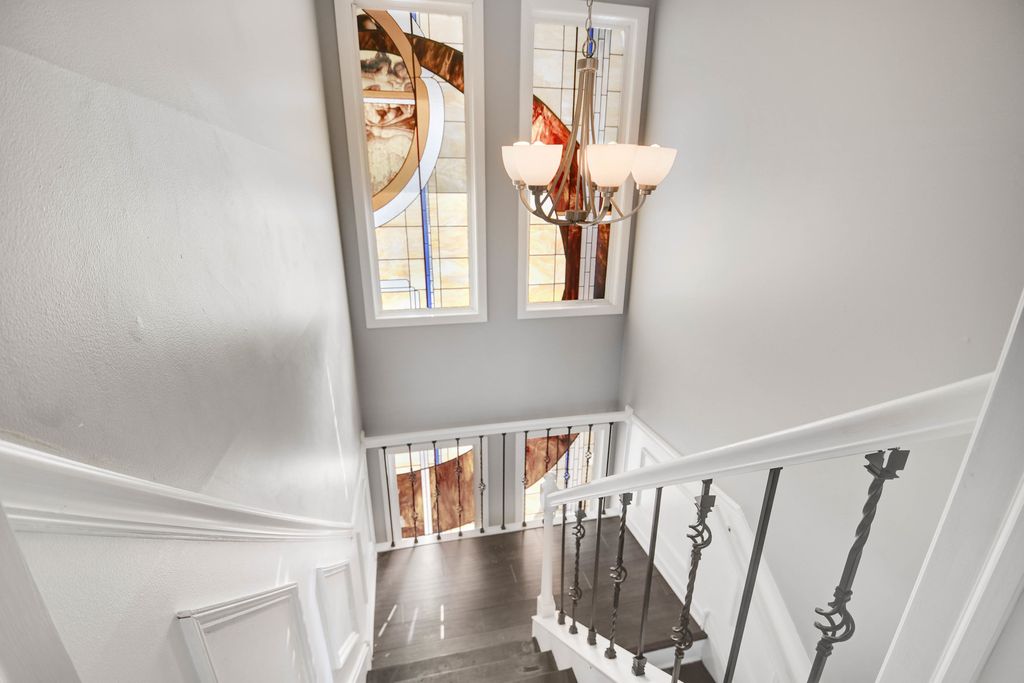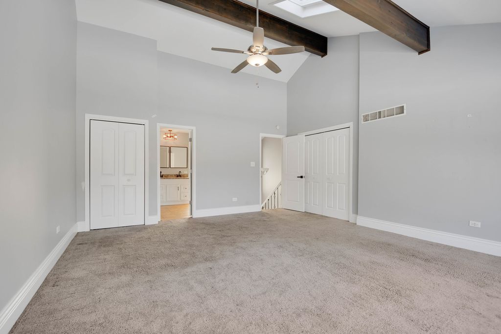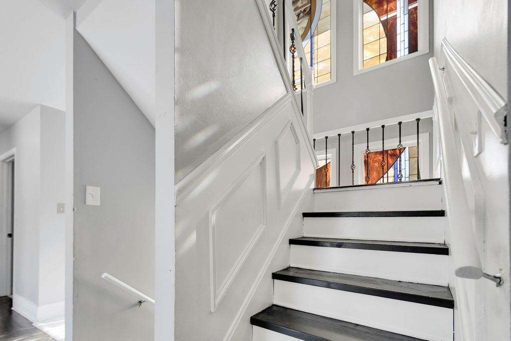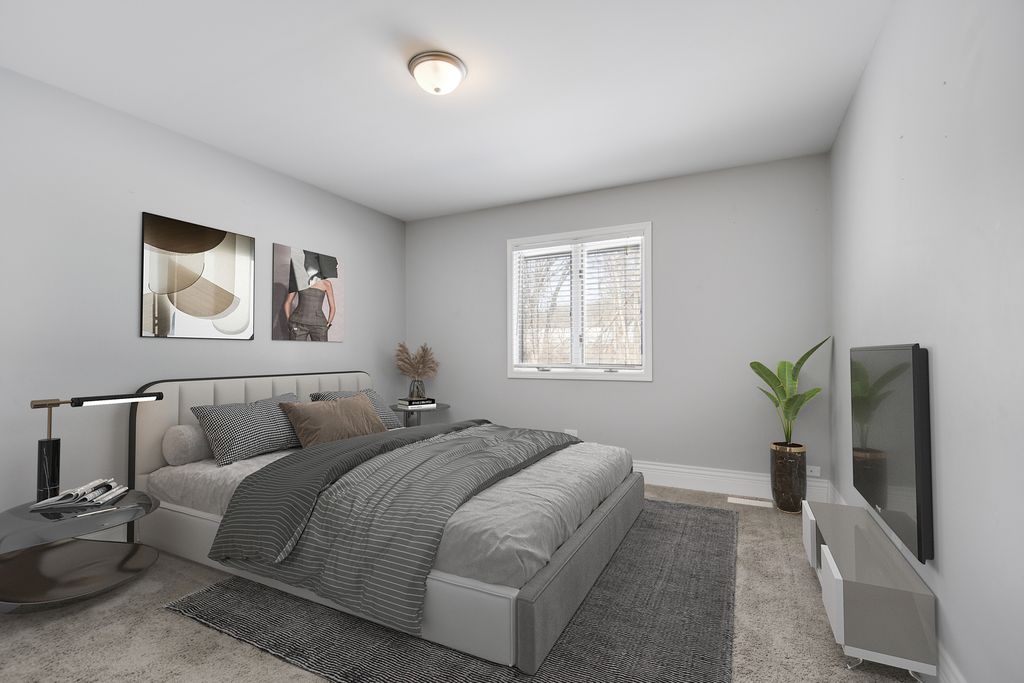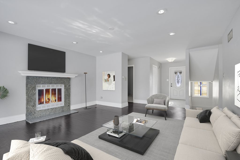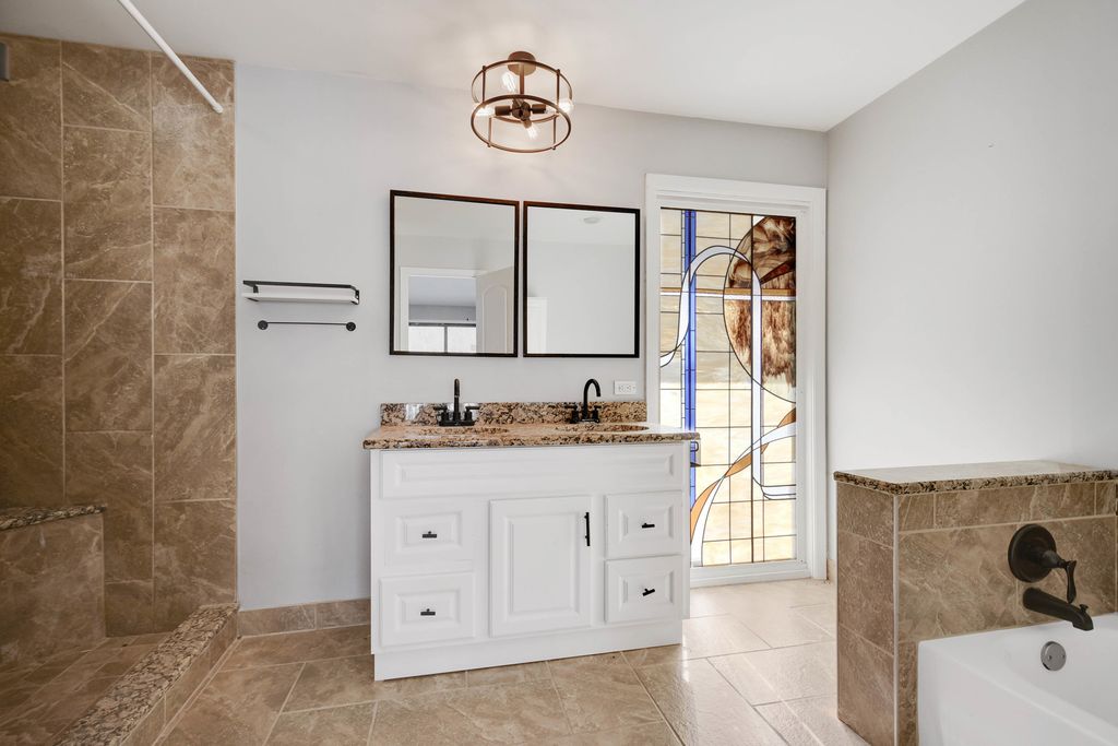 From the moment you arrive, this unique Contemporary Chalet-inspired neo-modern two-story captivates with its individually crafted design and numerous updates throughout. Step inside to discover an efficiently designed, recently updated, softly decorated interior featuring modern white trim, doors, and recessed lighting throughout. A graciously welcoming foyer flows into a large living room with a fireplace and expansive three-panel patio doors leading to a deck and a large fenced backyard. Right next to the living area is a beautifully appointed, updated kitchen offering modern white cabinetry, sleek quartz countertops, stainless steel appliances, an island with sink and breakfast bar, plus a more formal dining area. A second set of patio doors leads to a covered back patio. Three main-level bedrooms include an ensuite bedroom. The staircase, accented by large stained-glass windows, leads upstairs to a private primary bedroom featuring a soaring, elevated beamed ceiling and a spacious private bathroom with double-sink vanity, large shower, and separate tub. A full finished, loft-style basement provides additional space for indoor entertaining, a home office, guest bedroom, or ample storage. Popular and peaceful "Oakwood Estates" location near downtown Crete offers a charming small-town feel. Easy to see and ready for its next owner so schedule your private showing before this rare find is gone.