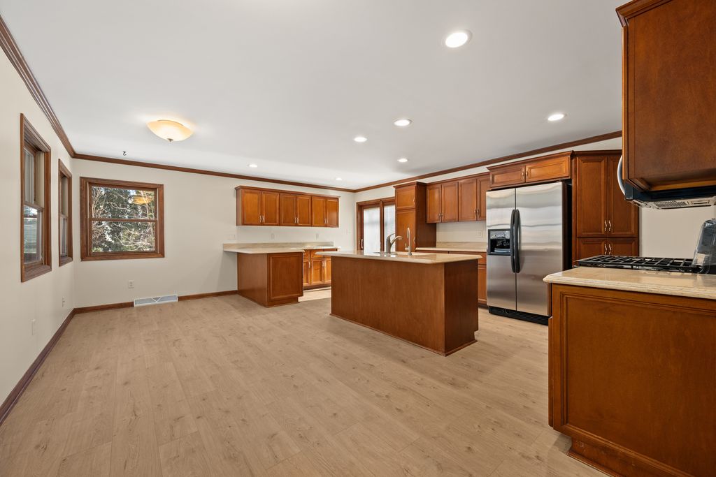 Step into a bright and inviting home where style meets comfort. The eat-in kitchen is a true showstopper, featuring rich cherry cabinetry, sleek Corian countertops, brand-new stainless-steel appliances, a pantry, center island, dual breakfast bars, and generous space for both casual seating and a full dining table-perfect for entertaining. The spacious living room is filled with natural light and showcases new wood laminate flooring, creating a warm and welcoming atmosphere. An updated bathroom offers convenient access from the primary bedroom. Fresh paint, new laminate flooring, and new carpet throughout make this home completely move-in ready. The basement includes a partially finished 3/4 bath and is ready for your finishing touches to add even more living space. Sliding doors from the kitchen open to a wraparound deck overlooking a beautifully landscaped yard. An attached one-car garage with a new garage door completes the package. Ideally located near schools and parks, this home checks all the boxes.