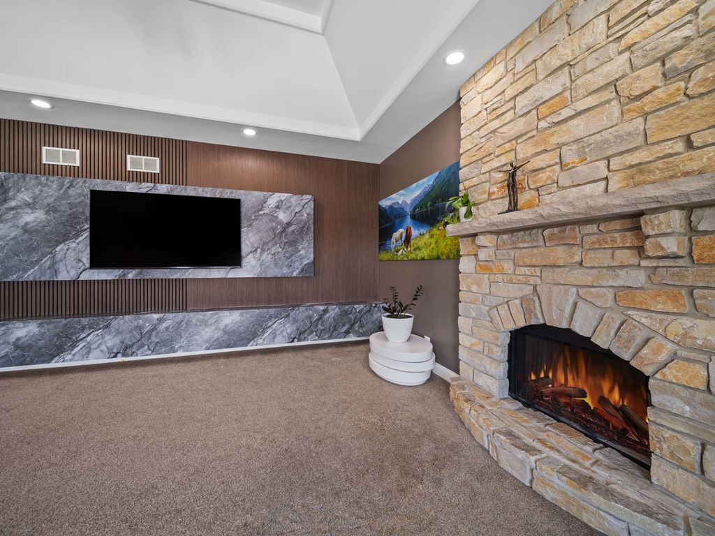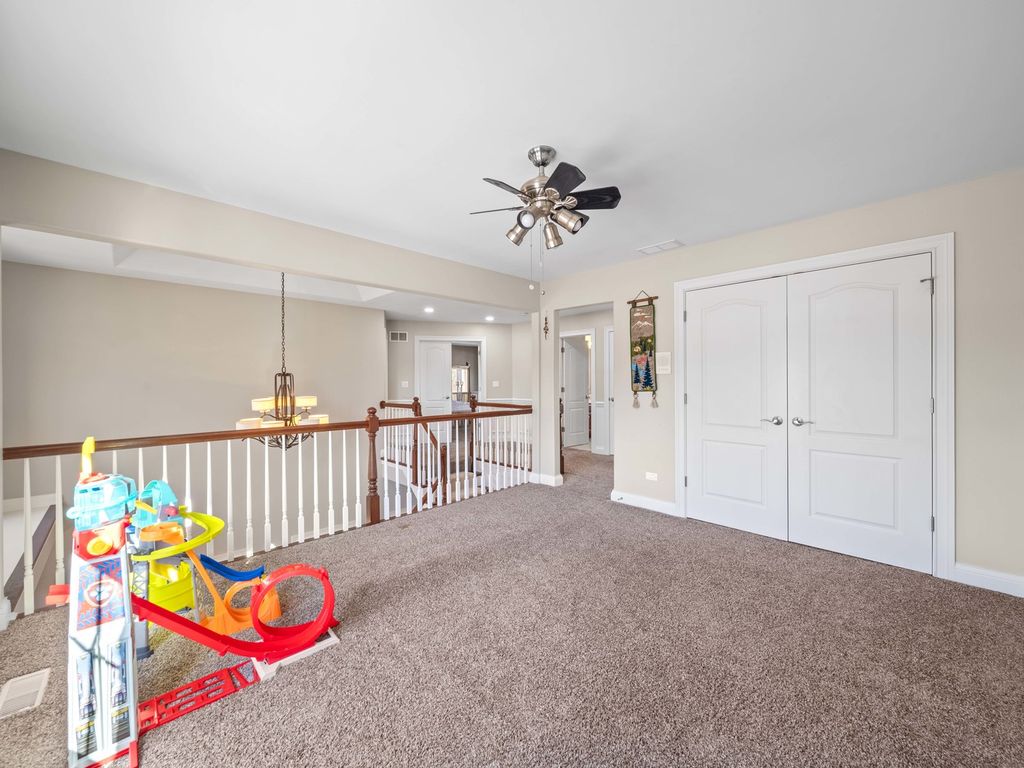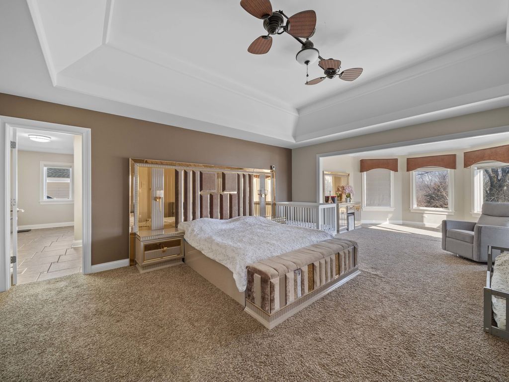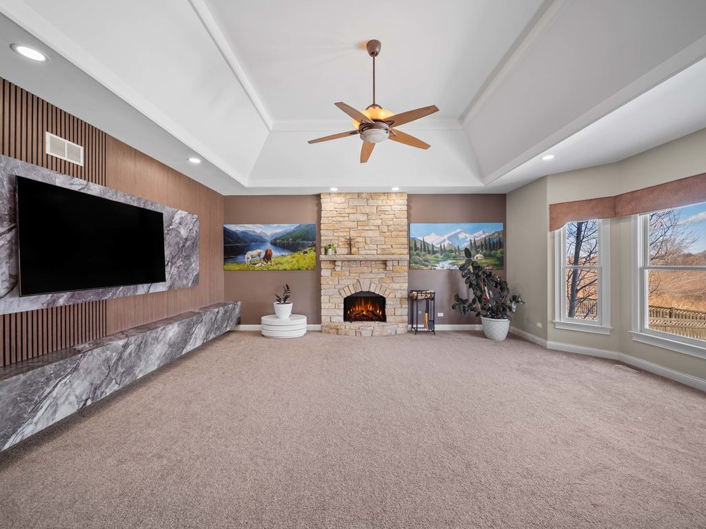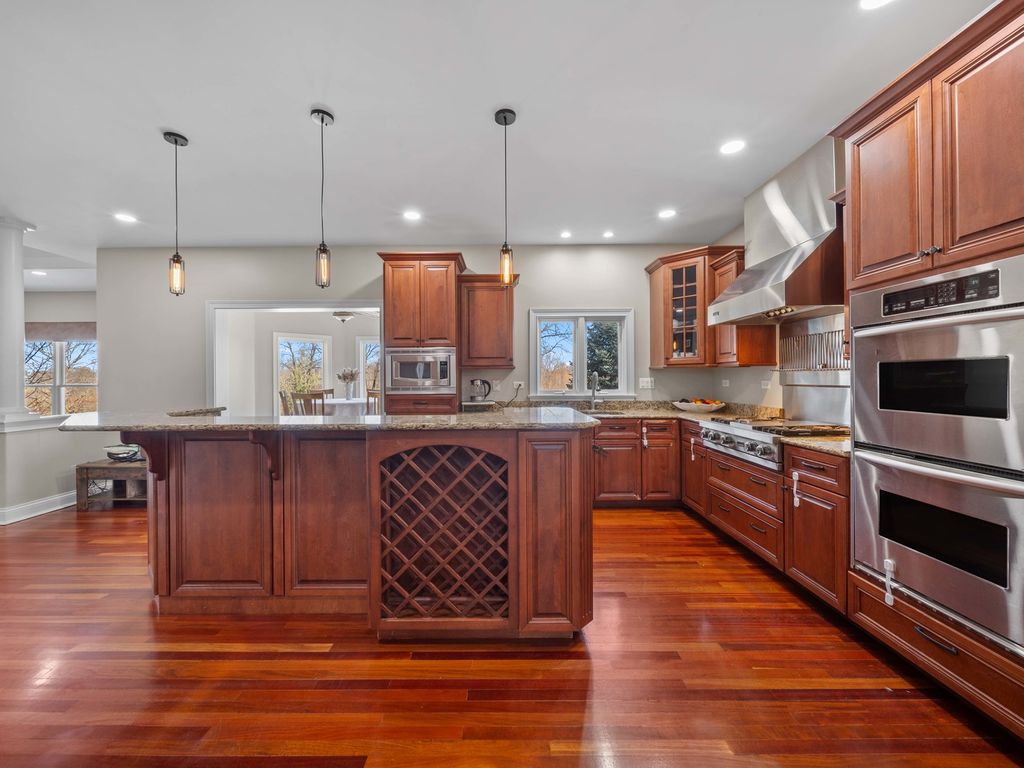 Luxury meets comfort in this stunning North Plainfield custom home, perfectly situated on a premium lot overlooking open prairie and peaceful pond views. Designed for elegant living and effortless entertaining, the open floor plan showcases Brazilian cherry hardwood floors, a dramatic family room with 13-foot tray ceiling and stone fireplace, and a gourmet chef's kitchen featuring a massive island, granite counters, and top-tier appliances including Viking, Miele, and KitchenAid. The main level offers formal living and dining rooms, a private den, and a sunroom with direct access to the beautifully landscaped backyard. The lavish owner's suite includes a sitting area and spa-inspired bath with walk-in closet, while spacious secondary bedrooms and a versatile loft complete the second floor. The finished walk-out basement provides exceptional flexibility with a bedroom, full bath, kitchenette, and expansive living space-ideal for related living, guests, or a home business. Enjoy outdoor living with a deck, paver patio, lush landscaping, and full irrigation system. A rare opportunity to own a truly premium home in a prime location, close to shopping, dining, entertainment, highways, and transportation, and within highly rated Plainfield North High School boundaries.Updates: Furnace (2024), Dishwasher (2025), New mailbox (2024), Laundry appliances (2022), Water heater (2017).