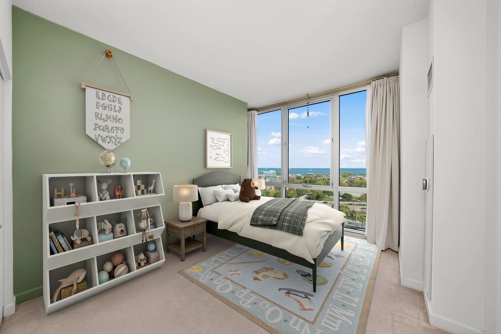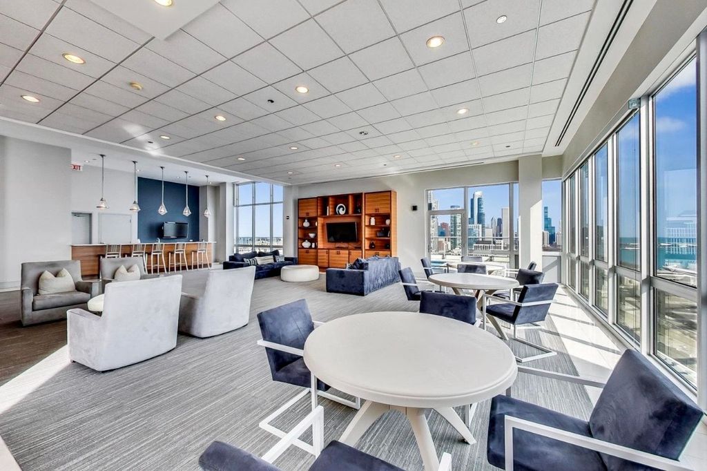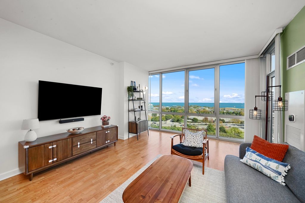 Enjoy postcard sunrises and expansive views of Lake Michigan from the floor to ceiling windows in this stunning split 2 bedroom + den, 2 bath condo at Adler Place! Walk in and be dazzled by the open concept kitchen featuring stainless steel appliances, crisp white 42" cabinetry with luxurious gold hardware and new white quartz countertops. Pull up a stool at the breakfast bar or flow seamlessly into the open concept dining room where engineered oak hardwoods and a designer chandelier await. Relax and soak up the sun in your well appointed living room or head out to the xl balcony perfect for relaxing with a cup of coffee/wine or for grilling and entertaining during the next big game or concert at neighboring Soldier Field and Northerly Island! Head back into the primary bedroom which easily fits a king size bed and showcases a generous organized walk-in closet. The attached ensuite features a double vanity w quartz countertop, upgraded lighting and spacious walk-in shower. The guest bed easily fits a queen and the guest bath features a new vanity w/ quartz countertop, updated shower hardware and lighting! For the work from home crowd, start your day from the comfort of the fully customized and built-in home office in the den. Adler is a full amenity building with 24/7 doorstaff, full time on-site property management, maintenance and engineering, a massive sundeck and party room, outdoor pool with skyline views, a well equipped fitness center, extra storage and a heated on-site garage. Ideally tucked away in the heart of Prairie District near local favorites Spoke&Bird and The Staley and just steps to the bike & jogging path, Soldier Field, Northerly Island, Women's Park & Garden, Mariano's and much more!