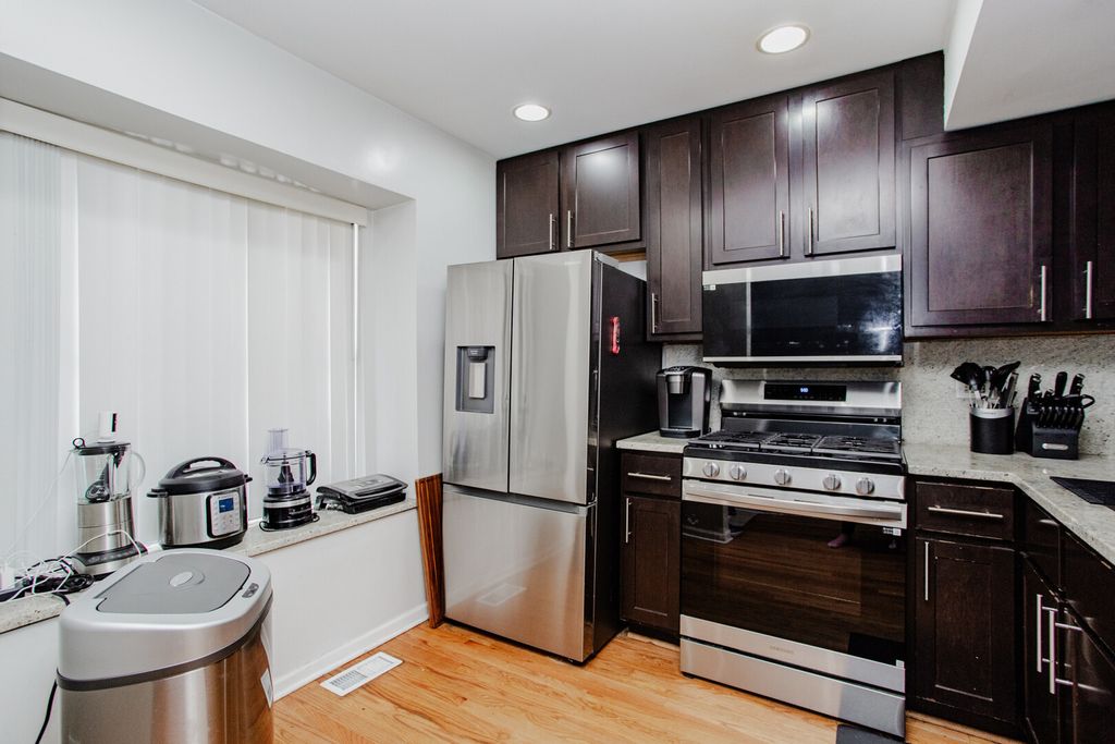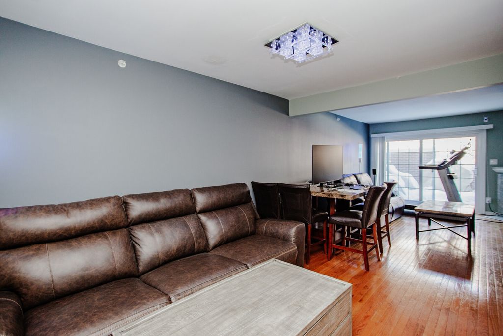 Live/Work space in Downtown Skokie. Rare mixed-use townhouse with f simple ownership (homeowners association fee) in the heart of downtown Skokie, steps to restaurants, shopping, bus, train, and easy highway access. Street-level COMMERCIAL / FLEX SPACE with half bath-ideal for medical, spa, yoga, law, real estate, retail, tech, or other client-facing businesses. Direct indoor access to one owned parking space in a secured attached heated garage with ev charger. Upper levels offer 2 bedrooms and 2 full baths. The main living area features modern hardwood floors, a spacious living room with gas fireplace as a striking focal point, and light-filled sliding glass doors to a private patio. Chef-quality kitchen with 13-month-old appliances, beautiful cabinetry, granite countertops, and open pass-through breakfast bar with seating. Flexible layout with excellent natural light and courtyard access. Live upstairs and work below, lease the commercial space for income, or explore conversion options (subject to approvals). Prime location with built-in flexibility and income potential.