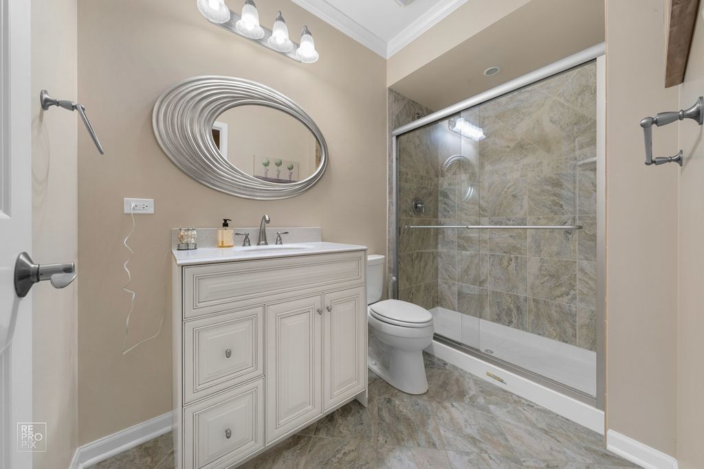 Rarely available luxury townhome in a premier location just steps from Stratford Square. This refined residence features solid hardwood flooring throughout the main and second levels, complemented by luxury vinyl tile in the fully finished basement. A dramatic two-story living room creates an impressive first impression and flows effortlessly into the family room, kitchen, and dining areas-perfect for elegant entertaining and everyday comfort. The chef's kitchen offers granite countertops, stainless steel appliances, walk-in pantry and sun-filled eating area with sliding glass doors that open to a private patio. The upper level is anchored by a luxurious primary suite featuring a spacious sitting area, dual walk-in closets, and a spa-inspired ensuite with double vanity, soaking tub, and separate shower. A generously sized secondary suite includes its own walk-in closet and private bath. The finished basement adds approximately 900 square feet of versatile living space, ideal for a guest suite, home office, or recreation area, complete with a full bathroom. Plenty of space remains for thoughtful storage. All appliances are included. Exceptional proximity to upscale shopping, dining, and entertainment, with convenient access to Route 20, the Elgin-O'Hare Expressway, and I-355.