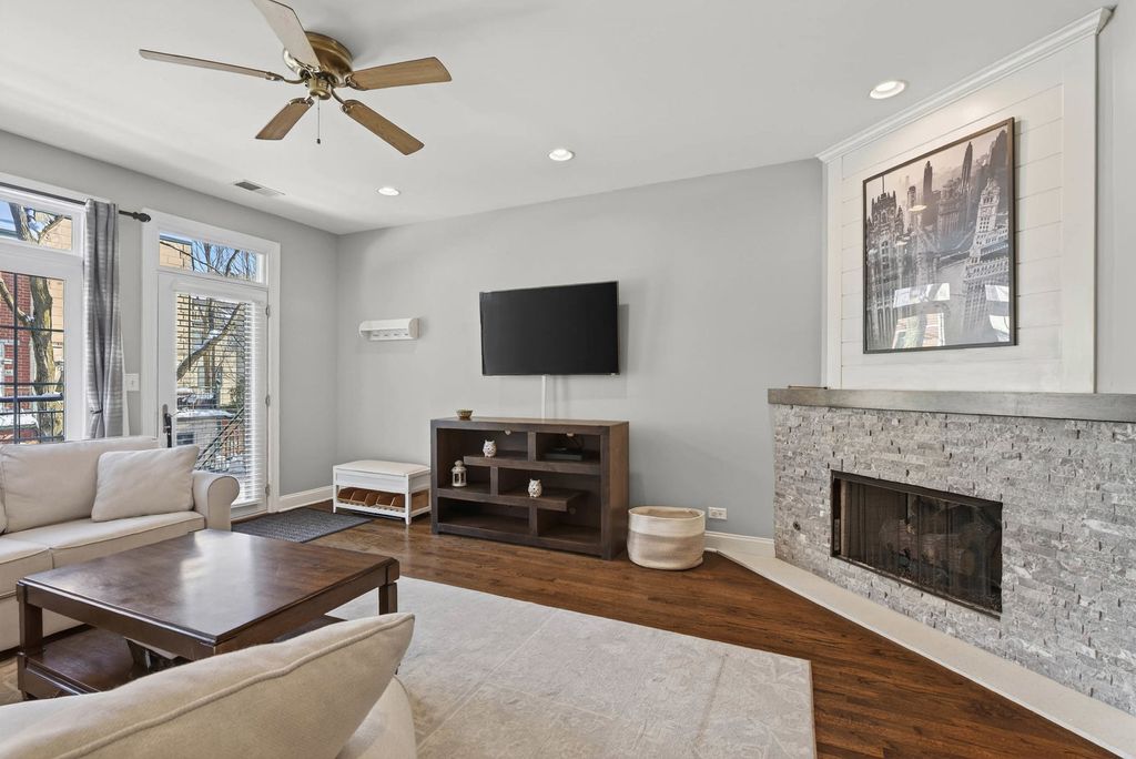 Beautifully updated three-level townhome located within the gated Dearborn Village courtyard, offering the space and privacy of a single-family home in the heart of the South Loop. The open-concept main level features hardwood floors throughout, a gas fireplace, dedicated dining area, and direct access to a front balcony overlooking the landscaped community courtyard. Designed for exceptional outdoor living, the home also includes an updated rooftop deck with composite decking-ideal for entertaining or relaxing. The spacious primary suite includes a fully remodeled en-suite bath with double vanity, soaking tub, and separate shower. A refreshed second full bath serves the second bedroom, while the third-level bedroom offers flexible use as a home office, gym, or guest suite. Additional highlights include hardwood flooring on all levels, in-unit laundry, central HVAC with new air conditioning, and pet-friendly living. Two parking spaces are included-one attached garage space and one exterior space. Professionally managed association with low monthly assessments that include DirecTV and WebPass internet. Ideally located near Mariano's, Trader Joe's, CTA Red/Green/Pink Lines, Lakefront Trail, Soldier Field, Chinatown, Printer's Row, and convenient expressway access.