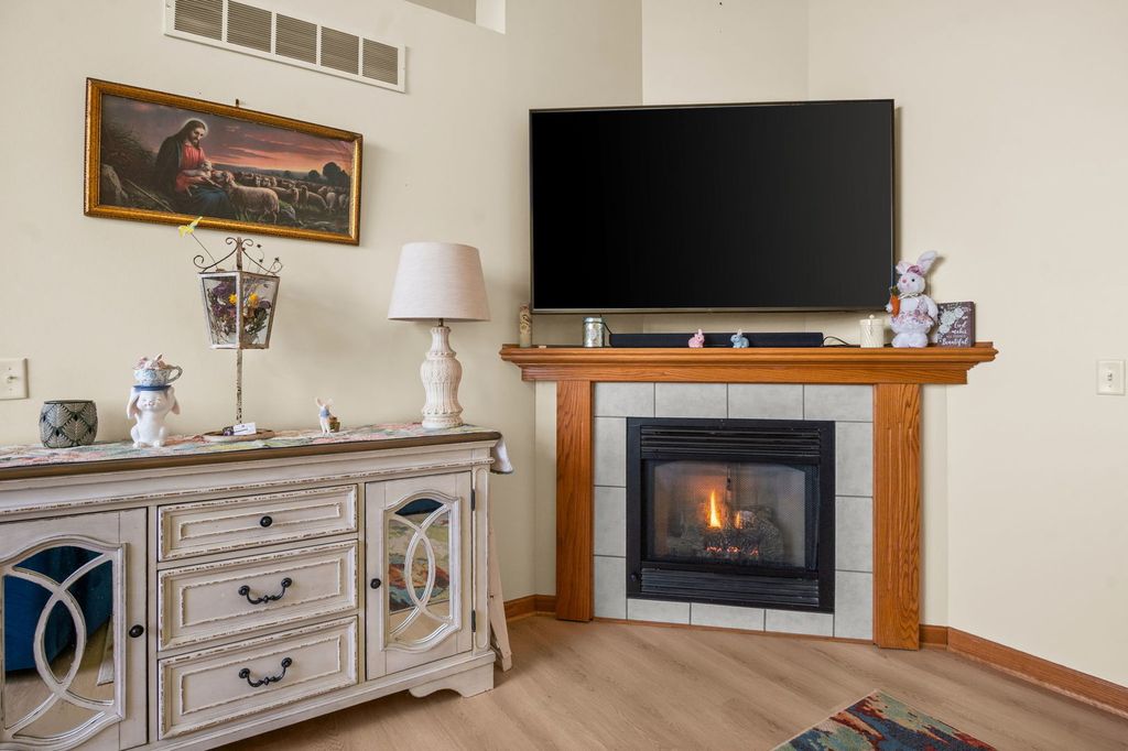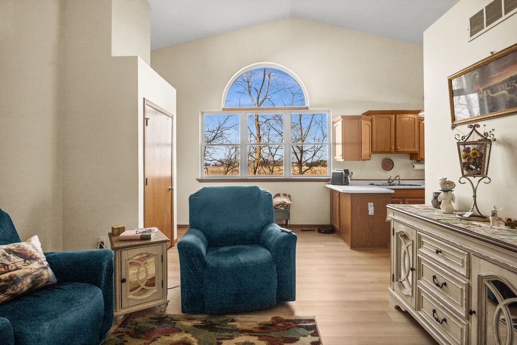 Tucked into the peaceful South Pointe Greens community of DeKalb, this vinyl and brick end unit ranch townhome offers serene wooded views with a creek running alongside the property, creating a quiet, private setting you'll love coming home to. Thoughtfully designed with handicap accessible doorways and an entrance ramp, the home features new vinyl plank flooring installed in 2021, a sump pump with battery backup added in 2020, and a water heater replaced in 2022. Inside, vaulted ceilings enhance the spacious feel of both the family room and kitchen, while the huge family room is anchored by a cozy gas log fireplace. The eat-in kitchen includes a dining area with a slider to the backyard patio, perfect for easy indoor-outdoor living. The main level also offers two bedrooms, a full hall bath, and a convenient laundry room. The finished basement expands your living space with a great room featuring a wet bar and second fireplace, a third bedroom, and another full bath, ideal for guests or hobbies. Outside, relax on the patio or enjoy the convenience of the one-car attached garage, while the HOA handles exterior maintenance, lawn care, and snow removal for truly low-maintenance living in a beautifully natural setting.