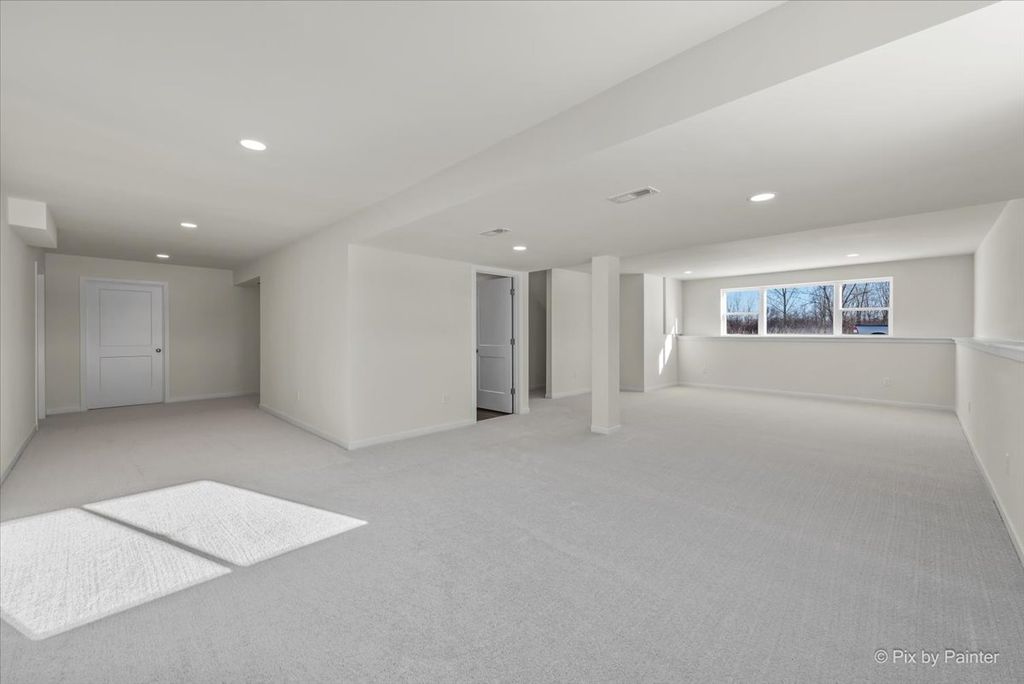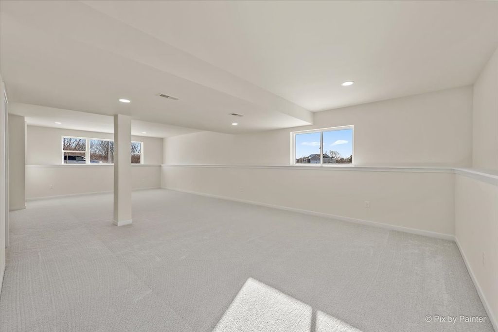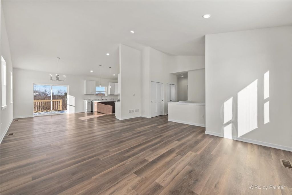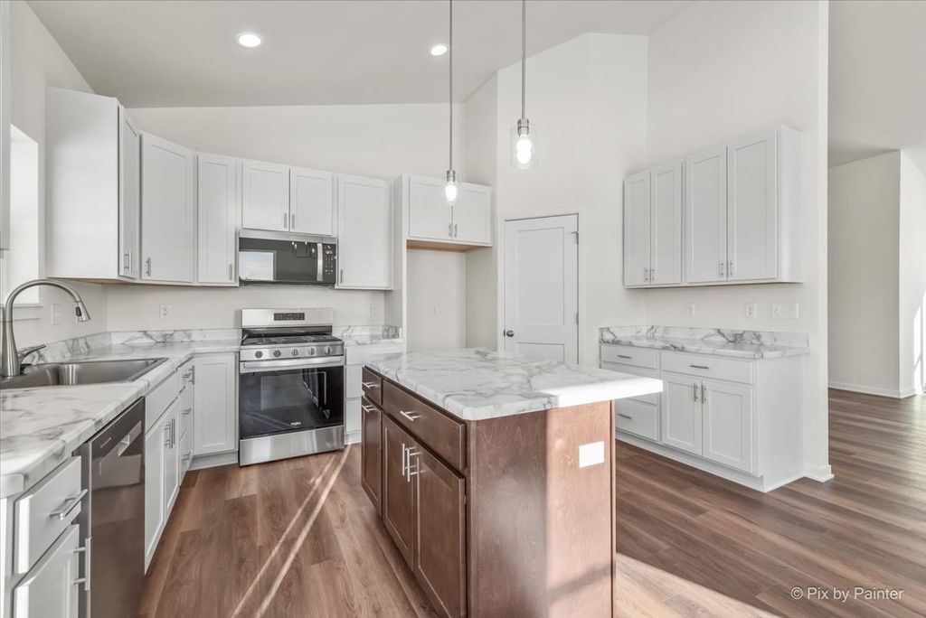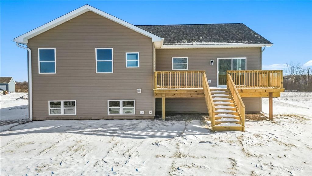 New construction - available now! 2,413 sq ft bi-level home offering a bright, open-concept layout with three bedrooms and three full bathrooms. The main living area features vaulted ceilings, luxury vinyl flooring, recessed lighting, and oversized windows that fill the space with natural light. The modern kitchen includes white cabinetry, stainless steel appliances, center island, and stylish pendant lighting that flows seamlessly into the dining and living areas, perfect for everyday living and entertaining. The full basement is partially finished, providing additional flexible living space. Enjoy outdoor living on the elevated rear deck. Conveniently located on the north side of Harvard with easy access to downtown, Metra, and the Geneva Lakes area, including the Fontana beach. Own quality new home for less than the cost of rent!