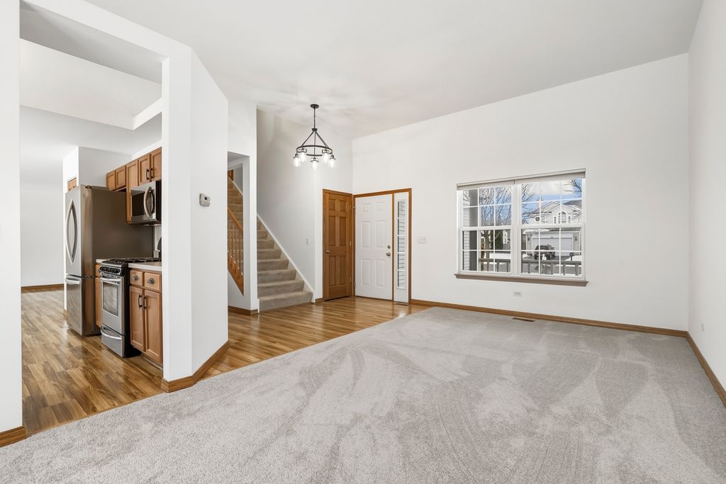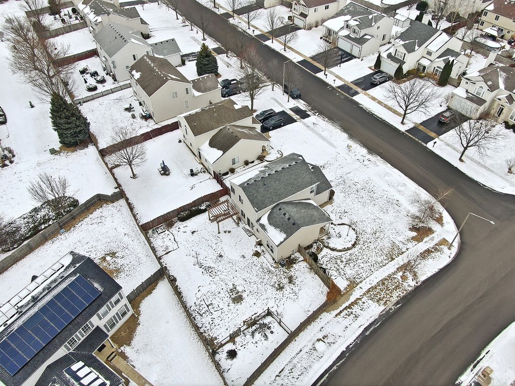Welcome home to this impeccably maintained, move-in-ready residence situated on a spacious corner lot in the heart of Plainfield. A charming covered front porch invites you into an open-concept main level, where a seamless living and dining combination creates the perfect atmosphere for entertaining. The heart of the home features a large eat-in kitchen equipped with stainless steel appliances, flowing effortlessly into a sun-drenched family room. Convenience is key with a main-floor laundry room and a powder room, both featuring updated tile work completed in 2024, providing direct access to the 2.5-car attached garage which comes ready for the future with an installed EV charger. Step through the newly replaced sliding glass door to discover a private outdoor oasis within the fully fenced backyard. The expansive brick paver patio is anchored by a stunning pergola featuring a built-in bench and integrated planters, overlooking a large garden and lush landscaping. A thoughtful wood shed on the side of the home keeps your refuse bins neatly tucked away. The second floor serves as a bright and airy retreat, anchored by a primary suite boasting soaring ceilings, a cooling ceiling fan, a generous walk-in closet, and a private ensuite bath with fresh 2024 tile updates. Two additional oversized bedrooms and a second full hallway bath provide ample space for family or guests. For those seeking even more potential, the full unfinished basement offers a blank canvas for your storage needs or future living space. This home perfectly blends modern upgrades with functional design in a prime location.