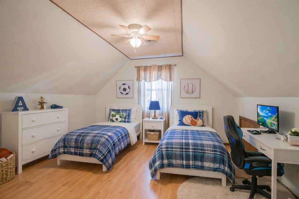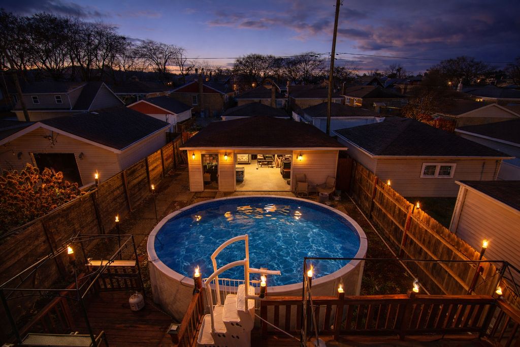 This solid brick Cape Cod in Garfield Ridge offers 4 bedrooms and 2 full bathrooms with a functional layout and future expansion potential. The main level features a bright living room and an updated kitchen with quartz countertops, stainless steel appliances, and ample cabinetry, along with two main-floor bedrooms. The upper level includes two additional bedrooms, hallway storage, and a central storage area, with plumbing nearby allowing for a potential second-floor bathroom. A finished basement with full bath adds valuable living space and flexibility for recreation, office, or additional bedroom use. Exterior highlights include a fully fenced yard with swimming pool, ideal for entertaining and private enjoyment. A detached 2-car garage provides convenient parking and storage, while the yard layout allows for multiple outdoor uses. Conveniently located near Midway Airport with easy access to I-55 and major highways. Close to public transportation, parks, schools, shopping, dining, and neighborhood amenities, offering strong accessibility and everyday convenience.