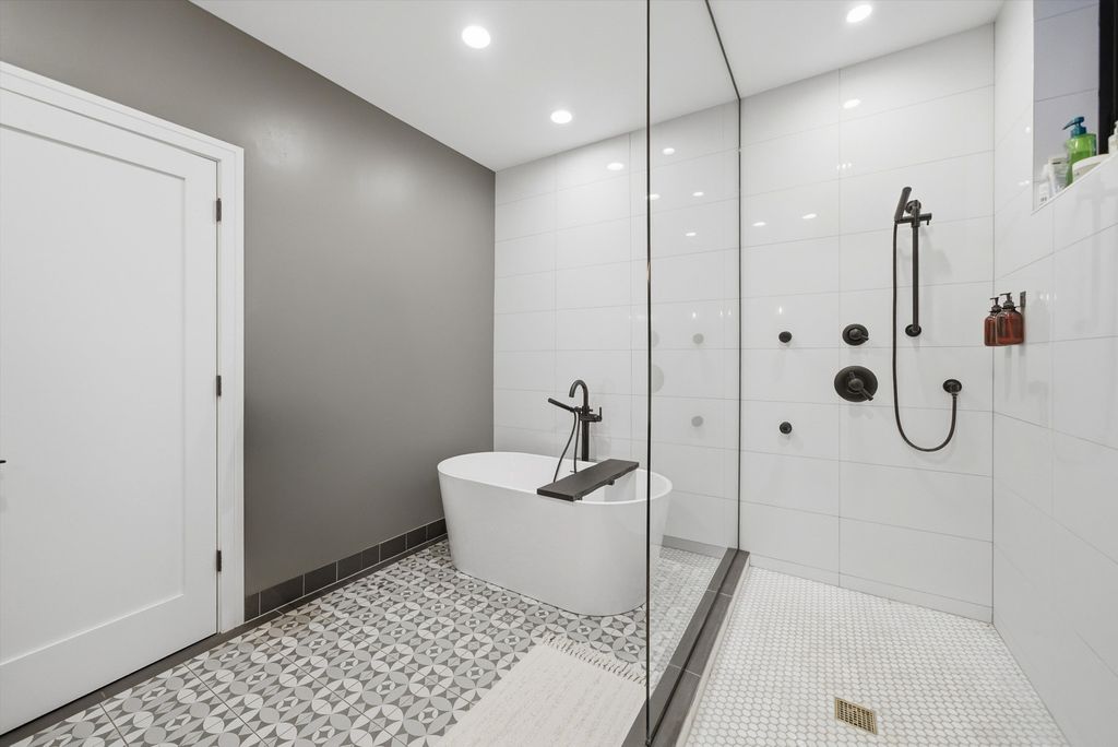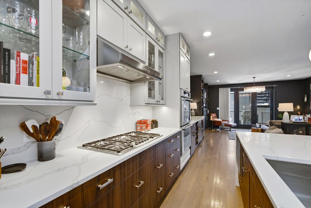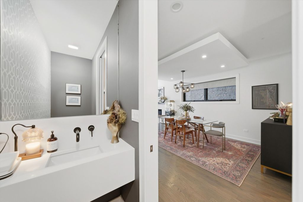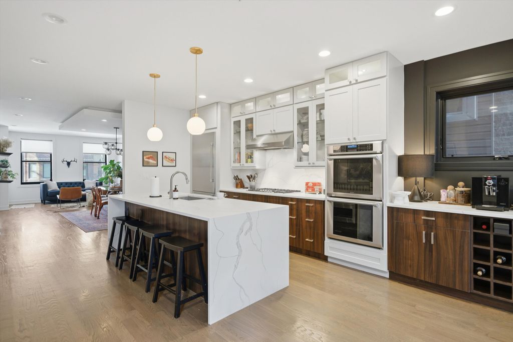 A standout, perfectly maintained duplex-down in East Village with space, privacy, and outdoor living that's almost impossible to find in a condo. Designed with a magazine-caliber sensibility, this three-bedroom, two-and-a-half-bath home lives like a single-family home and is built for both everyday comfort and entertaining. All of the living space is on the main level, where high ceilings, wood floors, and abundant natural light create an open, inviting feel. The living and family rooms each feature a fireplace, with the family room anchored by floor-to-ceiling built-ins. An extensive built-in wet bar with beverage fridge and wine storage makes this level ideal for hosting. The kitchen is outfitted with Thermador appliances, double ovens, transitional shaker cabinetry with upper glass-front detail, a full-slab backsplash, and an oversized waterfall-edge island. The space flows directly to a private deck with Trex decking, creating an easy indoor-outdoor connection. Hunter Douglas blinds and shades are installed throughout. The lower level is dedicated to the bedrooms, offering a quiet retreat from the main living areas. All three bedrooms are located on this level, including a spacious primary suite with abundant closet space and a huge spa-like bathroom featuring a massive walk-in shower, a freestanding soaking tub, a double floating vanity, and custom glass detailing. Radiant heated floors run throughout the lower. Updates include refreshed paint, designer lighting, and porcelain tile flooring in the lower level. Outdoor space truly sets this home apart. In addition to the main-level deck, the home includes exclusive ownership of a very private, finished garage roof deck with Trex decking over a three-car garage, complete with a pergola and a rare catwalk connection between the two decks. Both the front and rear yard areas feature professionally installed turf, offering low-maintenance green space and even more outdoor flexibility. Set on a quiet, tree-lined block in a well-maintained all-masonry building with garage parking included, this home is just steps from Chicago Avenue's restaurant row, Division Street shopping, and nearby parks, with easy access to the best of East Village, West Town, and Wicker Park. A rare, no-compromise home offering space, outdoor living, and a true single-family feel - right where buyers want to be.
