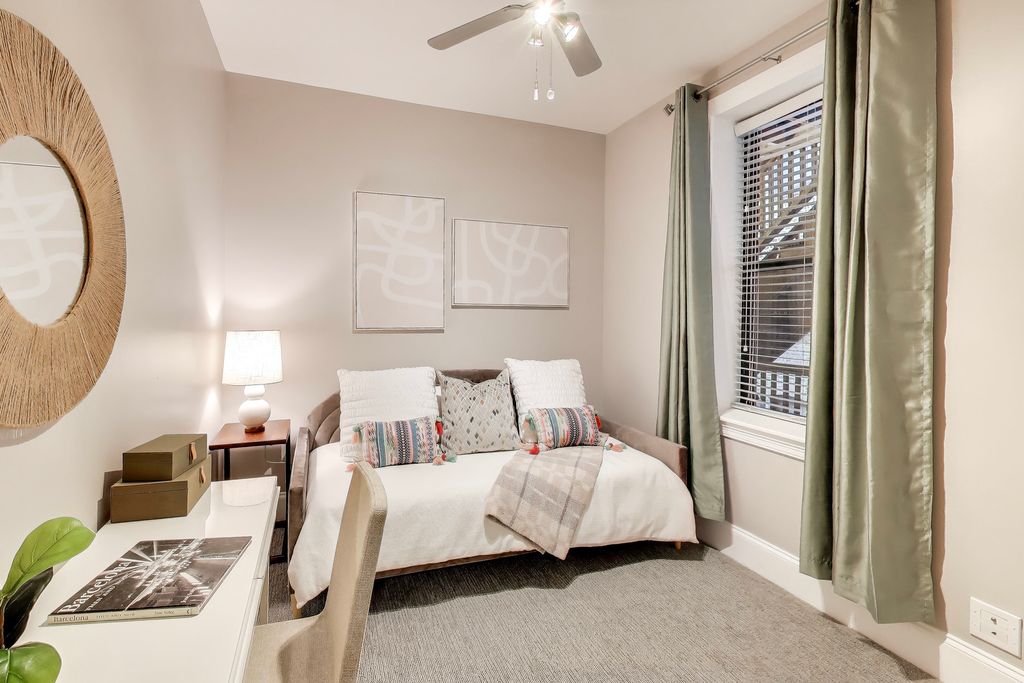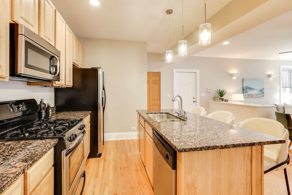 Bright and inviting 2 bed, 2 bath home offering a spacious layout, abundant natural light, and a private balcony in an unbeatable lakefront location. The spacious living room features oversized windows that fill the space with natural light and a flexible layout with room for a dining area or comfortable work from home setup, with hardwood floors throughout the main living areas. The large balcony overlooks a quiet residential setting and provides ample space for outdoor furniture, grilling, and entertaining. The open kitchen offers granite countertops, stainless steel appliances, generous cabinet and counter space, and a large island with room for counter seating and stools. Both bedrooms feature new carpet, ceiling fans, and generous closet space. The primary bedroom includes custom built in shelving, a large window for natural light, and an ensuite bathroom with a jetted tub and shower combination and in-unit laundry. The 2nd bedroom offers a flexible space ideal for a home office, guest room or nursery. A 2nd full bathroom and convenient coat closet are located just off the main living area. Freshly painted throughout and move-in ready, this home is located in a well maintained, self managed building on a quiet cul de sac at the end of the block. Steps from the beach where you can enjoy both sunrise and sunsets along the lakefront paths. Nearby dining, coffee shops, shopping including Target, the Red Line at Loyola and Morse, and Lake Shore Drive provide a convenient commute downtown or north.