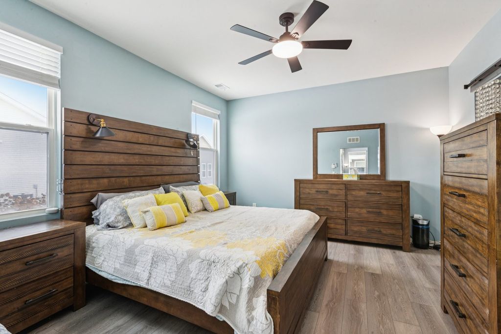 Discover a rare 2 bedroom plus den ranch packed with upgrades the builder never offered - including new LVP flooring, Samsung washer & gas dryer, LG 27 cubic foot fridge with craft ice, and Chamberlain smart garage door openers. The home also features four designer barn doors, a premium feature not available from the builder and added professionally after construction, including an impressive 8' glass panel barn door on the den. This is the only model with a 10' quartz countertop island, ideal for entertaining and everyday living. Natural light fills the home through 11 windows. Additional upgrades include a custom coffee bar, custom pantry and master closet systems, and an optional full Ring security suite. The premium 3car garage has been enhanced with 17" attic insulation plus added insulation to exterior walls, a heater, four extra outlets ideal for tools and projects, smart openers, and extra lighting. Outdoor improvements include an extended back patio, privacy screens, expanded front patio, river rock landscaping, and a raised garden bed. Located in an AirBnB friendly community, residents enjoy a brand new clubhouse and fitness center, resort style pool, splash pad, cabanas, and beautifully landscaped walking paths. No age restrictions on ranch homes.