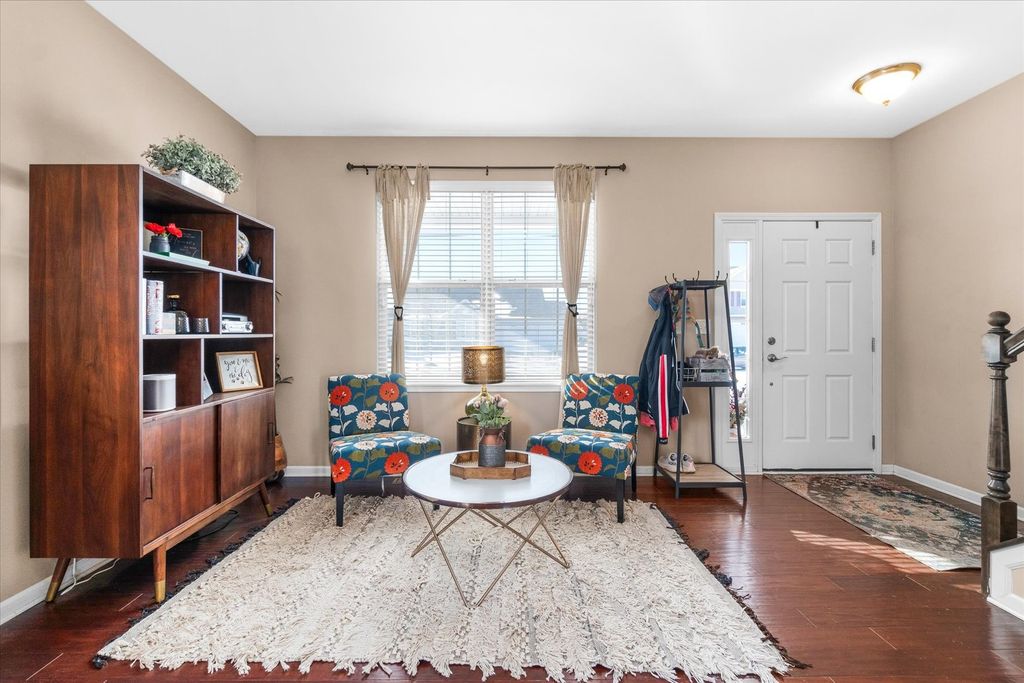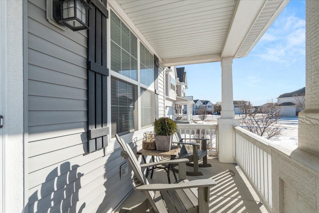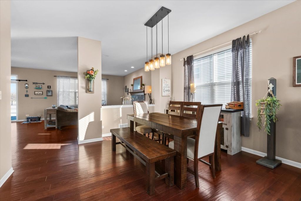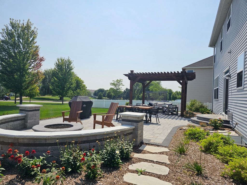 Welcome home to this beautifully appointed 4BR/2.5BA two-story in the Randall Highlands neighborhood of North Aurora, where space, style, and setting come together in all the right ways. Set on a landscaped lot backing to a park with pond views, this light-filled home features a covered front porch, brand new black aluminum fenced yard, neighborhood trails, and a 3-car garage. The backyard is made for relaxing and entertaining with a paver patio, gas firepit, and pergola. Inside, hardwood flooring spans the main level, highlighting a living room with stone-surround fireplace, adjacent dining room, and a huge family room that anchors the layout. The eat-in kitchen delivers on both function and storage with granite countertops, stainless steel appliances, tile backsplash, center island, walk-in pantry, and slider to the yard. A first-floor home office offers flexibility and could easily serve as a fifth bedroom. Upstairs, enjoy a bonus room complete with an 80" TV and 5.1 surround sound speakers included in the sale, plus four generous bedrooms highlighted by a primary suite with double closets and a deluxe bath featuring double bowl vanity, soaking tub, and separate shower. You will also love the second-floor laundry with utility sink. The full basement includes a rough-in for a future bathroom, and the home offers easy access to interstate, shopping, dining, parks, and schools. With a great layout, loads of kitchen storage, abundant natural light, and a welcoming family neighborhood vibe, this one truly checks all the boxes.