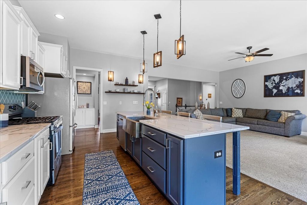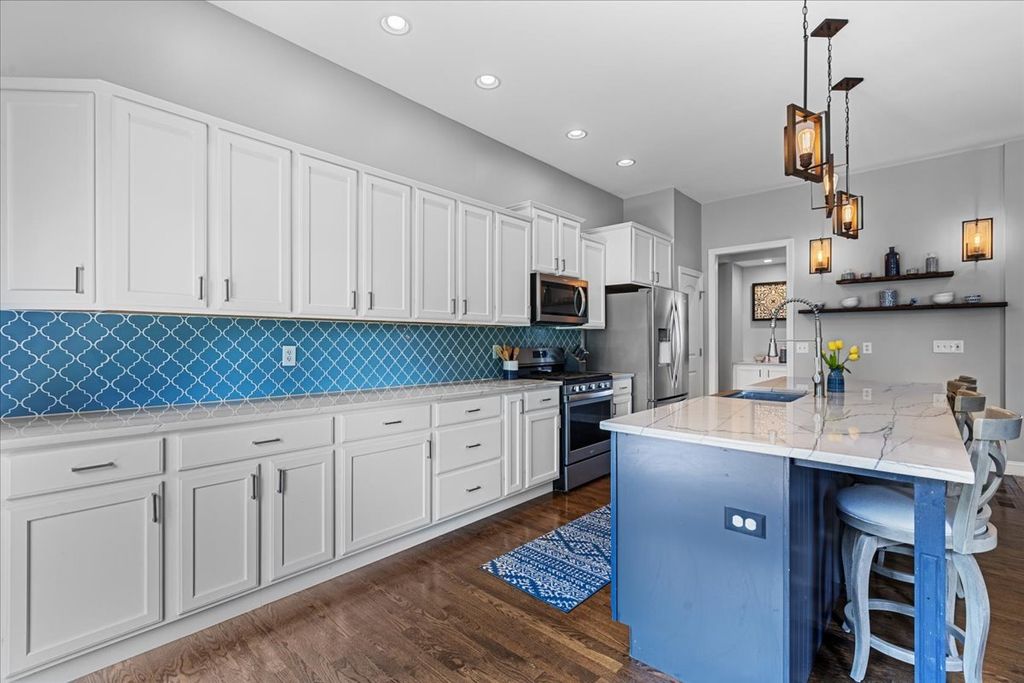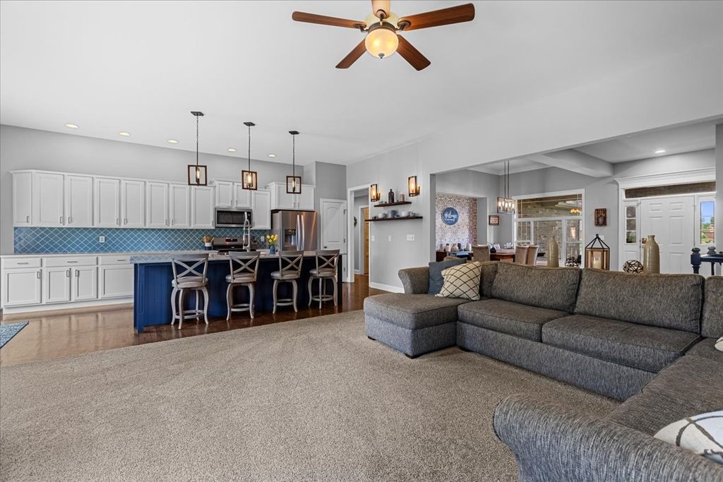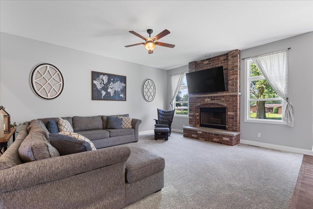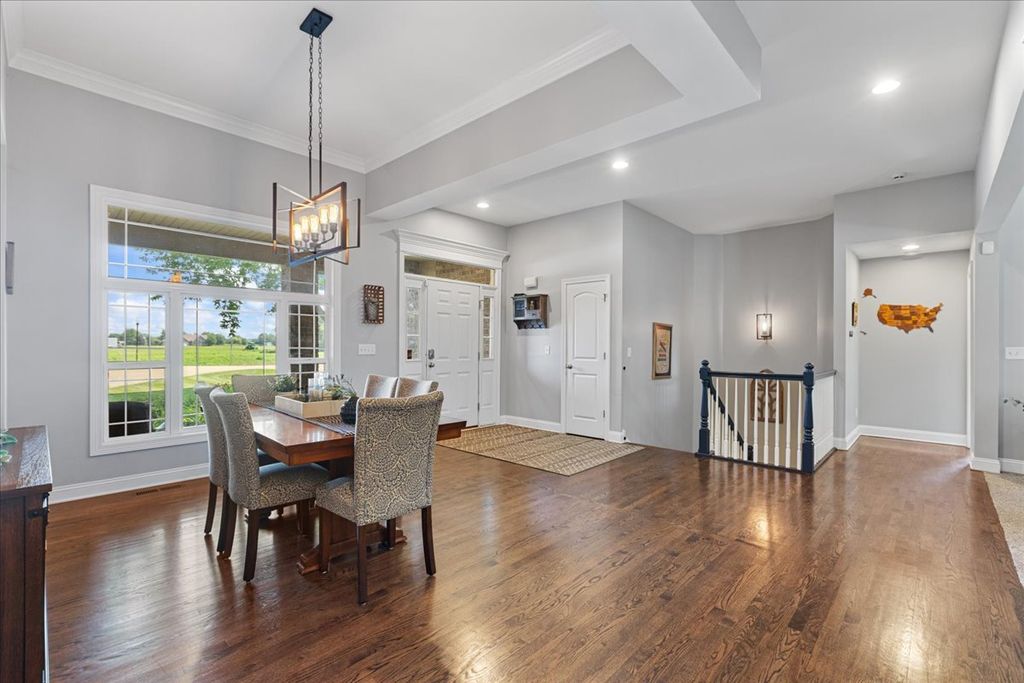 * Multiple Offers Received, Highest and Best Offers Due 3/3/26 at 12pm* Welcome Home! This stunning 4 Bedroom, 4 Bath residence offers over $150,000 in premium upgrades and sits on a professionally landscaped lot surrounded by mature trees. From the moment you walk in, you'll notice the open floor plan, hardwood flooring throughout the main level, and 9ft-11ft ceilings that enhance the home's airy, elegant feel. The spacious living room is anchored by a dramatic floor-to-ceiling masonry fireplace with gas starter, while the formal dining room provides the perfect setting for gatherings with a custom tiled wall. The renovated chef's kitchen is a showstopper featuring quartzite countertops, a ten foot island, top-of-the-line appliances, custom cabinetry, and a pantry. An additional new pantry was added in the laundry room providing even more storage for everyday needs. The smart split floor plan includes a private primary suite with double sinks, a separate shower, and a massive 12x12 walk-in closet. A second bedroom also boasts its own en suite bath, offering flexibility for guests or in-laws. The 3rd bedroom upstairs is right next to the 3rd full bath on the main level. The fully finished 9-ft deep basement adds incredible living space with LVP flooring throughout, a private bedroom and full bath, a dedicated home office, gym, and tons of storage. Step outside to your private retreat with an 18x18 paver patio and new fence, perfect for relaxing or entertaining. The 3-car garage offers extra space for vehicles, tools, or hobbies. Major updates include Roof (2023), Water Heater (2017), radon mitigation system (2019) and Ejector Pump (2017). This one checks every box-luxury, space, and exceptional upgrades inside and out! The neighborhood gives you the best of both worlds - close to town and stores, but also out in the country. The neighborhood makes a great place to walk, bike, or run in addition to taking young ones to the park down the road. Additionally, the adjoining neighborhood has a lovely lake that allows for more walking/running areas to explore. Don't delay make this your home today!