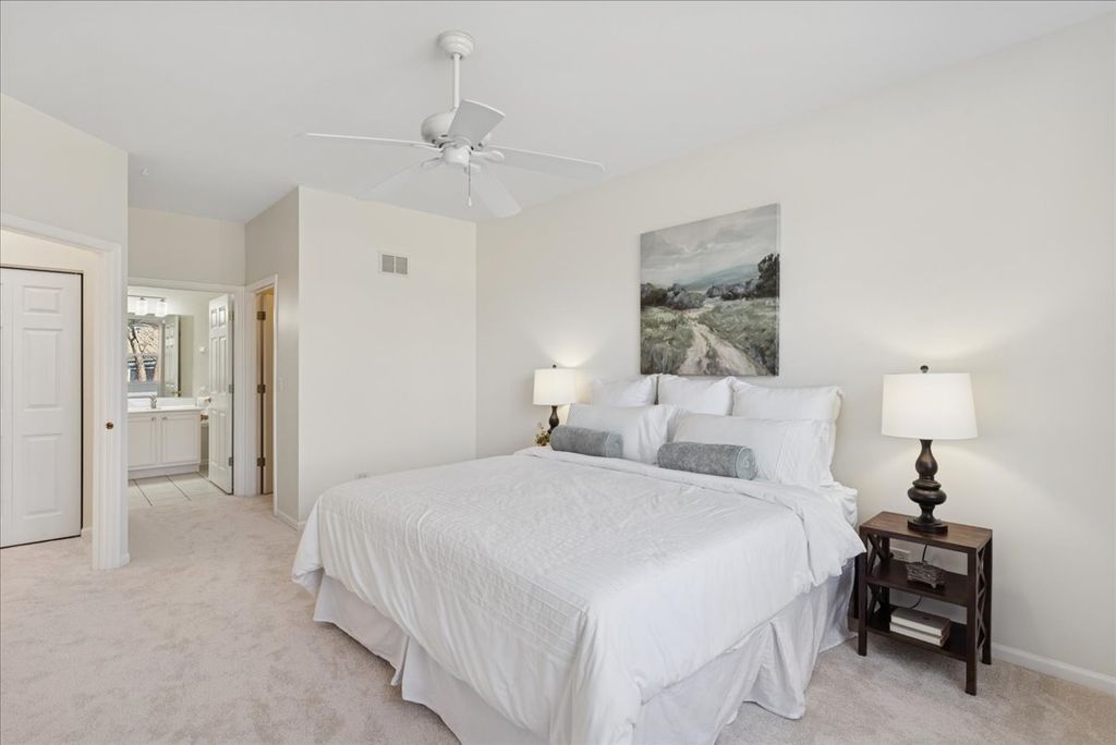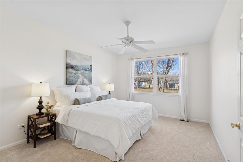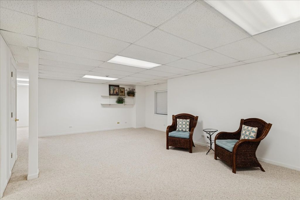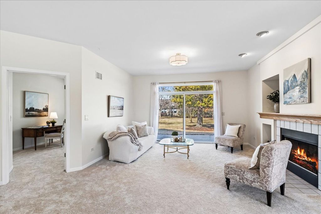 Welcome home to this beautifully updated premium end-unit ranch townhome in the highly sought-after 55 plus community of Carillon North-a place where you or your loved one can enjoy resort style living everyday. The spacious living room is bathed with natural light and features a cozy fireplace, creating a warm and inviting gathering space that is perfect for entertaining or just relaxing. It flows seamlessly into the dining area that is highlighted by a charming bay window. A sliding glass door in the living room opens to the backyard space, extending the living area outdoors and making it easy to enjoy fresh air and nature views. The bright and inviting kitchen offers ample cabinetry, generous countertop space, a pantry along with a comfortable eating area and direct access to another private patio-ideal for morning tea, casual meals, or enjoying fresh air. Down the hall, you'll find a spacious primary bedroom retreat with a private en-suite bath and a generous walk-in closet. An additional bedroom offers flexibility as a guest room, home office, or cozy reading nook. A convenient laundry closet nearby completes the space, adding everyday comfort and ease. The fully finished basement practically doubles your living area with a spacious family room, an additional bedroom, a full bath, large walk-in closet and a versatile flex room-ideal for a home gym, music room, office, or creative space-plus abundant storage, making it perfect for guests, hobbies, or relaxation. Recent updates include (2026) brand-new light fixtures, main level carpet, fresh neutral paint throughout, hot water heater (2019) creating an easy move-in transition. Living in Carillon North means enjoying an active 55+ lifestyle with exceptional amenities: a scenic golf course, tennis and pickleball courts, and a vibrant clubhouse featuring a heated indoor pool, hot tub, fitness classes, computer room, library, card groups, social clubs, and year-round events. Nearby walking paths and hiking trails add to the appeal. All of this, plus easy access to Metra, I-94, and fantastic shopping, makes this home a perfect blend of comfort, community, and convenience. Come live your best life at Carillon North!