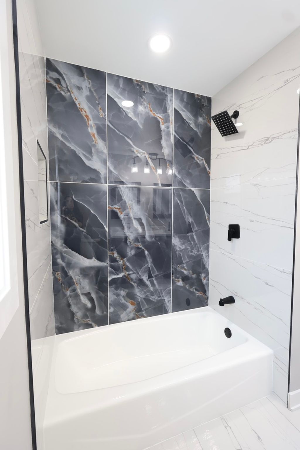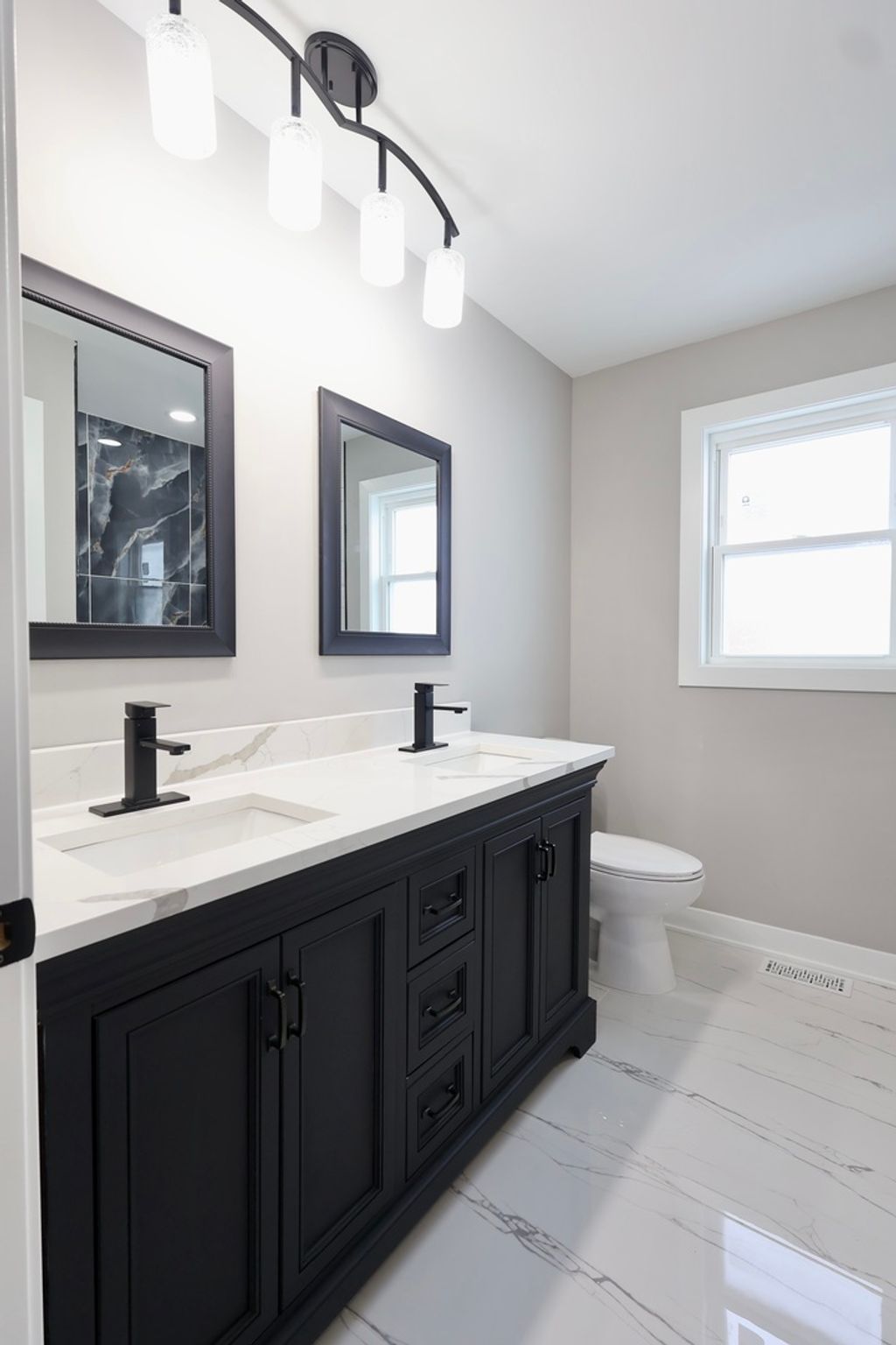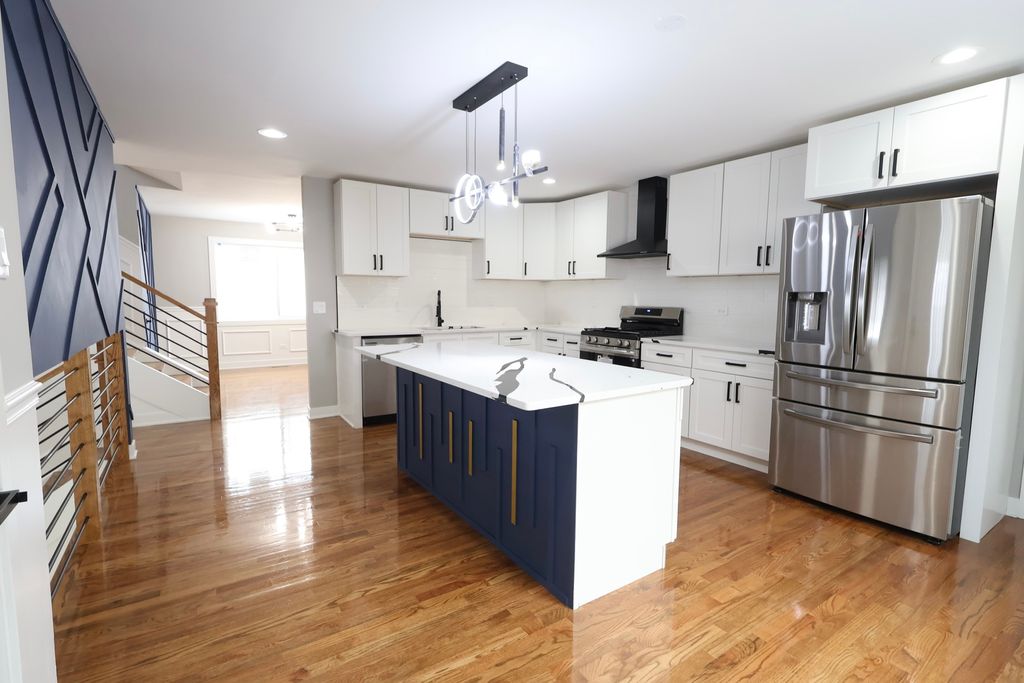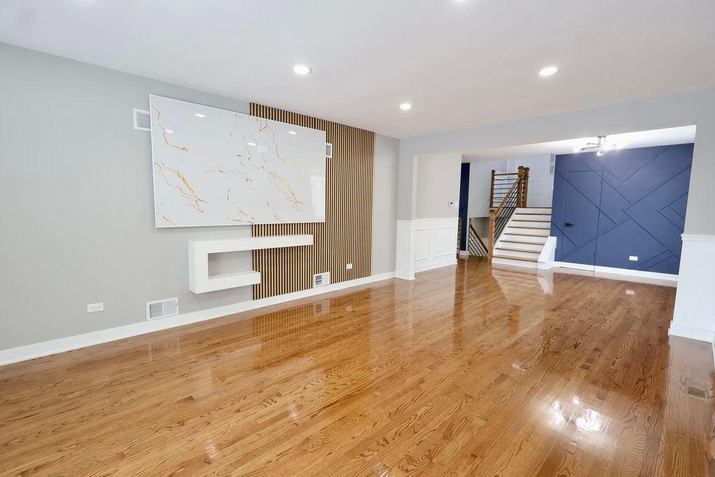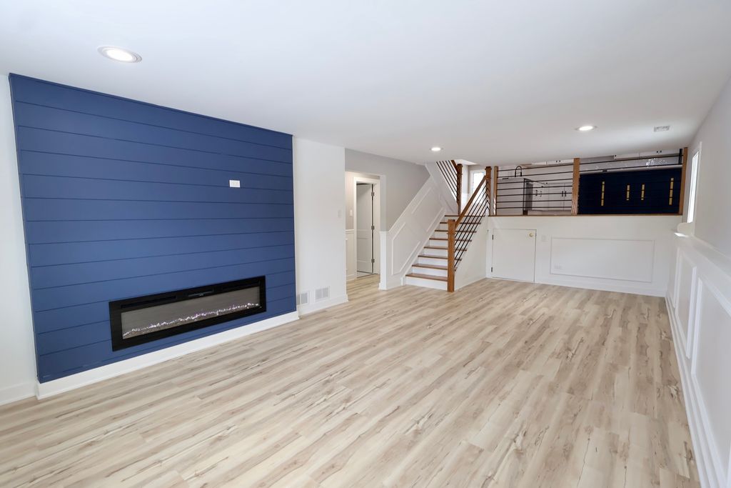 Beautifully updated split-level home offering modern design and thoughtful architectural details throughout. This 3-bedroom, 2-full-bath residence features an open-concept layout designed for comfortable everyday living and entertaining. The kitchen showcases custom cabinetry, quartz countertops, stainless steel appliances, and a large two-tone island with modern hardware and pendant lighting. The open layout allows the kitchen to flow seamlessly into the main living and dining areas, creating a bright and functional space. The main living area features a custom accent wall with a linear electric fireplace, along with additional designer accent details, recessed lighting, and an open staircase with contemporary railing. Hardwood flooring enhances the main level and complements the home's modern aesthetic. Both bathrooms have been updated with contemporary finishes, including oversized tile surrounds, modern vanities, matte black fixtures, and a walk-in shower with rainfall-style showerhead and built-in niche. The lower level offers a partially finished space suitable for a family room, home office, or flex area and includes protective shutter-style window coverings. Additional features include updated lighting, modern finishes throughout, and a 2.5-car attached garage providing ample parking and storage. This home presents a stylish, move-in-ready option with a well-designed layout and modern updates.