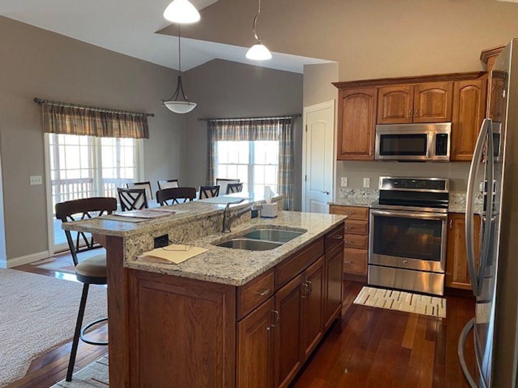 One owner Condo that exemplifies meticulous care and attention to detail. Design concept that is open and appealing. Lot has privacy to rear and nice views. Extra deep garage of 599 SF. Three bedrooms and 3 baths. Hardwood floors in foyers, laundry, kitchen and dining room. Tile floors in bathrooms. Stainless kitchen appliances, walk-in pantry, breakfast bar with stools. Sliders to screened porch. Very ample sized primary bedroom, large bathroom with double vanity, step-in tile shower and walk-in closet. Extremely attractive walkout basement featuring 11x29 bar room, rec room, third bedroom and 3/4 bath, plus daylight egress windows. Lawn irrigation system not active. Water pressure back-up sump pump. Roof replaced in 2023. Water heater 2025.