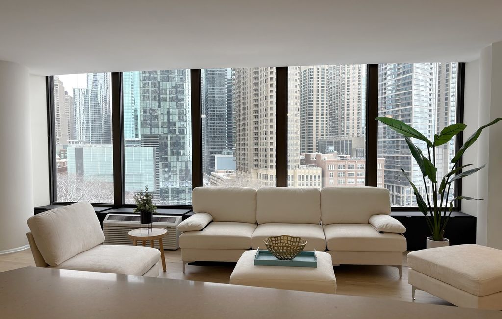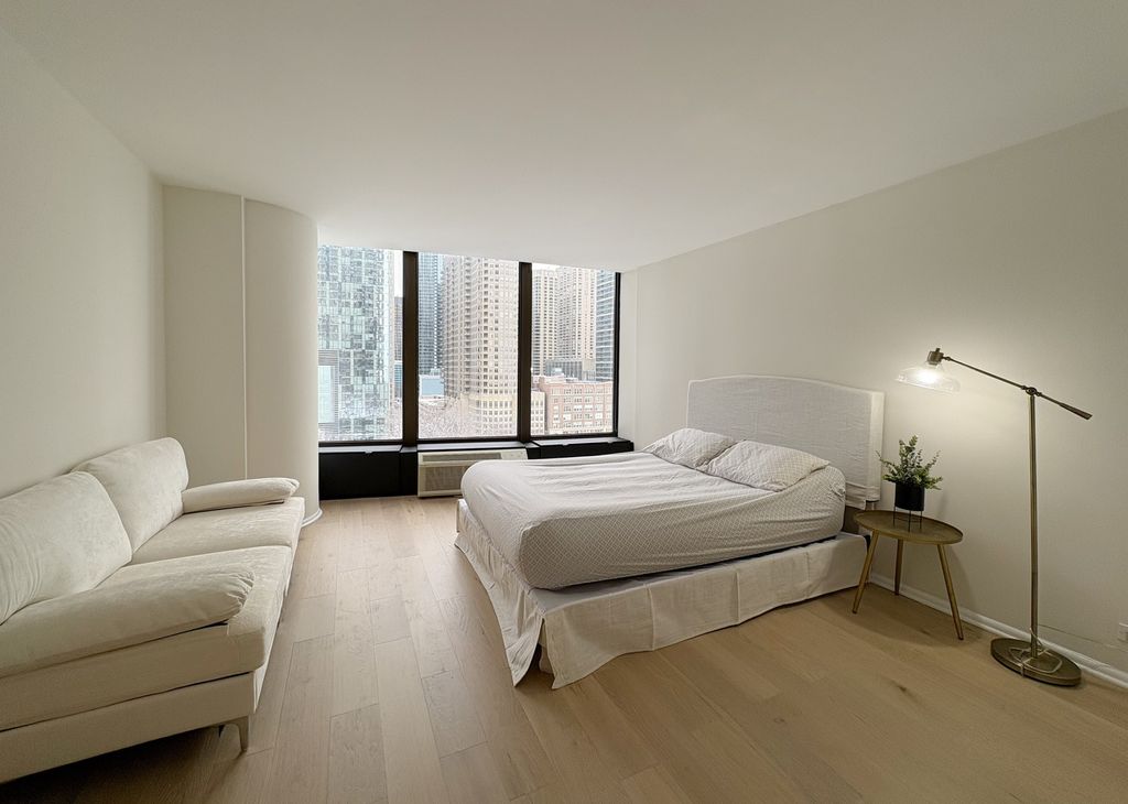 One of a kind 1,100 square foot 1 bedroom, 1 bathroom home at Lake Point Tower, the only residential building east of Lake Shore Drive. The moment you walk in you are greeted by a vast and welcoming foyer with coat closet and designer tile separating the living areas. As you stroll into the main living quarters, the stunning windows that run along the entire West, North and East of the home deliver views that Chicago is so famous for, the city skyline with greenery below and Lake Michigan to the side are all visible from your home. Day or night the views will continue to take your breath away! This home is beautifully remodeled & upgraded with brand new waterproof Oak/Hickory veneer hardwood flooring throughout the living room, dining room and bedroom. The home is freshly painted with a warm white tone paint color and the kitchen features gleaming gray Quartz counter tops, designer tiles, white shaker cabinetry, stainless steel appliances, custom lighting. The bathroom has a walk-in shower adorned with modern tiles and mosaic floor. Generous sized bedroom with large walk in closet. The building itself has it all! Like a little city of its own, it features amenities that include a 2.5-acre private park on the third floor that holds a newly redone outdoor pool area, grills, water falls, pond & children play area; indoor pool, hot tubs, racket ball/basketball court, state of the art work out room, community room, business center, 24 hr. door person, cleaners, laundry facilities, bike room, indoor children's playroom, small convenient shop, storage lockers and beauty salon. Minutes to Navy Pier, cinemas, restaurants, Northwestern Hospital, Post office, whole foods and Target.