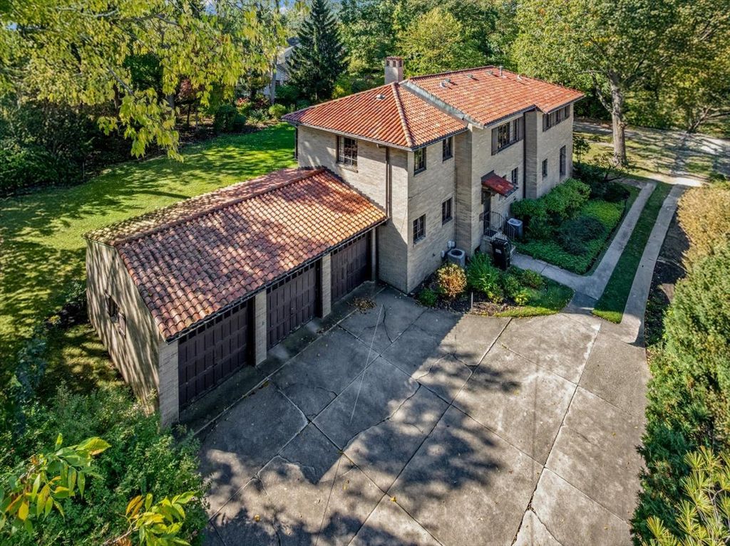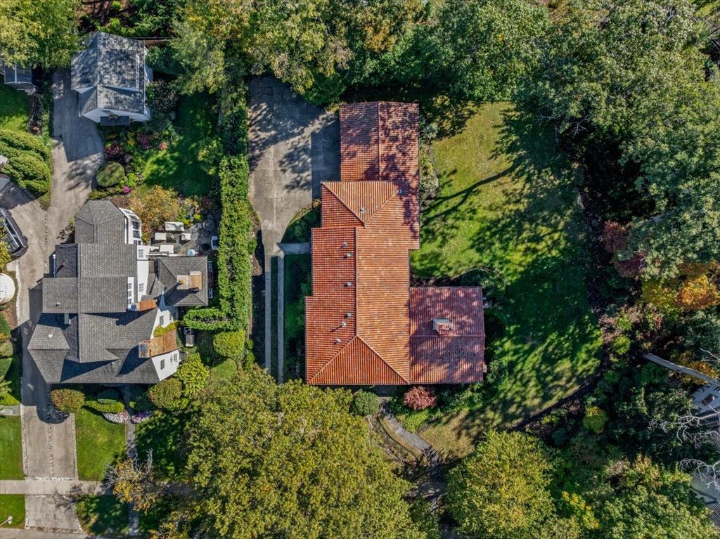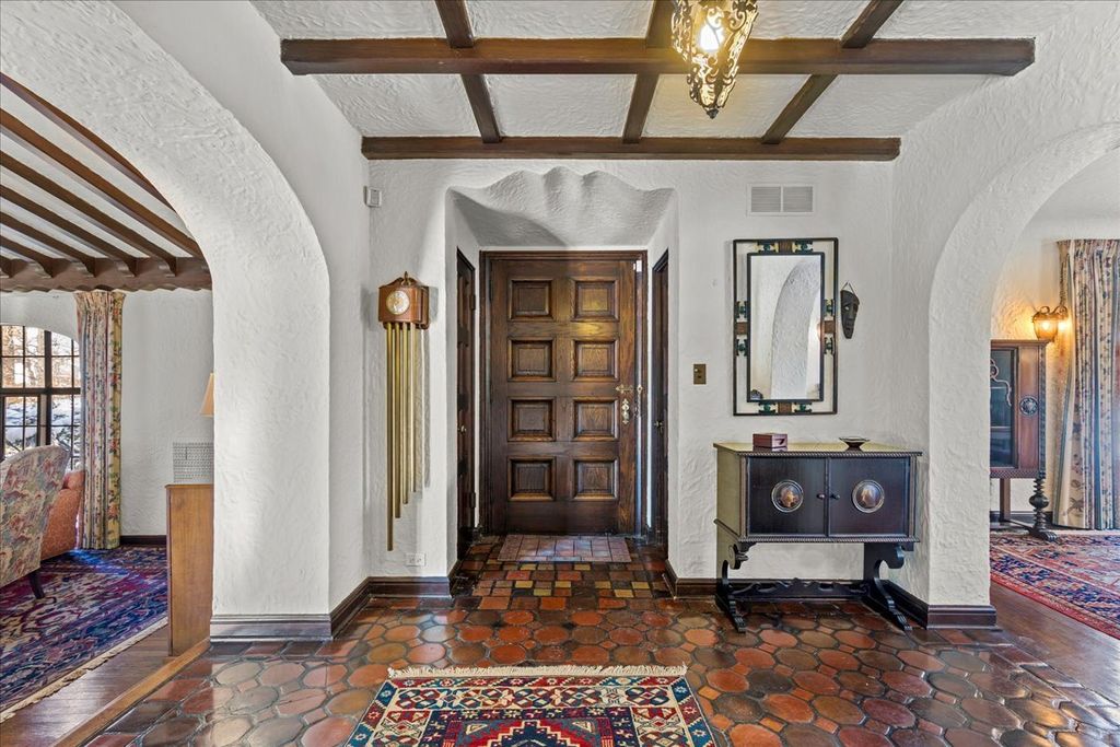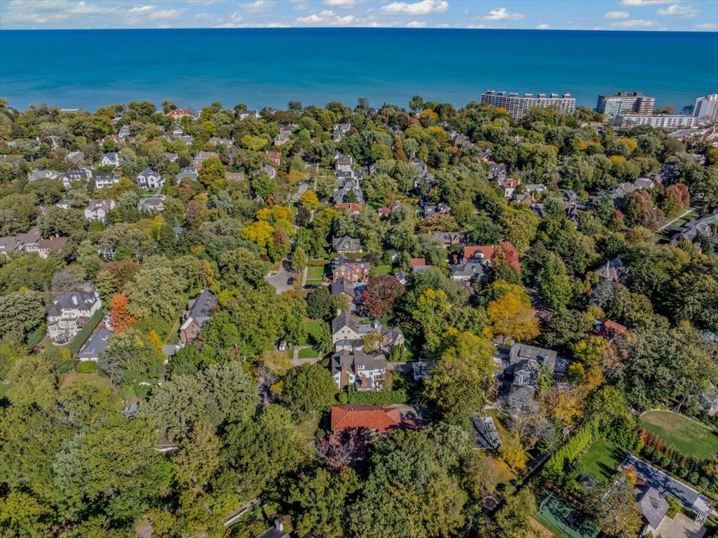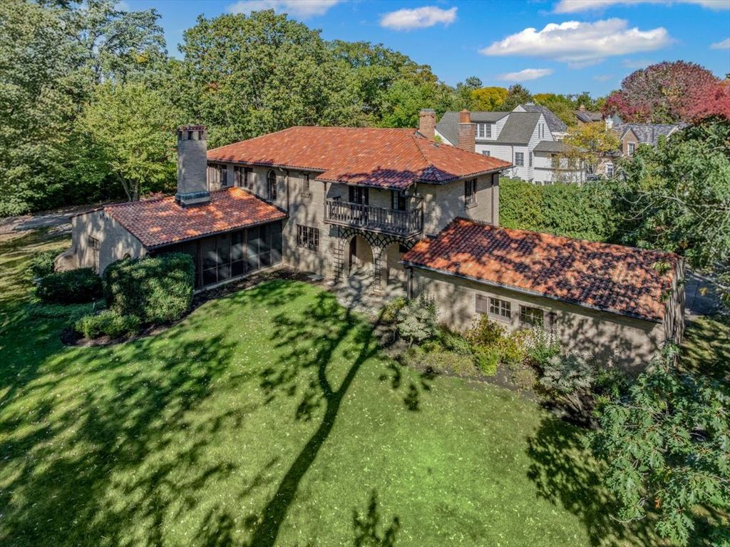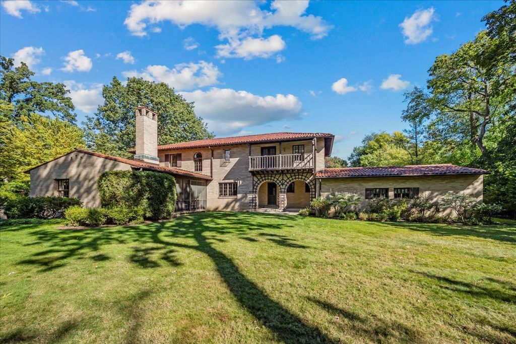 A RARE and highly coveted HALF-ACRE n the heart of East Kenilworth, this architecturally distinctive Spanish Revival residence offers timeless character, scale, and an exceptional setting just steps from Lake Michigan! This is a truly special property...rich in beauty, privacy, and potential. Set back on one of the prettiest and most private lots in town, the home is surrounded by mature trees, creating a serene and storybook backdrop in this prime location. A stately foyer welcomes you with dramatic arches and craftsmanship seldom seen today. The true showstopper is the grand vaulted living room, featuring soaring ceilings, rich wood beams, a massive front window, and a striking limestone fireplace...an unforgettable space suited for large gatherings or nights by the fire. A spacious formal dining room flows into the Butler's Pantry and kitchen. Gorgeous arched wood doors lead to the family room. At the rear of the home, is an enchanting screened-in porch overlooking the lush backyard...perfect for lazy afternoons and summer evenings, soaking up the peaceful surroundings. The first floor also offers an ensuite bedroom. A wide wrought iron staircase ascends to the second level, which hosts three generous bedrooms. The primary suite features an en-suite bath, a Juliet balcony and a dressing area. Another bedroom boasts a picture-perfect balcony overlooking the expansive backyard. 3-car garage. Steps to the beach: award-winning Joseph Sears School, New Trier High School, the Metra and the newly renovated Plaza Del Lago shopping and restaurants. Bring your imagination and vision to restore and elevate this gorgeous home back to its full glory! The house is being sold "ASIS"