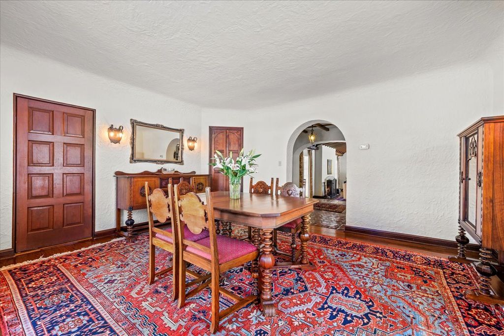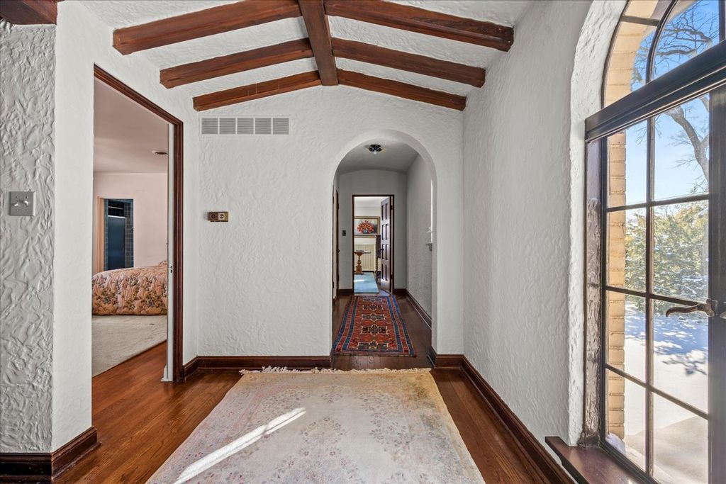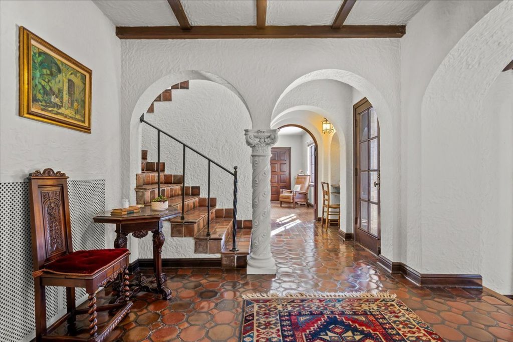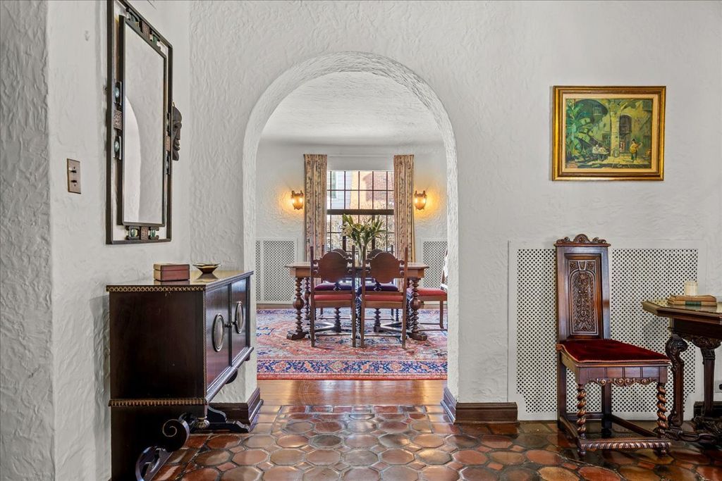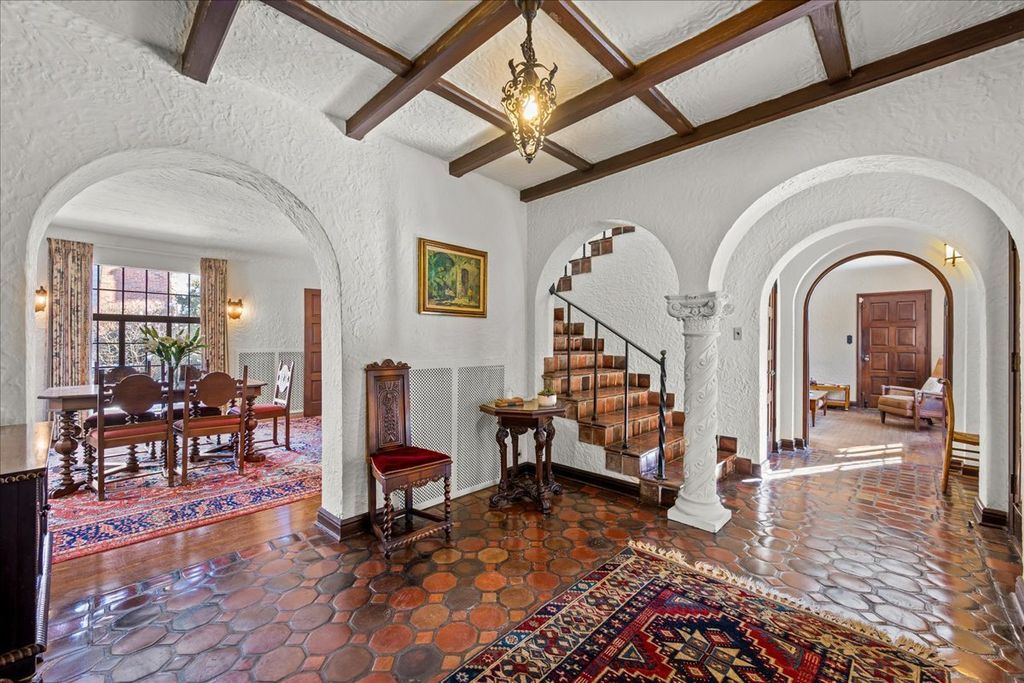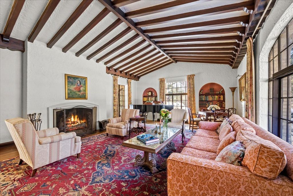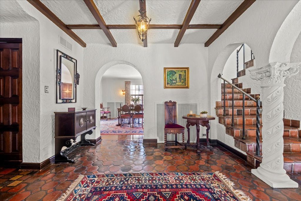 A RARE and highly coveted HALF-ACRE n the heart of East Kenilworth, this architecturally distinctive Spanish Revival residence offers timeless character, scale, and an exceptional setting just steps from Lake Michigan! This is a truly special property...rich in beauty, privacy, and potential. Set back on one of the prettiest and most private lots in town, the home is surrounded by mature trees, creating a serene and storybook backdrop in this prime location. A stately foyer welcomes you with dramatic arches and craftsmanship seldom seen today. The true showstopper is the grand vaulted living room, featuring soaring ceilings, rich wood beams, a massive front window, and a striking limestone fireplace...an unforgettable space suited for large gatherings or nights by the fire. A spacious formal dining room flows into the Butler's Pantry and kitchen. Gorgeous arched wood doors lead to the family room. At the rear of the home, is an enchanting screened-in porch overlooking the lush backyard...perfect for lazy afternoons and summer evenings, soaking up the peaceful surroundings. The first floor also offers an ensuite bedroom. A wide wrought iron staircase ascends to the second level, which hosts three generous bedrooms. The primary suite features an en-suite bath, a Juliet balcony and a dressing area. Another bedroom boasts a picture-perfect balcony overlooking the expansive backyard. 3-car garage. Steps to the beach: award-winning Joseph Sears School, New Trier High School, the Metra and the newly renovated Plaza Del Lago shopping and restaurants. Bring your imagination and vision to restore and elevate this gorgeous home back to its full glory! The house is being sold "ASIS"