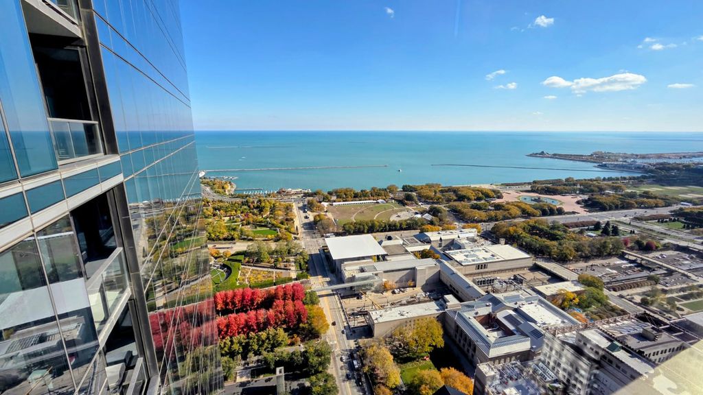 Experience elevated city living in a world-class location, just moments from the lakefront, beach, Millennium Park, premier shopping, dining, museums, parks, and cultural attractions. This spacious 2-bedroom, 2-bath corner residence is flooded with natural light through floor-to-ceiling windows and offers rare, unobstructed tri-directional views. Enjoy direct east-facing views of Lake Michigan and Millennium Park, southern exposure for all-day sunlight, and sweeping west-facing skyline views, including Willis Tower. Located on the 53rd floor of a 72-story high-rise, the home offers exceptional privacy, quiet, and breathtaking views at every hour. A private balcony, finished with interlocking wood deck tiles and a two-seat outdoor bench-provides the perfect setting to relax and take in the scenery. The residence has been thoughtfully upgraded with new hardwood flooring, marble countertops in the kitchen and mud room, a Nest smart thermostat, and custom storage throughout, including a walk-in closet, built-in linen cabinetry, and a dedicated mud room entry. A newer in-unit washer and dryer adds everyday convenience. The unit is fully furnished at no additional cost and has been lightly used as a second home, offering a move-in-ready opportunity in excellent condition. Central HVAC provides year-round comfort and can be controlled remotely via the Nest app. The building delivers top-tier amenities, including a 24-hour doorman, state-of-the-art fitness center, indoor pool, whirlpool, sauna, two sky lounges with outdoor terraces, bike room, dry cleaning services, receiving room, storage lockers, and a building dog run. A 13th-floor sky bridge provides direct access to the University Club of Chicago, offering fine dining, hotel-level service, spa facilities, golf simulators, and squash courts. Ideally situated across from Millennium Park and Grant Park, and just steps from the lakefront, restaurants, shopping, and public transportation, this home also includes a private indoor parking space. This exceptional residence blends luxury, functionality, and panoramic views-consistently impressing guests and offering a tranquil retreat high above the city. Explore the property in 3D! Click the 3D button to take a virtual tour and experience every detail.