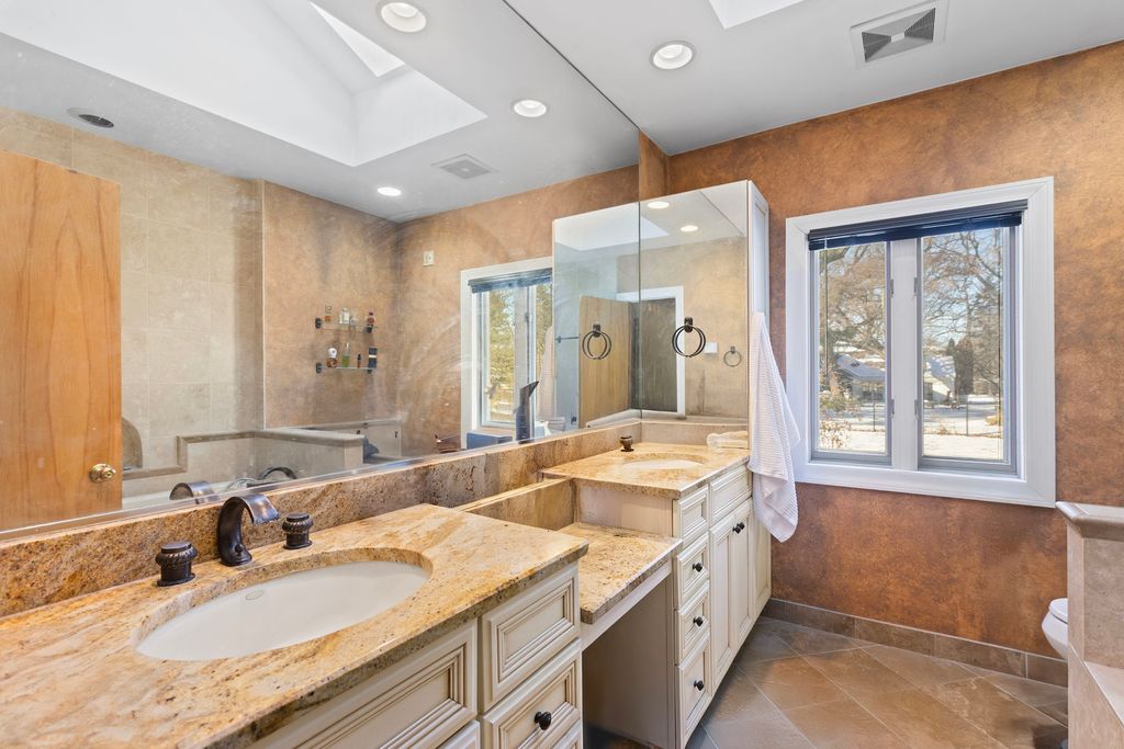 Plum Grove Woodlands reveals a striking architectural design that captivates at every turn, from the stone-clad elevation set on a half-acre parcel to a thoughtfully crafted, light-filled floor plan. Upon entry, an abundance of natural light welcomes you and flows seamlessly into an expansive family room featuring rich hardwood floors, walls of windows, and a dramatic stone fireplace that anchors the space while opening effortlessly to a generously sized dining area. The dining area offers panoramic views of the front yard, ample space for entertaining gatherings of any size, and convenient access to the adjacent eat-in kitchen. The kitchen is finished with crisp white cabinetry, neutral countertops, and a bright, airy aesthetic that feels both timeless and on-trend. Down an exceptionally wide hallway-carpeted over beautiful hardwood floors-you'll find three generously sized bedrooms and two full bathrooms. One is a stylish hall bath with a single vanity and shower, while the second, situated between two bedrooms, is enhanced with dual vanities, granite finishes, and a separate soaking tub. The main level also includes a shared den and laundry room, plus a functional breezeway connecting the garage to the home-perfect as a locker or drop zone for shoes and coats. The fully finished lower level expands your living space with a recreation area, media zone, additional fireplace, and multiple storage rooms. Additional highlights include a 2.5-car attached garage and a serene backyard ideal for entertaining, complete with a brick patio and hot tub. Ideally located near shopping, dining, entertainment, and major highways, all within the highly sought-after Fremd School District.