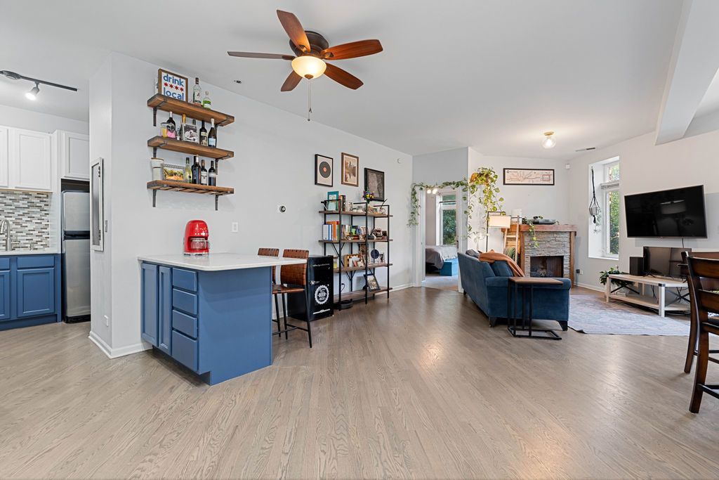 Bright and spacious 2-bedroom, 2-bath condo ideally situated in the heart of Logan Square. The open-concept layout offers an excellent flow for hosting and everyday living. The recently refreshed kitchen showcases quartz countertops, large island with breakfast bar seating, glass tile backsplash, 42-inch cherry cabinetry, and stainless steel appliances. Additional highlights include hardwood flooring in the living area, in-unit laundry, central heating and cooling, custom closet systems, and a stylish fireplace enhanced by a stone surround and wood mantel. The desirable split-bedroom design is wrapped in windows, flooding the home with abundant natural light, and sits on a peaceful, tree-lined street. Unbeatable walkable location near the Blue Line, the 606 Trail, Armitage Street, and a fantastic mix of shops, cafes, and restaurants. One garage parking space plus a storage cage are included.