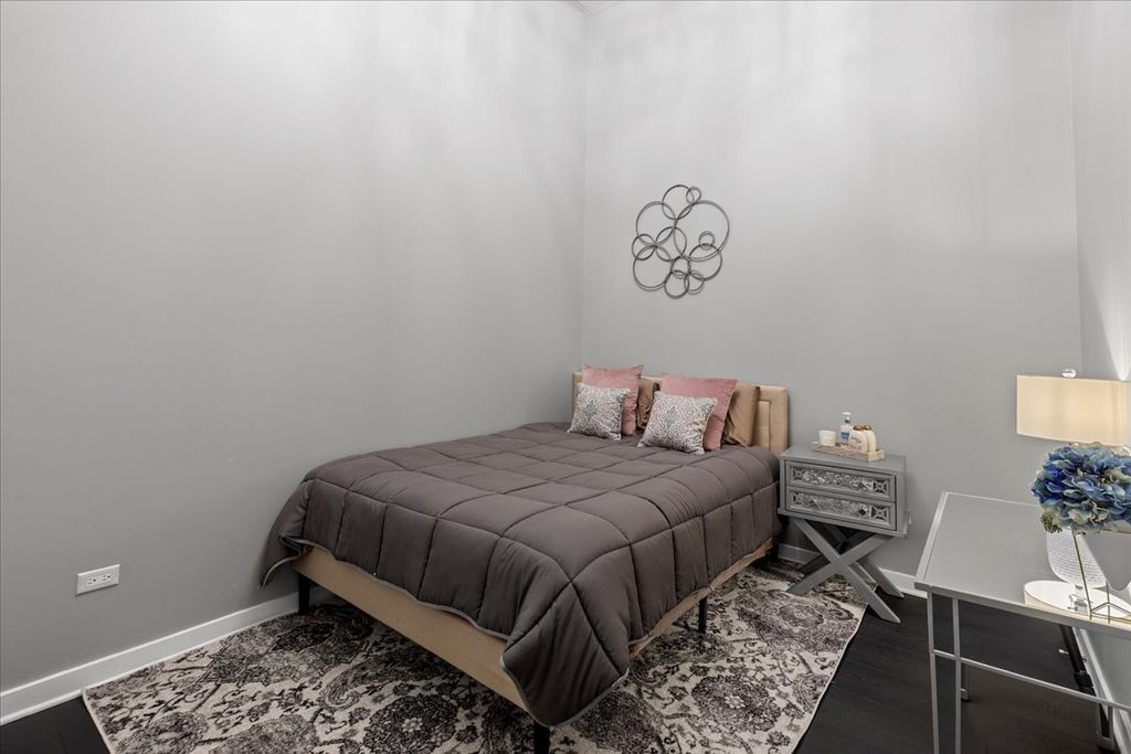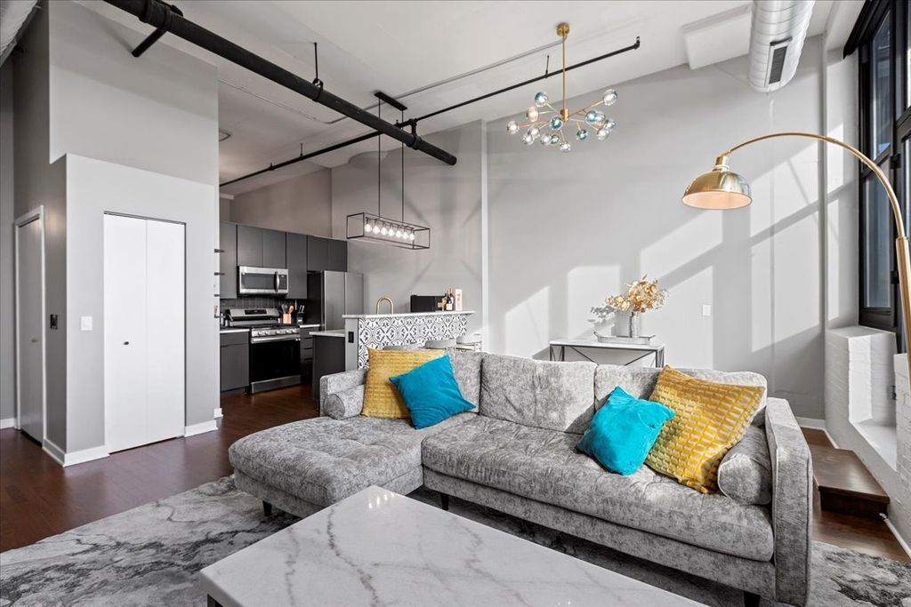 Come see this stunningly renovated condo loft in the heart of the West Loop. This 2-bedroom, 1.1-bath home features soaring ceilings, massive south-facing windows, and hardwood flooring throughout, filling the space with incredible natural light. The modern kitchen offers sleek charcoal cabinetry, a stylish backsplash, white quartz countertops, stainless steel appliances, and a gooseneck faucet, complemented by new lighting throughout the unit. The spacious primary bedroom includes an ensuite bath with a contemporary double vanity, glass shower enclosure, and designer mirrors and light fixtures. A chic half bath for guests features beautiful wallpaper and patterned flooring. Step outside to your south-facing private balcony, where you'll enjoy sunlight all day. Additional highlights include in-unit washer/dryer and central heat and air. The home is located in a full-amenity elevator building with door staff, rooftop deck, fitness center, business center, and yoga room. Unbeatable West Loop location just steps from the Blue Line, easy access to I-290, and only one block from Target. Nearby parks include Skinner Park and Bartelme Park, with grocery options such as Whole Foods, Wild Fork, and Mariano's close by. Enjoy world-class dining, shopping, and everything the West Loop has to offer. 1 storage cage included. Heated Garage Parking additional $25,000.
