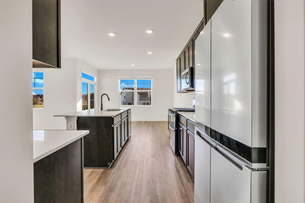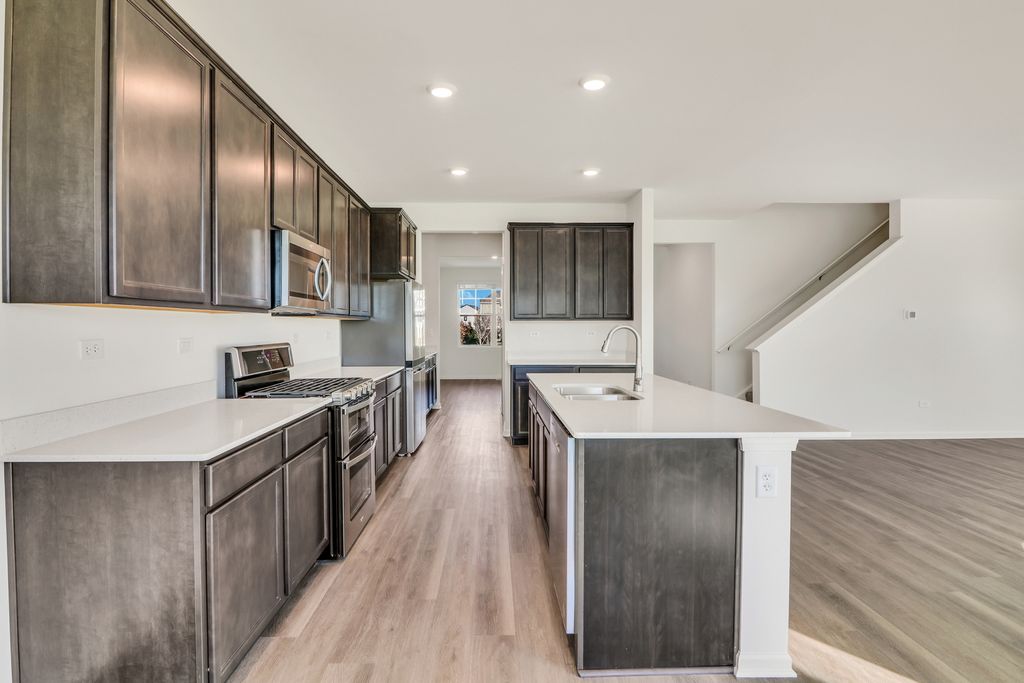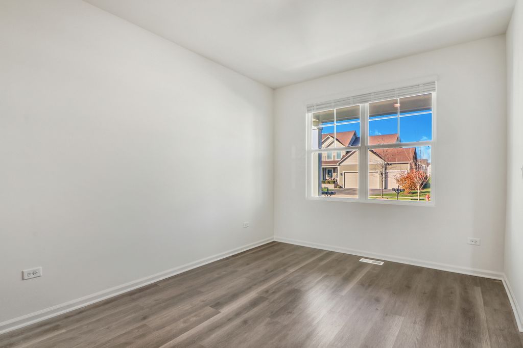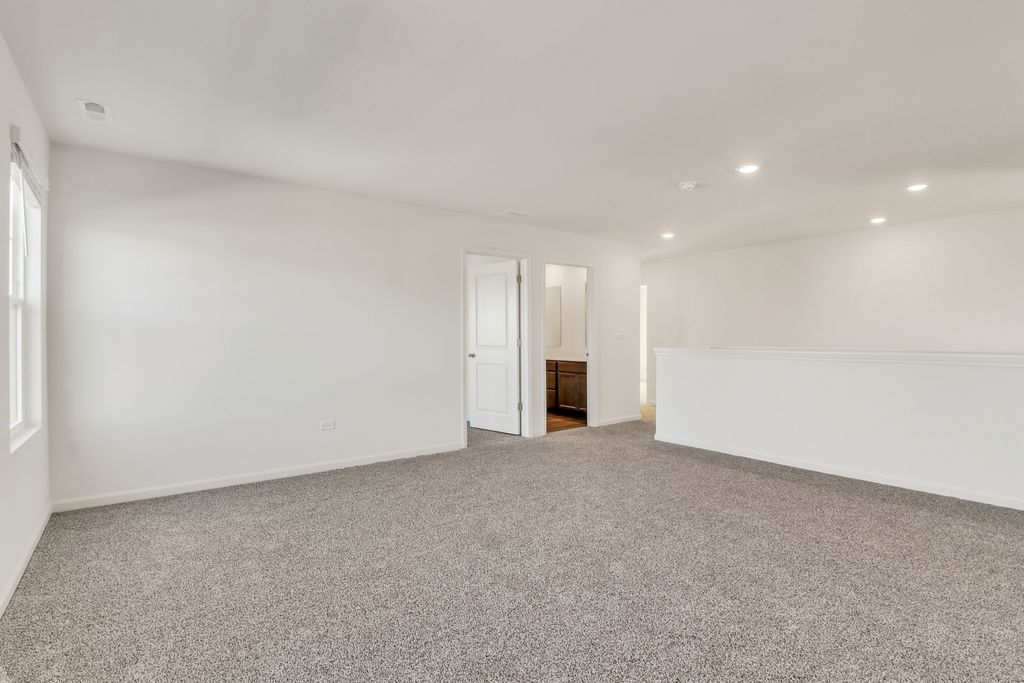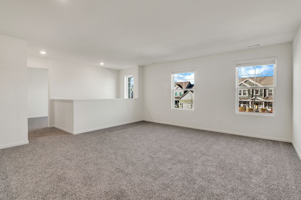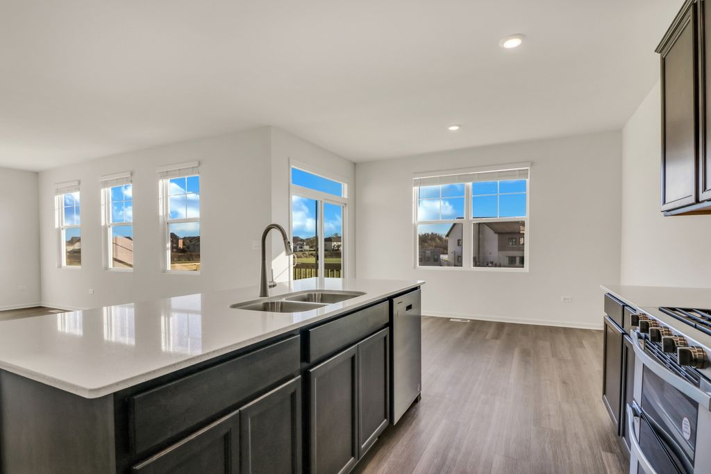 Envision yourself at 1235 Tiger Lily Dr, Bartlett Illinois, a beautiful new home in our Grasslands Community. This 2-story single family home will be ready for a Spring move-in! This large, scenic homesite includes a fully sodded yard and beautiful landscaping. This Emerson plan offers 3,044 square feet of living space, offering 5 bedrooms, 3 full baths, a loft, 9-foot ceilings, and so much more. Entertaining will be easy in this open-concept kitchen and family room layout with a large island with an overhang for stools, 42-inch designer cabinetry with soft close drawers and crown molding. Additionally, the kitchen features a walk-in pantry, modern stainless-steel appliances, quartz countertops, and easy-to-maintain luxury vinyl plank flooring. Enjoy your private getaway with your large primary bedroom and en suite bathroom with a raised height dual sink, quartz top vanity, and walk-in shower with fiberglass surround and glass shower doors. Convenient walk-in laundry room, 4 additional bedrooms with a full second bath and a linen closet. All D.R. Horton Chicago homes include our America's Smart Home Technology, featuring a smart video doorbell, smart Honeywell thermostat, smart door lock, Deako smart light switches and more. Photos are of similar home and model home. Actual home built may vary.