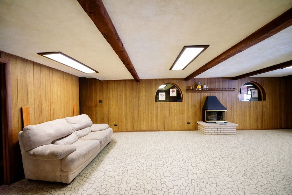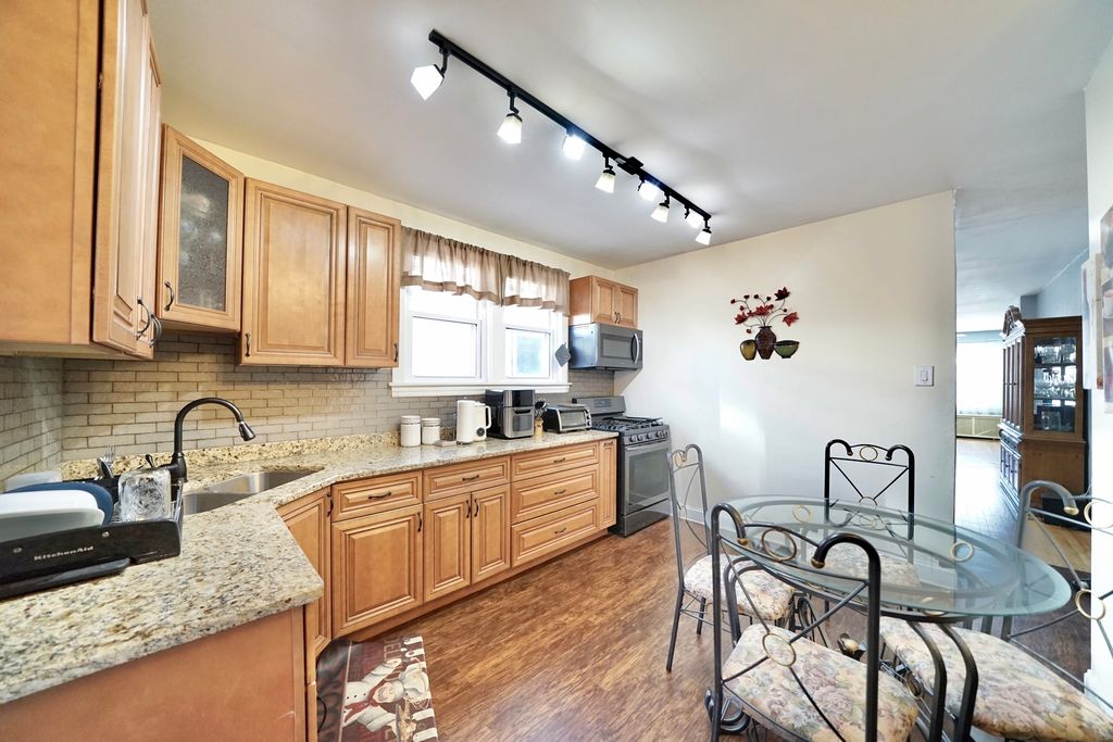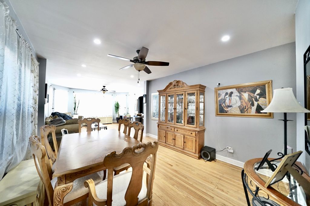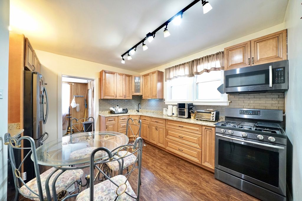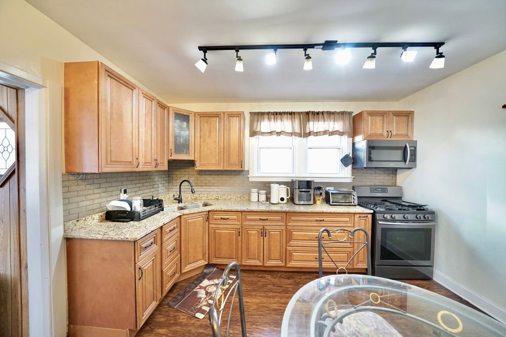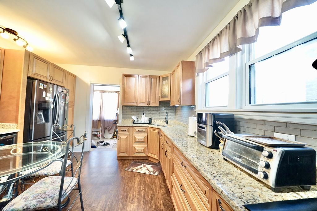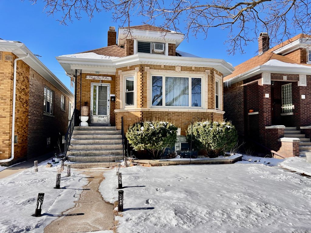 Solid brick octagon bungalow located on a quiet side street in Elmwood Park. The 1st floor offers a separate living and dining room with hardwood floors throughout, 2 bedrooms, a full bath, and a maple kitchen with granite countertops and stainless steel appliances, leading to an enclosed porch and backyard. The 2nd floor features a 3rd bedroom with potential for a 4th. The full, partially finished basement includes a spacious family room, bar area, workshop, laundry, and an additional full bathroom. The home has great potential and is being sold as-is, ideal for buyers looking to add value with some TLC. Conveniently located near shopping, transportation, and schools. Newer roof and windows.
