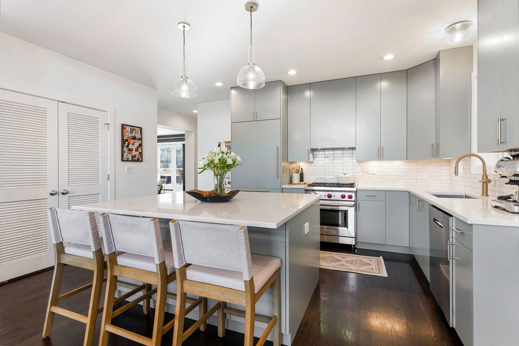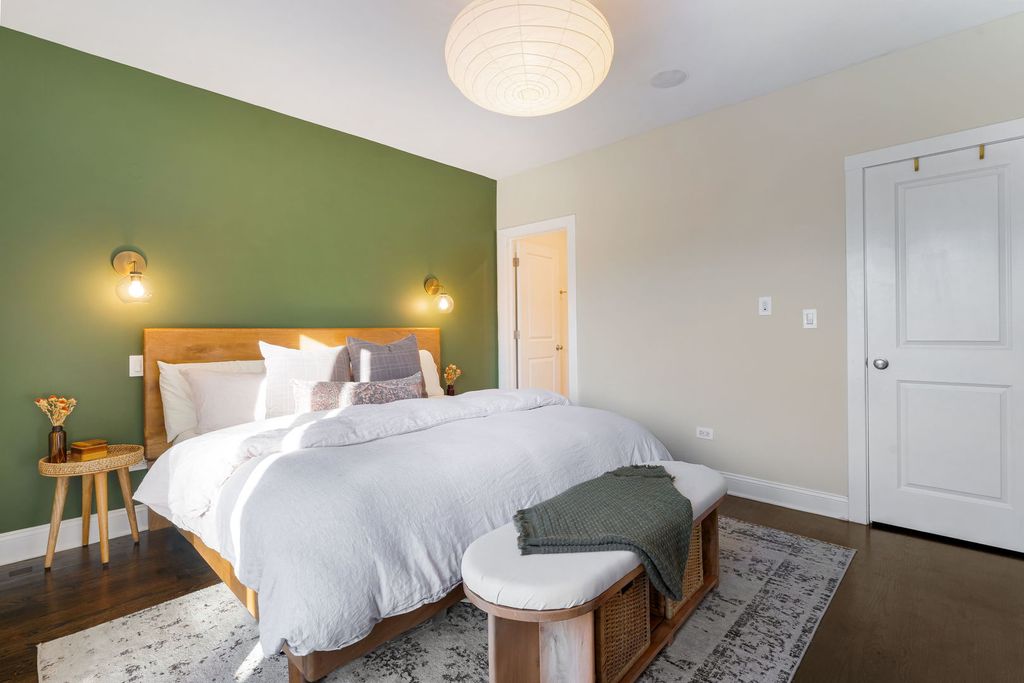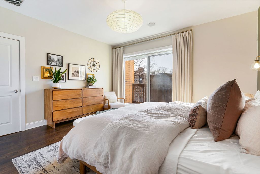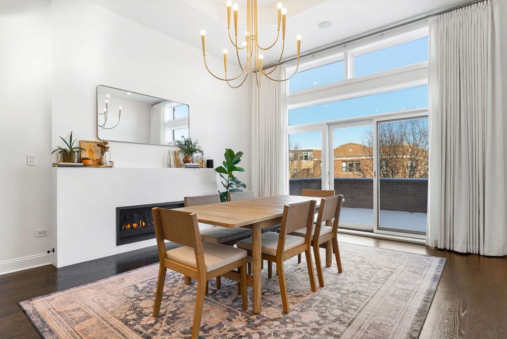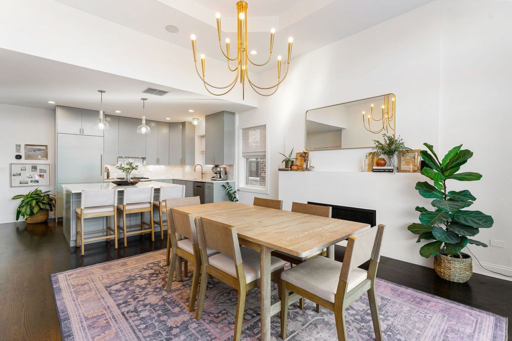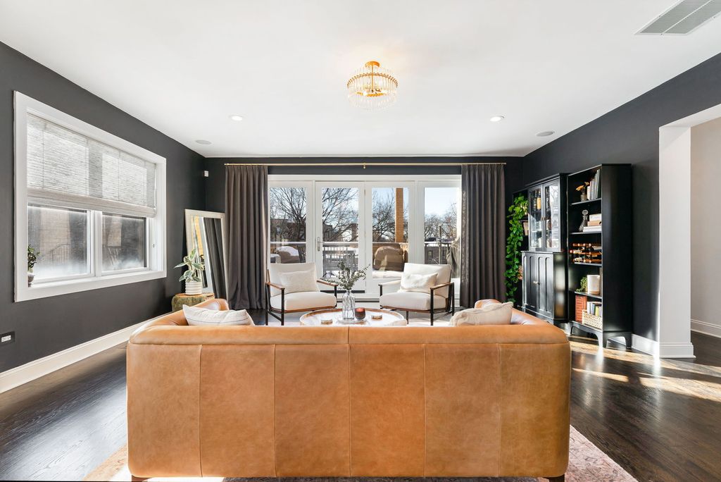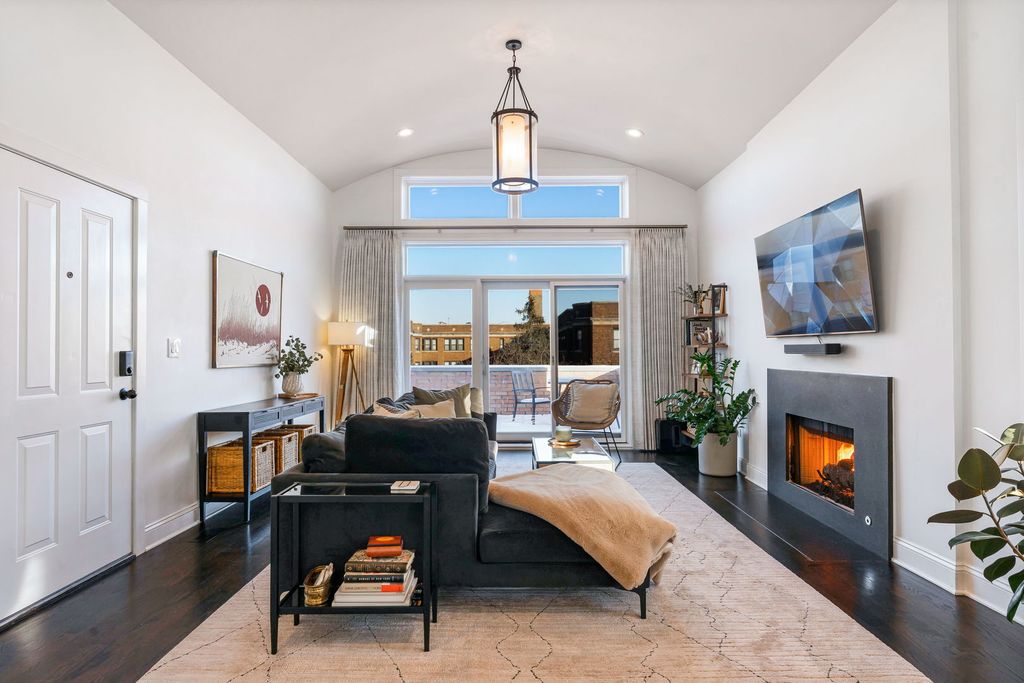 Palacious penthouse in Ravenswood with stunning style. Masterfully remodeled to incorporate first-class fixtures & finishes throughout. This 2,200-square-foot condo encompasses the building's entire top floor. Home boasts an abundance of natural light, & features three spectacular private outdoor spaces. Excellent for entertaining and everyday living, the home's unique layout begins with a large living room that flaunts a high barreled ceiling, espresso-hued hardwood floors, wood-burning fireplace fitted with gas logs. Sliding glass doors link to a 37' x 8' front terrace that extends the full width of the building & gives views of the city. The family room can accommodate a large coffee table, sitting area, & bar. Connect with the outside world with privacy. The 17' x 27' back deck with defined outdoor dining and lounge spaces calls to the entertainer. Back inside, the chef's kitchen stuns with custom cabinetry, a ceramic tile backsplash, white natural stone countertops, professional Wolf/Liebherr appliances, coordinating brass fixtures/ hardware, & a sizable island with seating for three. The kitchen opens onto a light-filled dining room with yet another fireplace (this one recently converted to direct vent gas), an octagon-shaped cove ceiling, custom built-ins, floor-to-ceiling windows, and a second point of access to the front terrace. The first of two handsome bedrooms features custom closet & access to a full bath. Spacious primary bedroom reveals more natural light, a private 8' x 4' balcony, a deluxe walk-in closet with custom clothing storage, and a chic ensuite bath with dual vanity, beautiful tilework, heated floors, & walk-in shower. Additional callout details include hardwood floors and designer light fixtures throughout, custom window treatments, excellent storage, stacked hallway laundry, a large common backyard, & two parking spaces (one garage space & one tandem outdoor space). New roof & new HVAC keep you warm & dry. 2nd living space could easily be transformed into a massive 3rd bedroom for those looking to grow by adding an entry door to kitchen. A short stroll to Chase Park with proximity to amazing dining, shopping, & entertainment options in nearby Lincoln Square & Andersonville. Not to mention, easy access to multiple CTA lines, bus routes, & the Metra, the penthouse at 4622 N. Ashland Ave, is turnkey, one-of-a-kind living on Chicago's happening North Side. Welcome home!