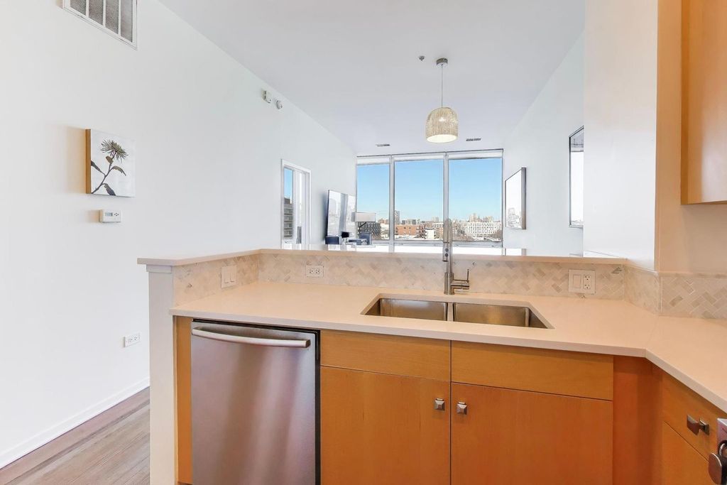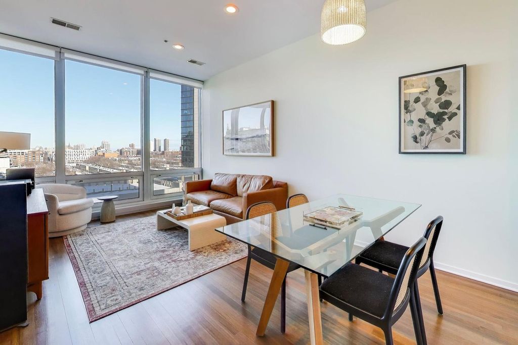 Premier 2 bed/1.1 bath condo in River North's highly sought after Montgomery. This home has been lived in delicately. Gleaming refinished hardwood floors throughout, refreshed lighting, & window treatments. Light abounds through the floor-to-ceiling windows. Masterful kitchen update with Bosch/Kitchen-Aid/Jenn-Air appliances, white quartz counters, marble backsplash custom builtin wine rack and additional storage cabinets. A primary suite with two customized closets and proper marble bathroom. Scaled vanity, linen closet and soaking tub. A second bedroom that is the perfect work from home space, den/ nursery or guests suite with custom built-ins. The Montgomery is a full-service amenity building w/24-hour door-staff, on-site management, state-of-the-art gym, in-unit package delivery service, dry-cleaner, rear patio w/fire pits & grilling stations, private dog run, & roof top deck, with incredible views of the city and an herb garden In-unit laundry and an additional storage locker included.Deeded parking is an additional $35k.
