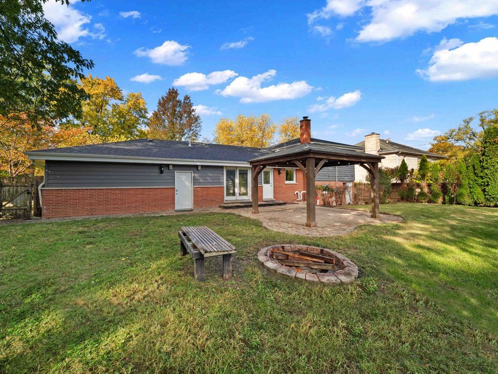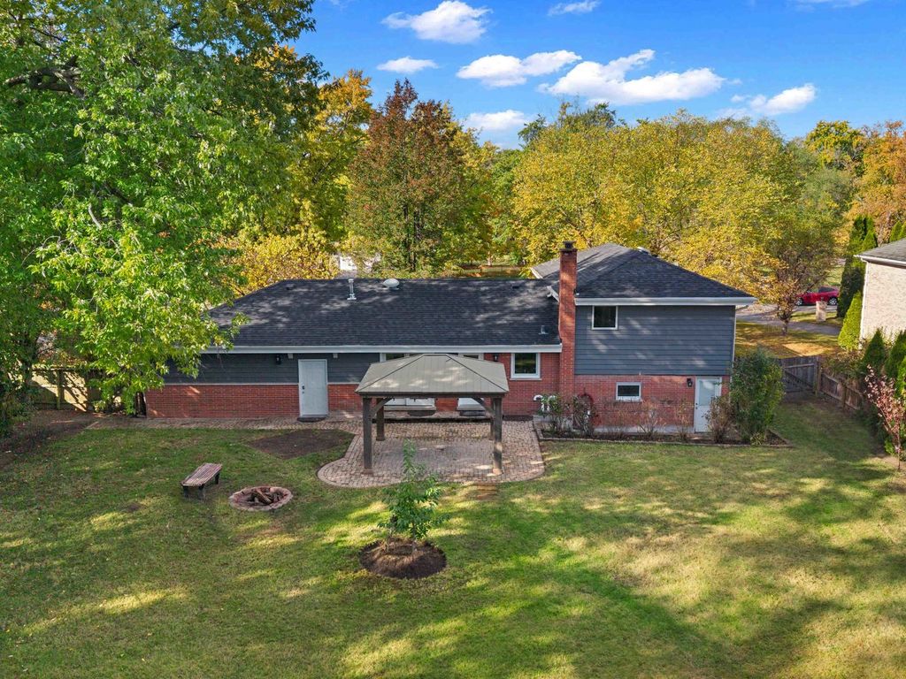 Set on nearly half an acre, this inviting split-level offers a rare combination of space, light, and everyday functionality. Sun-filled living and dining rooms feature hardwood floors and seamless indoor-outdoor flow through sliding glass doors that open to a brick paver patio and expansive backyard-well suited for entertaining or relaxed daily living. The kitchen is thoughtfully designed with granite countertops, travertine backsplash, ample cabinetry, and direct access to the yard. The second level hosts three well-proportioned bedrooms with hardwood flooring and generous closet space, complemented by a hall bath finished in granite tile with classic, clean-lined fixtures. The lower level adds versatility with a comfortable family room featuring built-in shelving and a media setup, along with a full bath and dedicated laundry room. A basement level provides excellent storage and mechanical space. Outdoors, the nearly half-acre setting offers exceptional green space with a brick paver patio, gazebo, and play area, while a heated garage adds year-round convenience. Recent improvements including roof, siding, and gutters enhance peace of mind, making this a well-maintained residence with a balanced blend of indoor comfort and outdoor enjoyment.