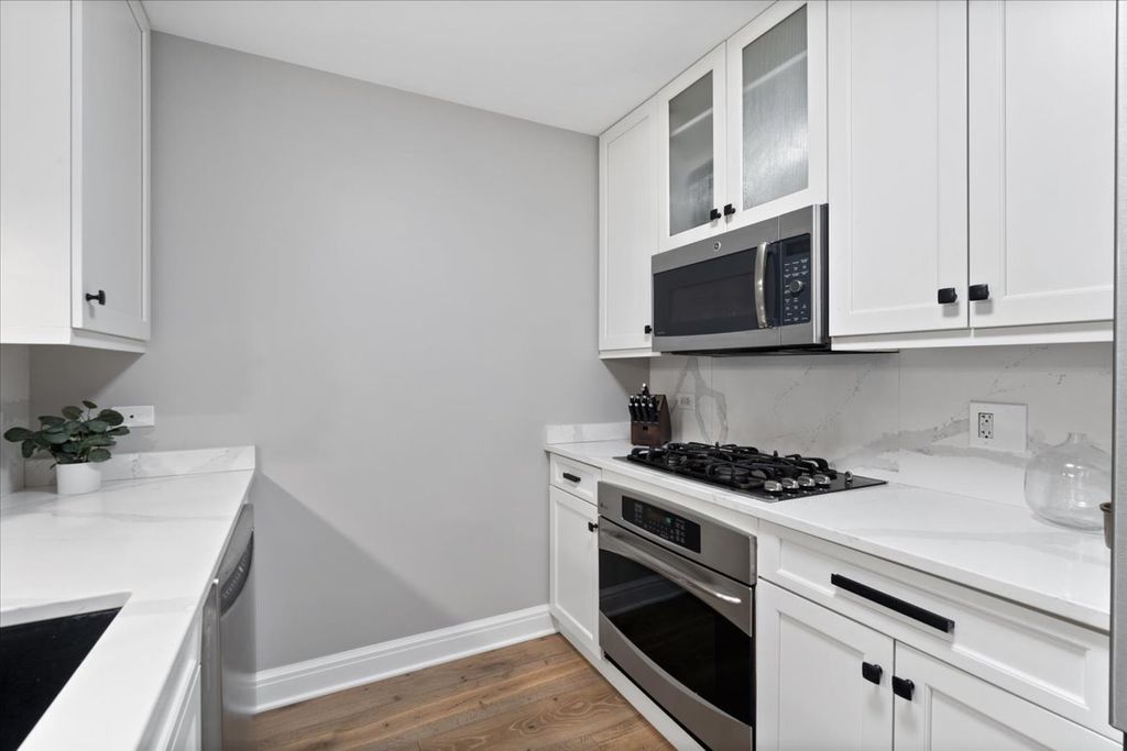 Gut rehab in 2025! This beautifully updated one-bedroom residence features a private outdoor terrace, making it perfect for pet owners, city dwellers, or anyone who enjoys ample green space. Experience the tranquility of outdoor living with stunning views of Lake Michigan and Navy Pier. Renovated in 2025, it includes new quartz countertops, a single bowl sink, freshly painted white cabinetry, new paint throughout, and 10-inch pre-engineered hardwood flooring. The custom bathroom is equipped with floating double bowl vanities, floor-to-ceiling custom marble, a shower with a new shower head, a custom mirror, and stylish lighting, along with an electric blackout shade in the bedroom. The warm-toned hardwood flooring extends through the living/dining area and bedroom, complemented by custom window treatments and professionally landscaped terrace views from the kitchen, living room, and bedroom. The kitchen features an eat-in bar, new quartz countertops with a full backsplash, stainless-steel appliances, and white custom cabinetry with new pulls. Retreat to the spacious master suite, which includes a large custom-built walk-in closet, new 10-inch pre-engineered wood floors, and an electric blackout shade. This terrace residence is one of only seven in the entire building, offering outdoor privacy enhanced by the parapet wall and lush landscaping.