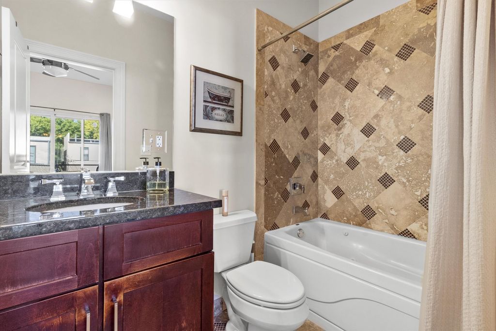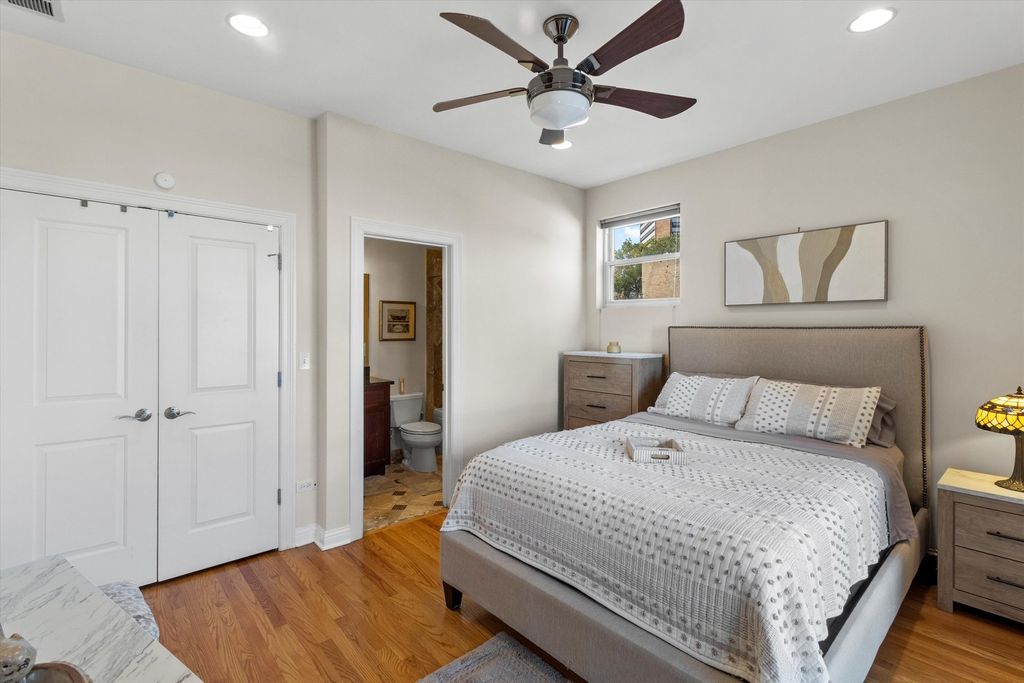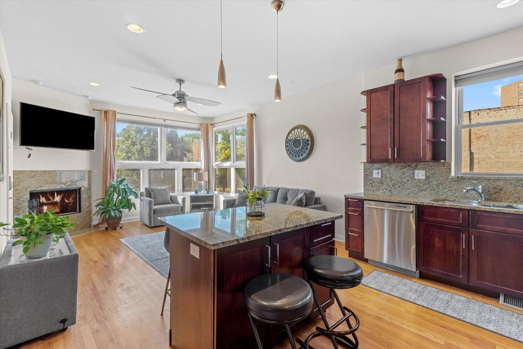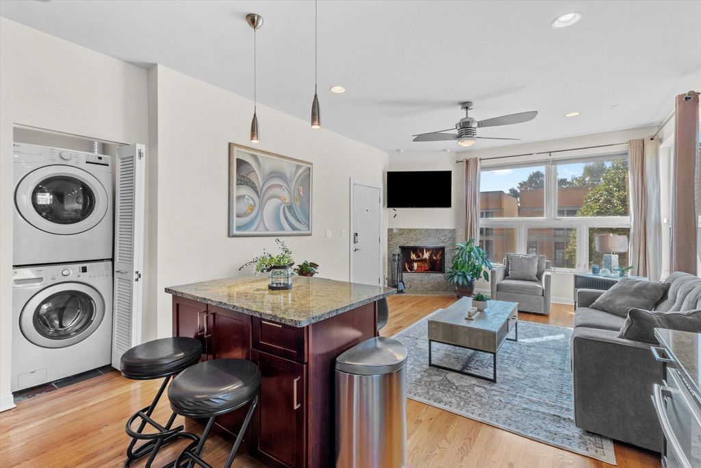 Step into modern luxury with this beautifully maintained Bronzeville condo designed to elevate everyday living. Enjoy a spacious living room that is illuminated by natural light and features stunning hardwood floors and a gas fireplace. The chef's kitchen is outfitted with stainless steel appliances, 42" cabinets, and granite countertops. Three well-proportioned bedrooms with ample closet space and additional storage throughout the unit. This home also features designer lighting, an in-unit washer and dryer, and a designated parking space. Relish your morning coffee on the expansive back deck. Don't miss out on making this home, which offers a seamless blend of comfort and elegance, yours today!